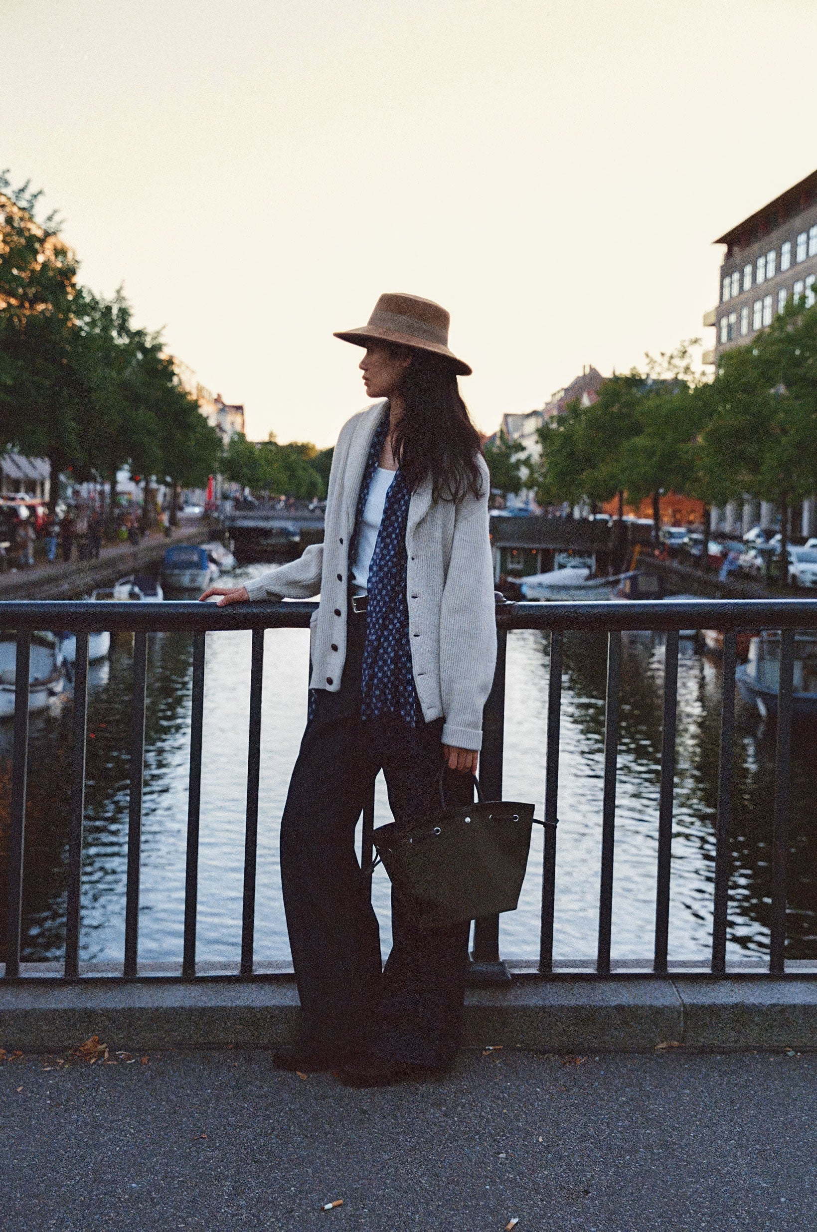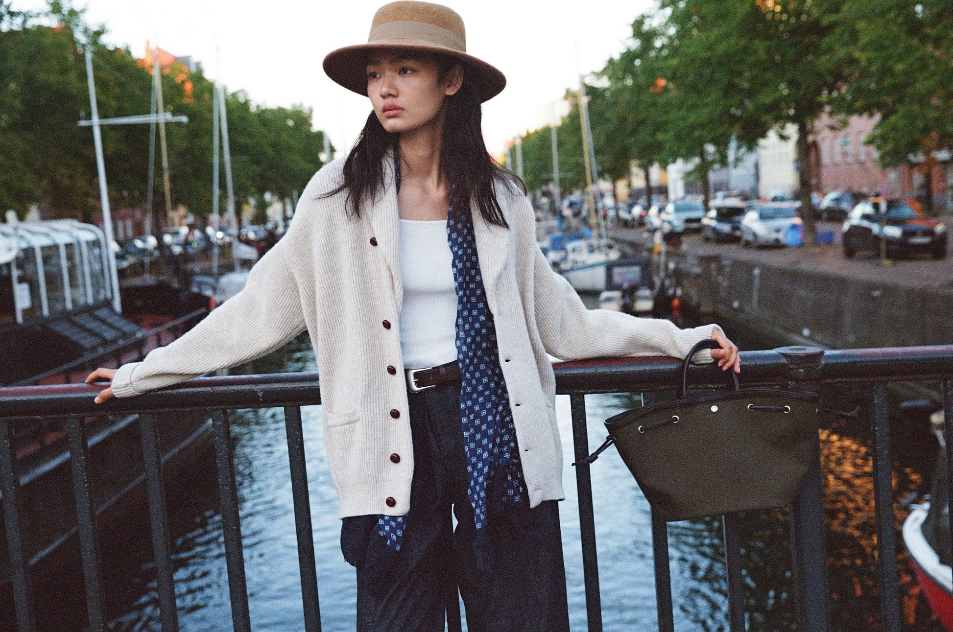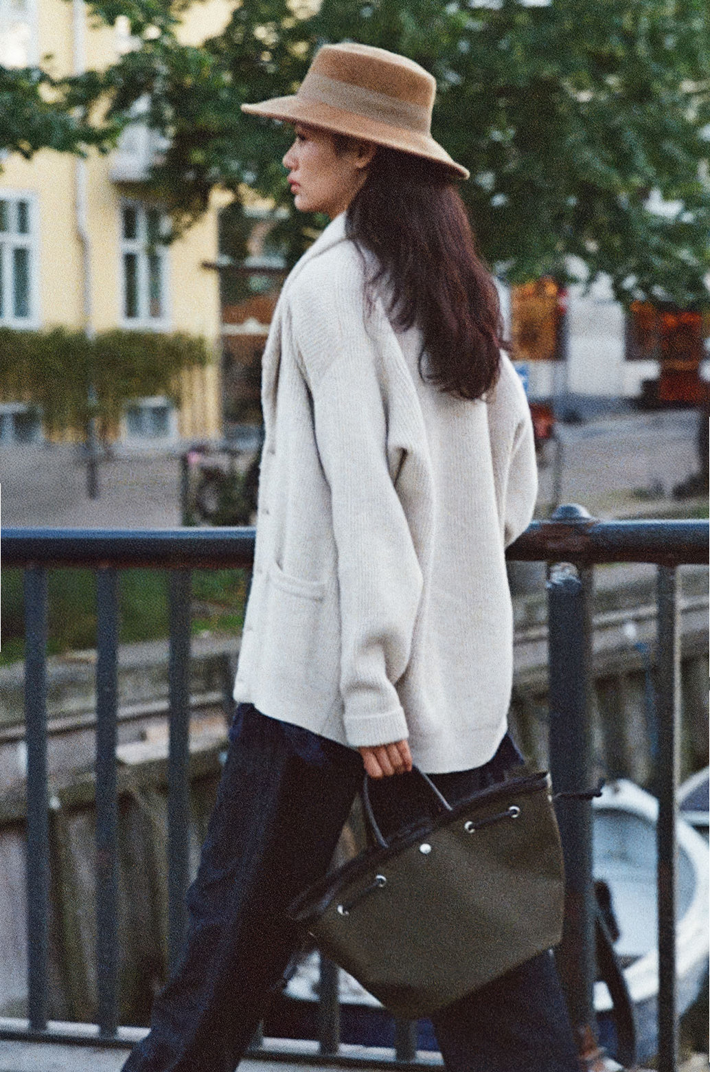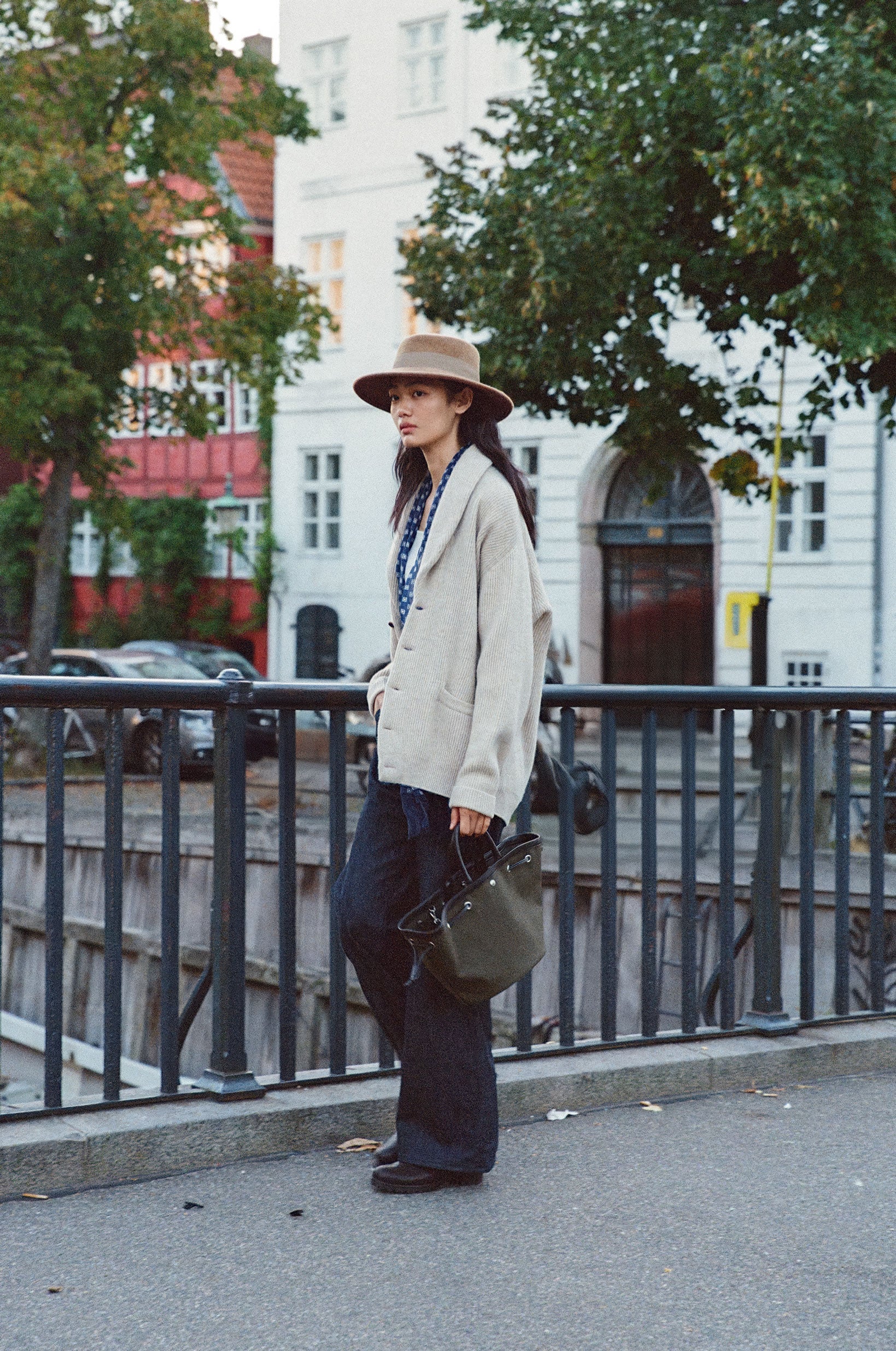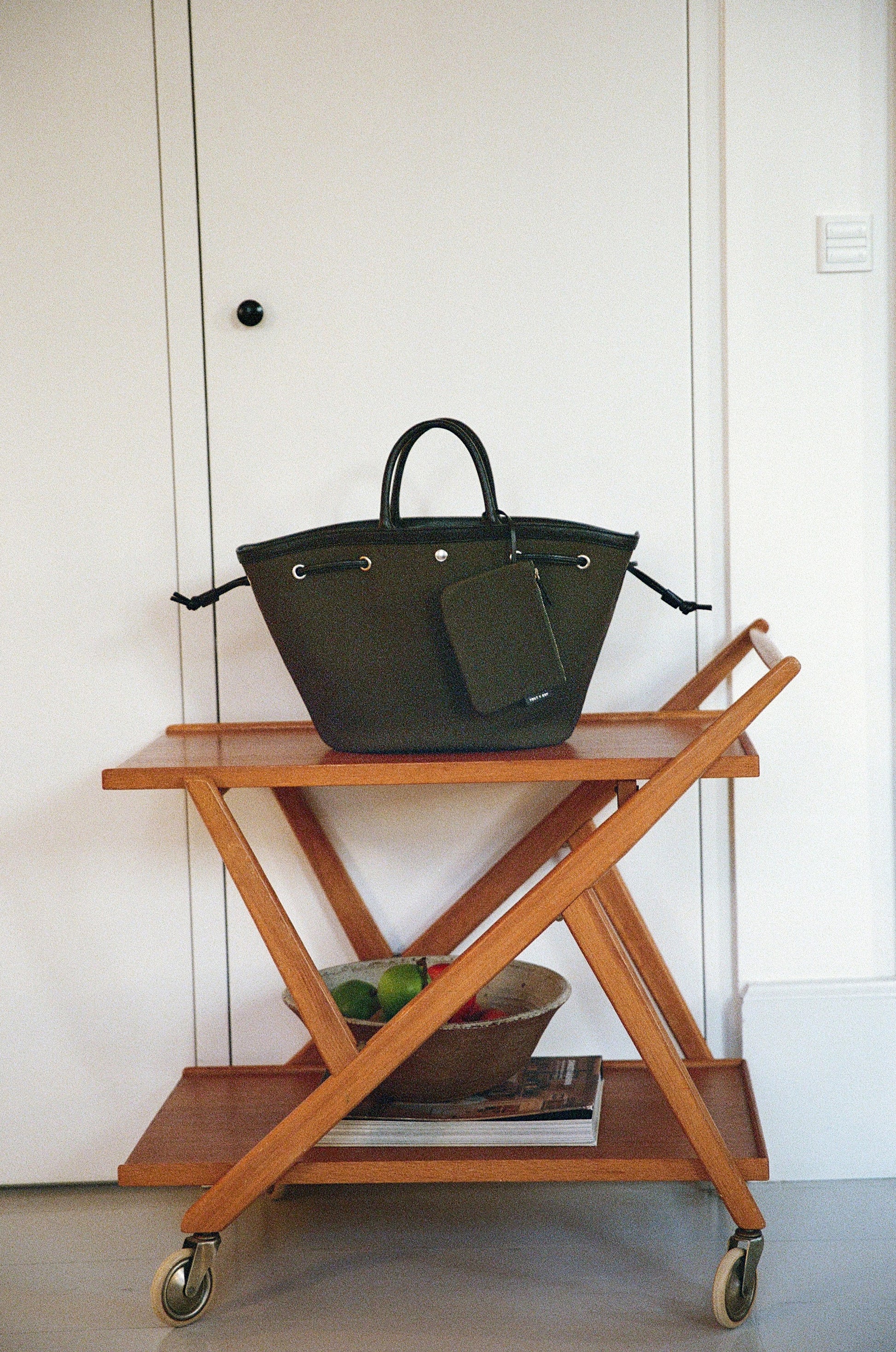 This shopper bag is crafted by combining soft sheepskin with cotton canvas material. Named "COQUILLE," which means "shell" in French, it embodies the feature of a bag that can be freely shaped using the leather string at the top. When carrying many belongings, you can spread it wide to form the shape of a shopper bag, or you can tighten the string to use it as a bucket bag. There's a snap in the center with the logo embossed, allowing for secure closure. Additionally, it comes with a detachable pouch, making it convenient to store small essentials that are frequently needed. The soft and round strap provides a comfortable grip even when the bag is filled with many items, while the sturdy sheepskin bottom provides stability to the bag.