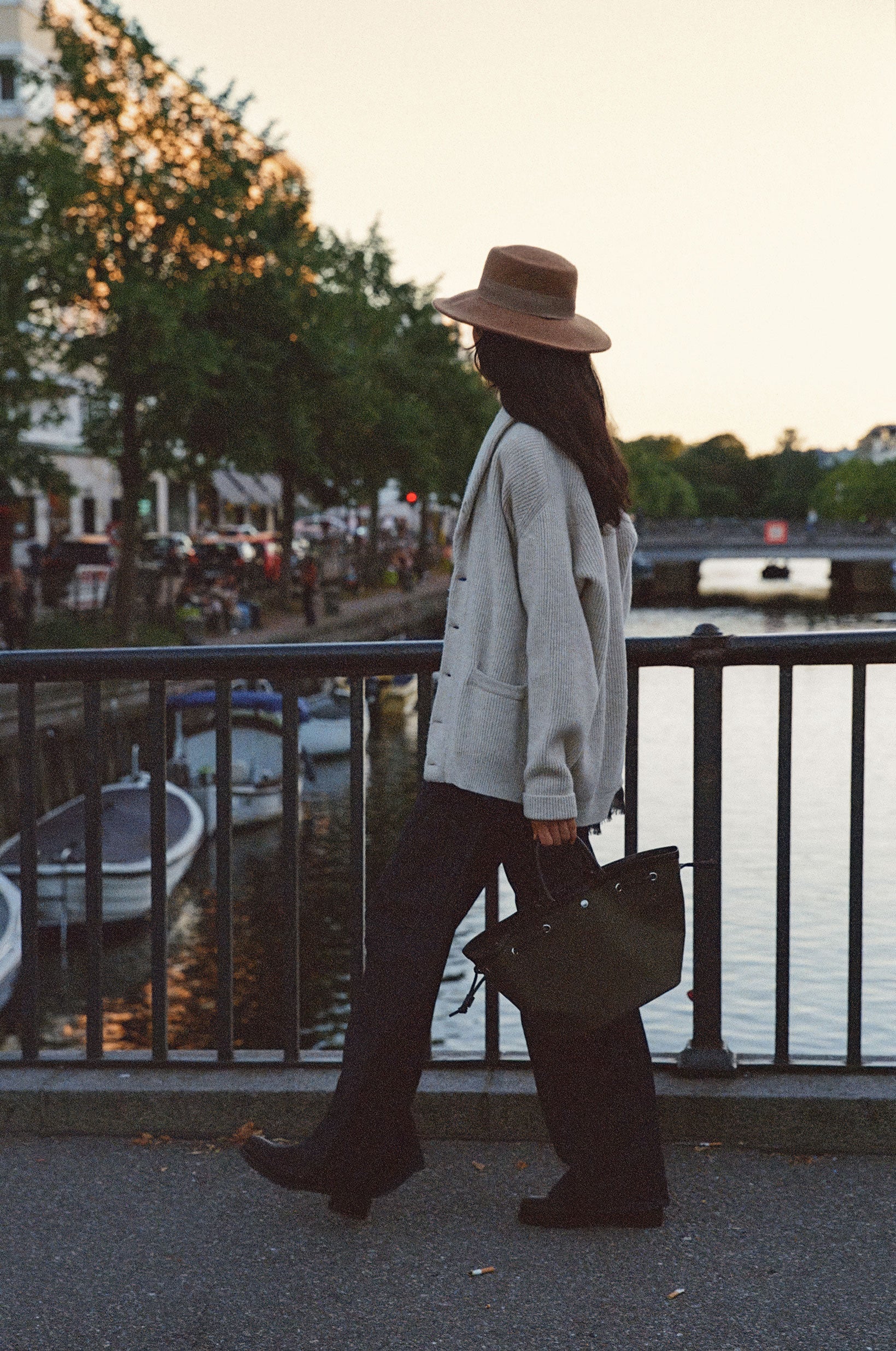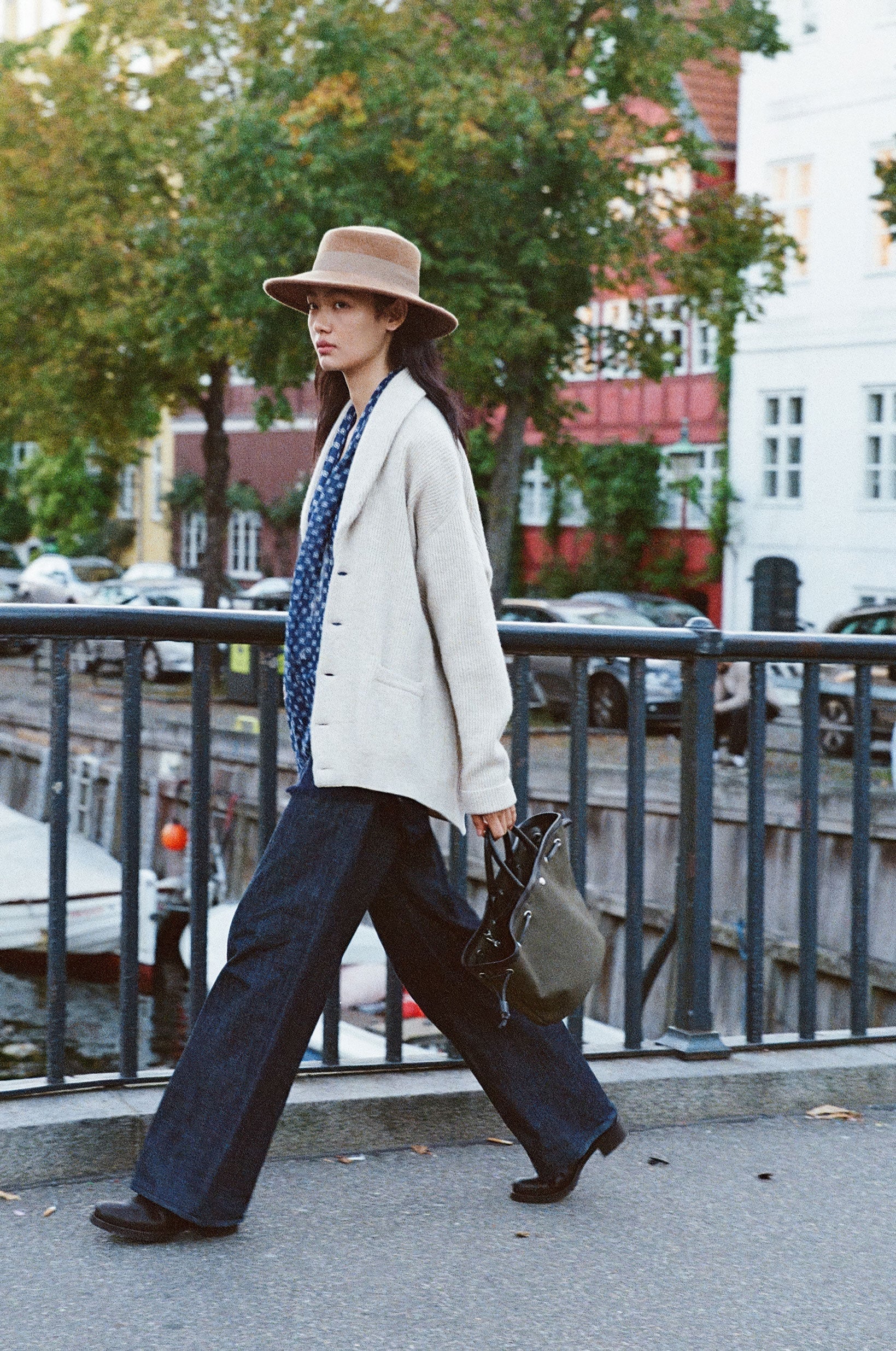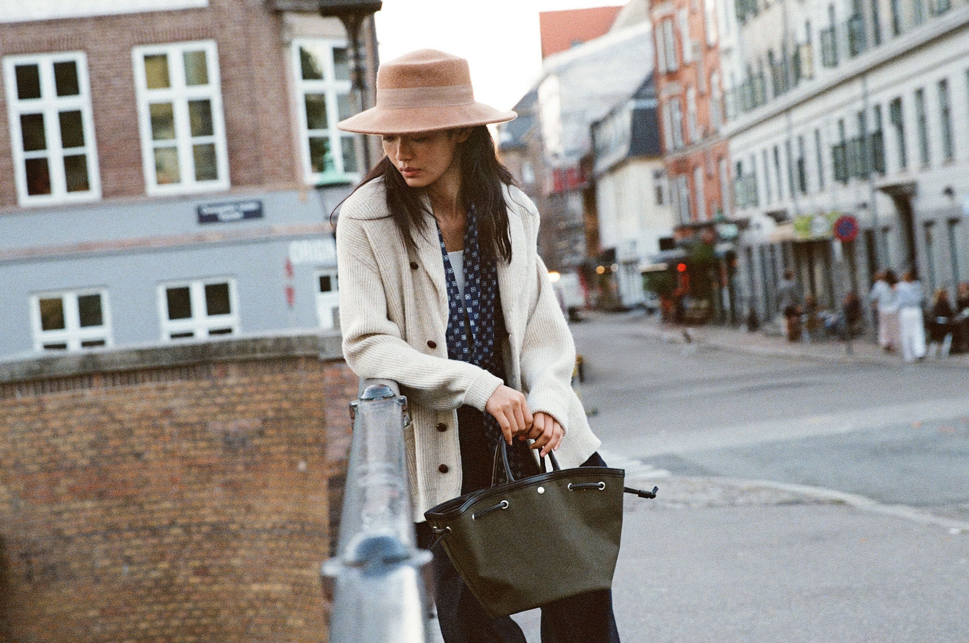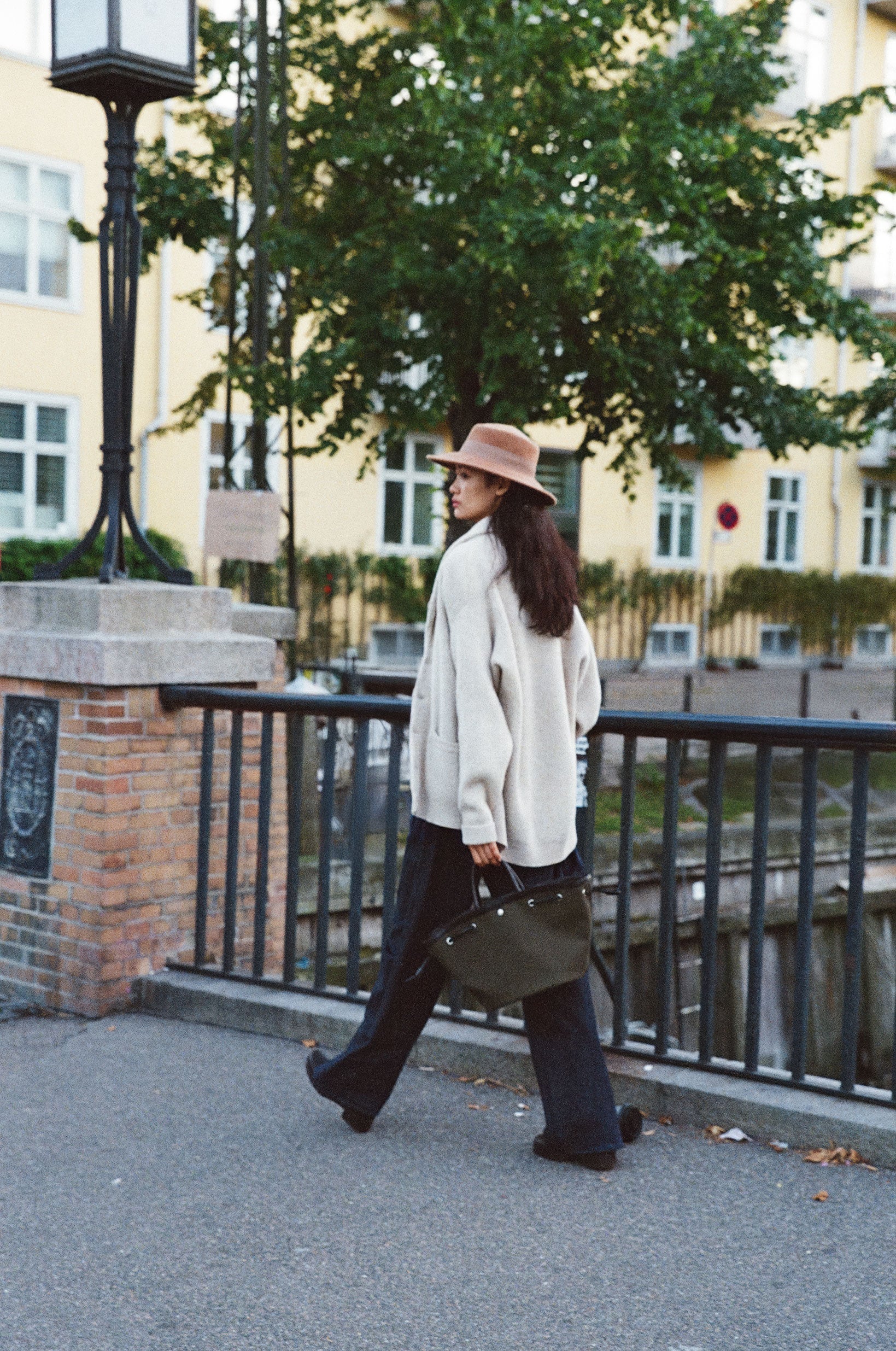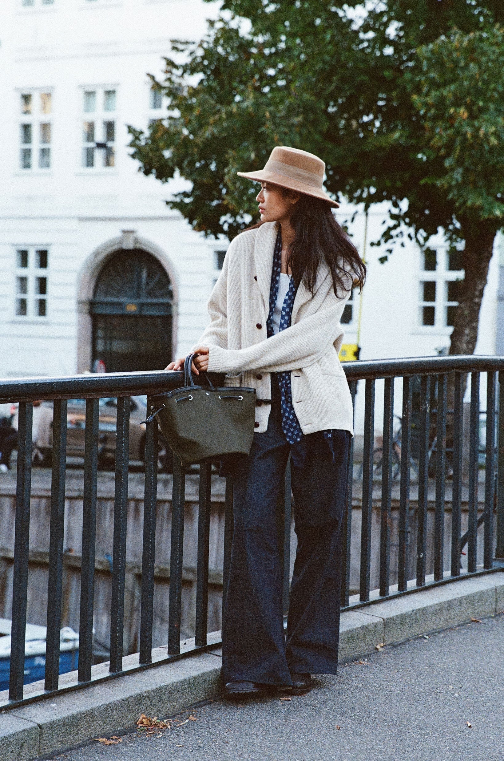 This shopper bag is crafted by combining soft sheepskin with cotton canvas material. Named "COQUILLE," which means "shell" in French, it embodies the feature of a bag that can be freely shaped using the leather string at the top. When carrying many belongings, you can spread it wide to form the shape of a shopper bag, or you can tighten the string to use it as a bucket bag. There's a snap in the center with the logo embossed, allowing for secure closure. Additionally, it comes with a detachable pouch, making it convenient to store small essentials that are frequently needed. The soft and round strap provides a comfortable grip even when the bag is filled with many items, while the sturdy sheepskin bottom provides stability to the bag.
