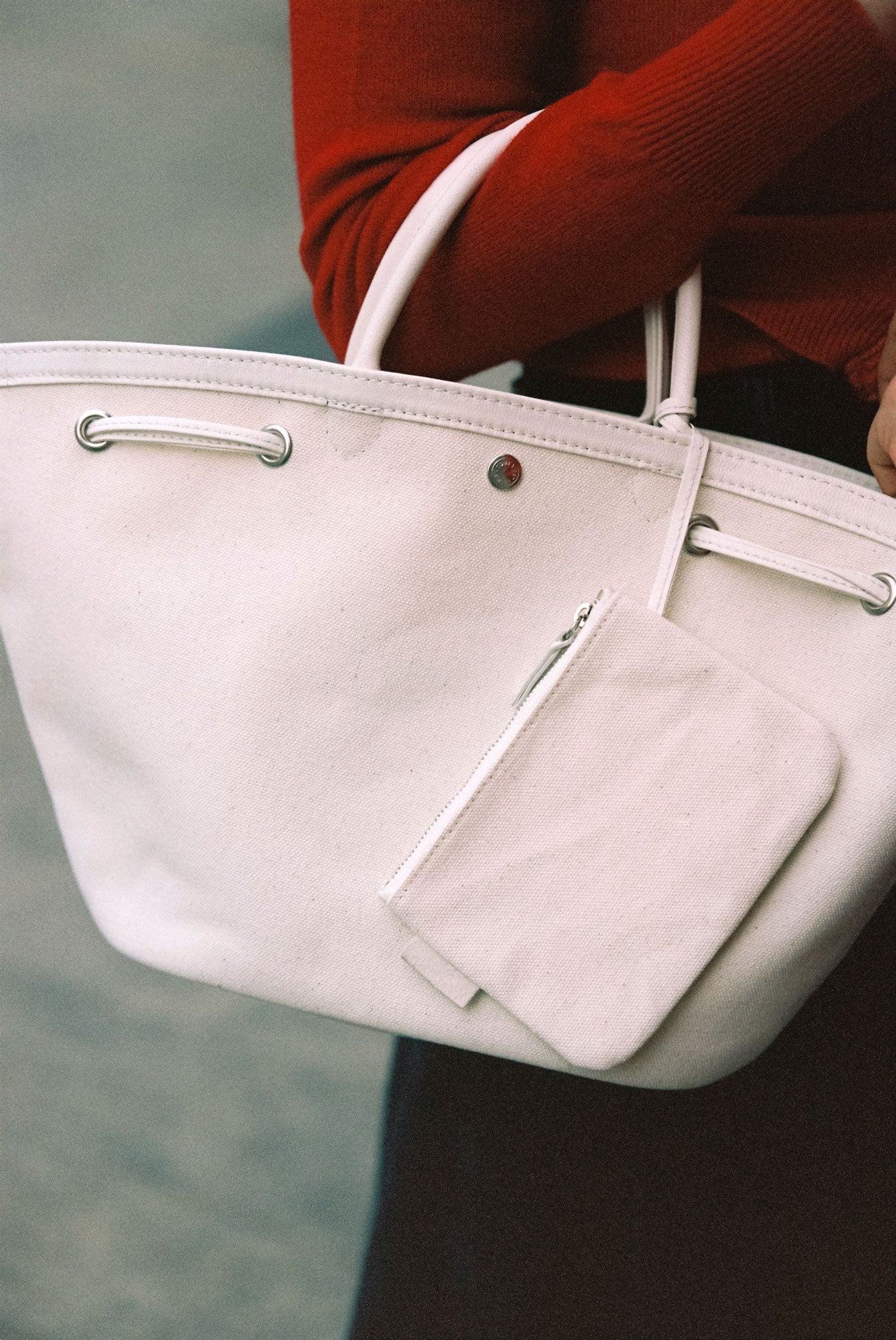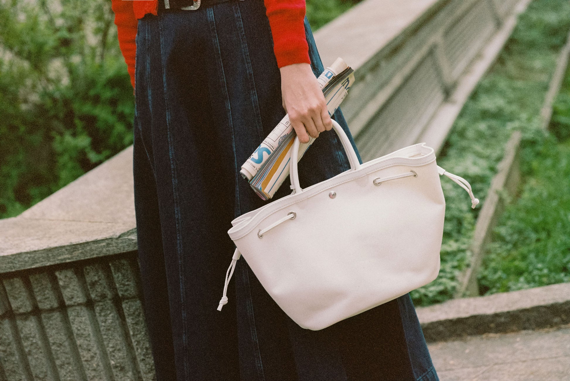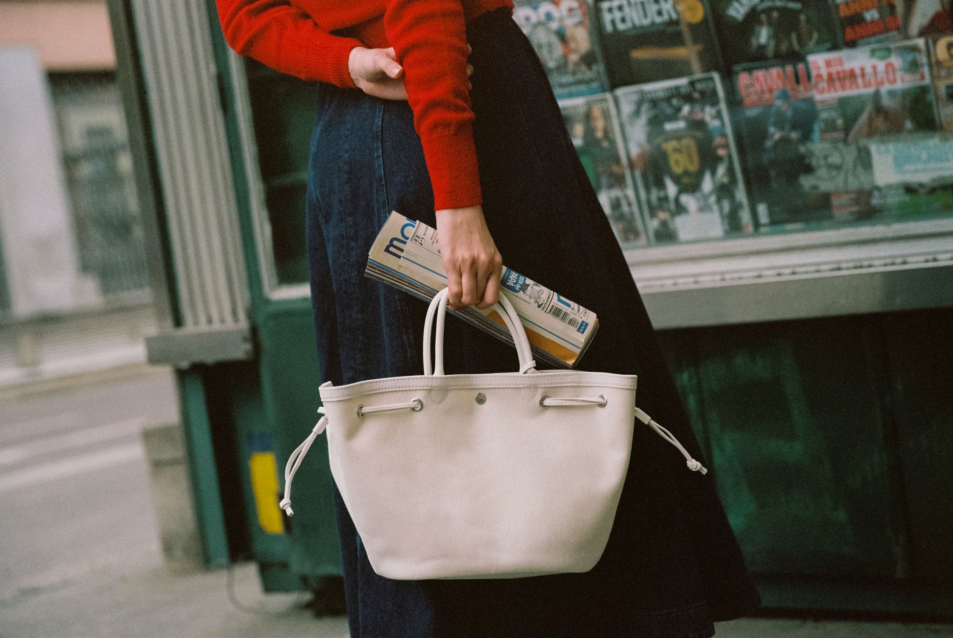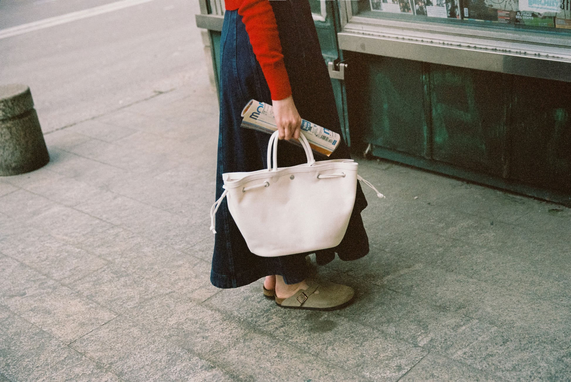 This shopper bag is crafted by combining soft sheepskin with cotton canvas material. Named "COQUILLE," which means "shell" in French, it embodies the feature of a bag that can be freely shaped using the leather string at the top. When carrying many belongings, you can spread it wide to form the shape of a shopper bag, or you can tighten the string to use it as a bucket bag. There's a snap in the center with the logo embossed, allowing for secure closure. Additionally, it comes with a detachable pouch, making it convenient to store small essentials that are frequently needed. The soft and round strap provides a comfortable grip even when the bag is filled with many items, while the sturdy sheepskin bottom provides stability to the bag.