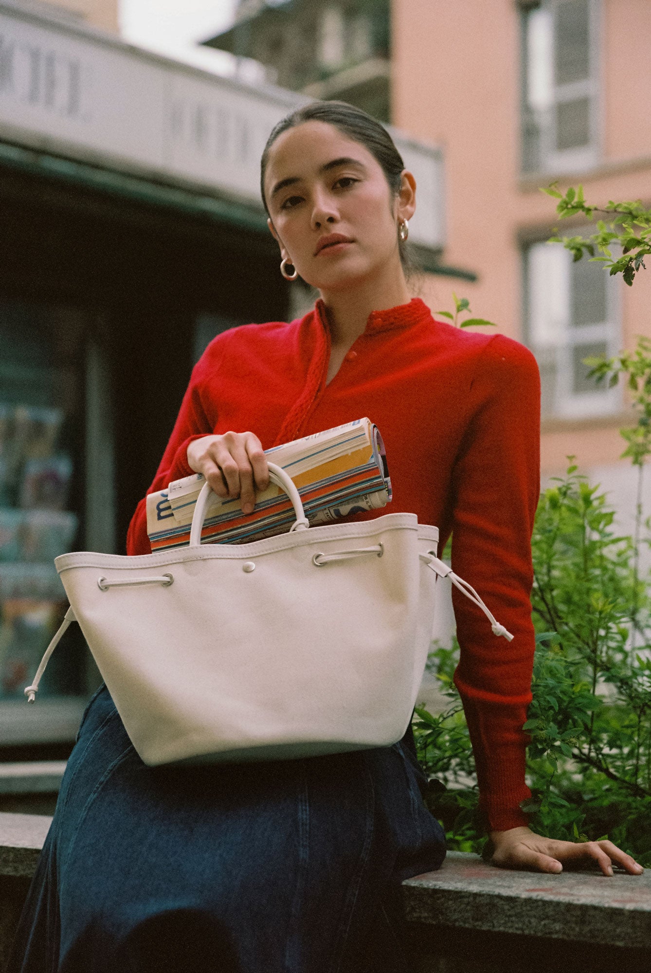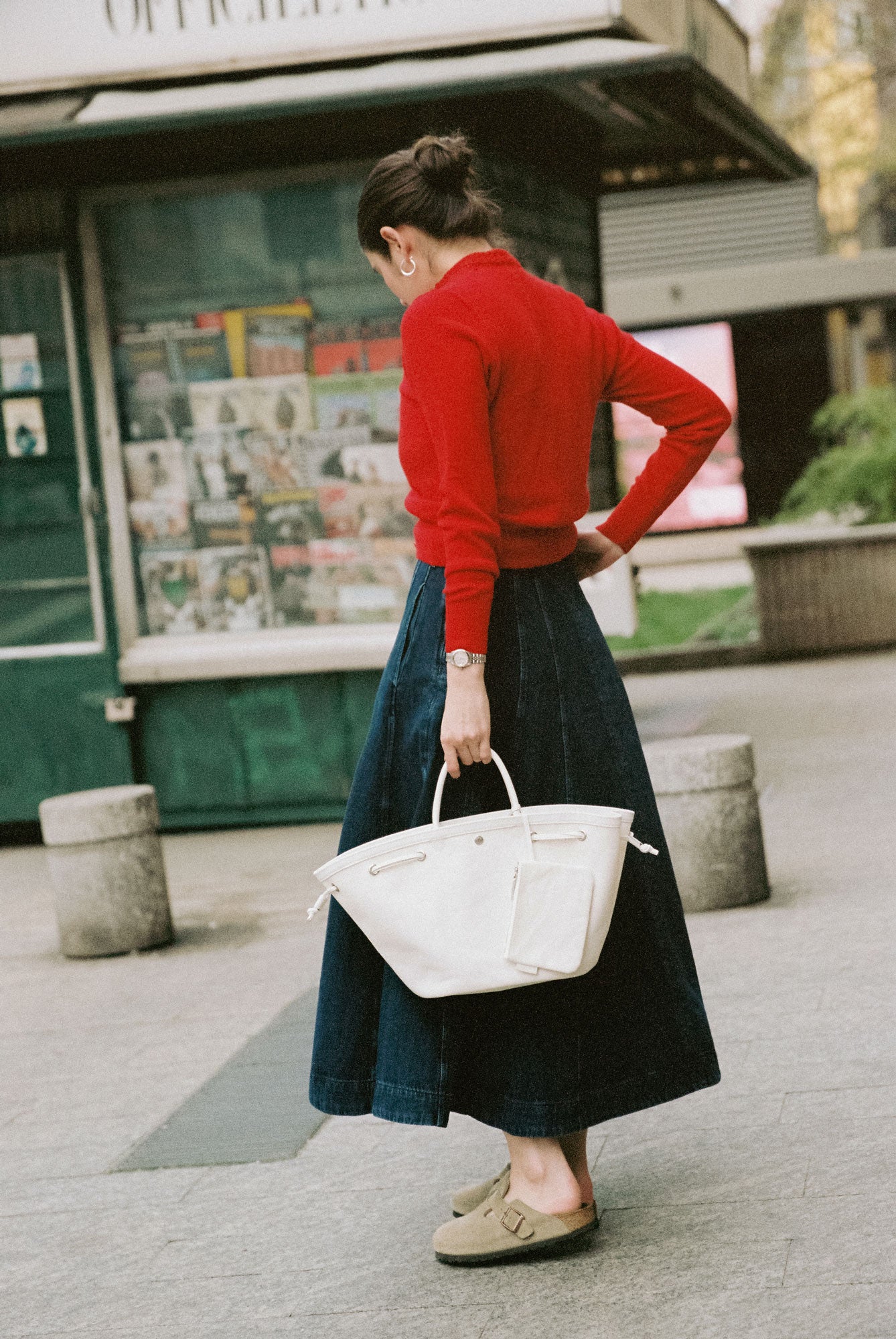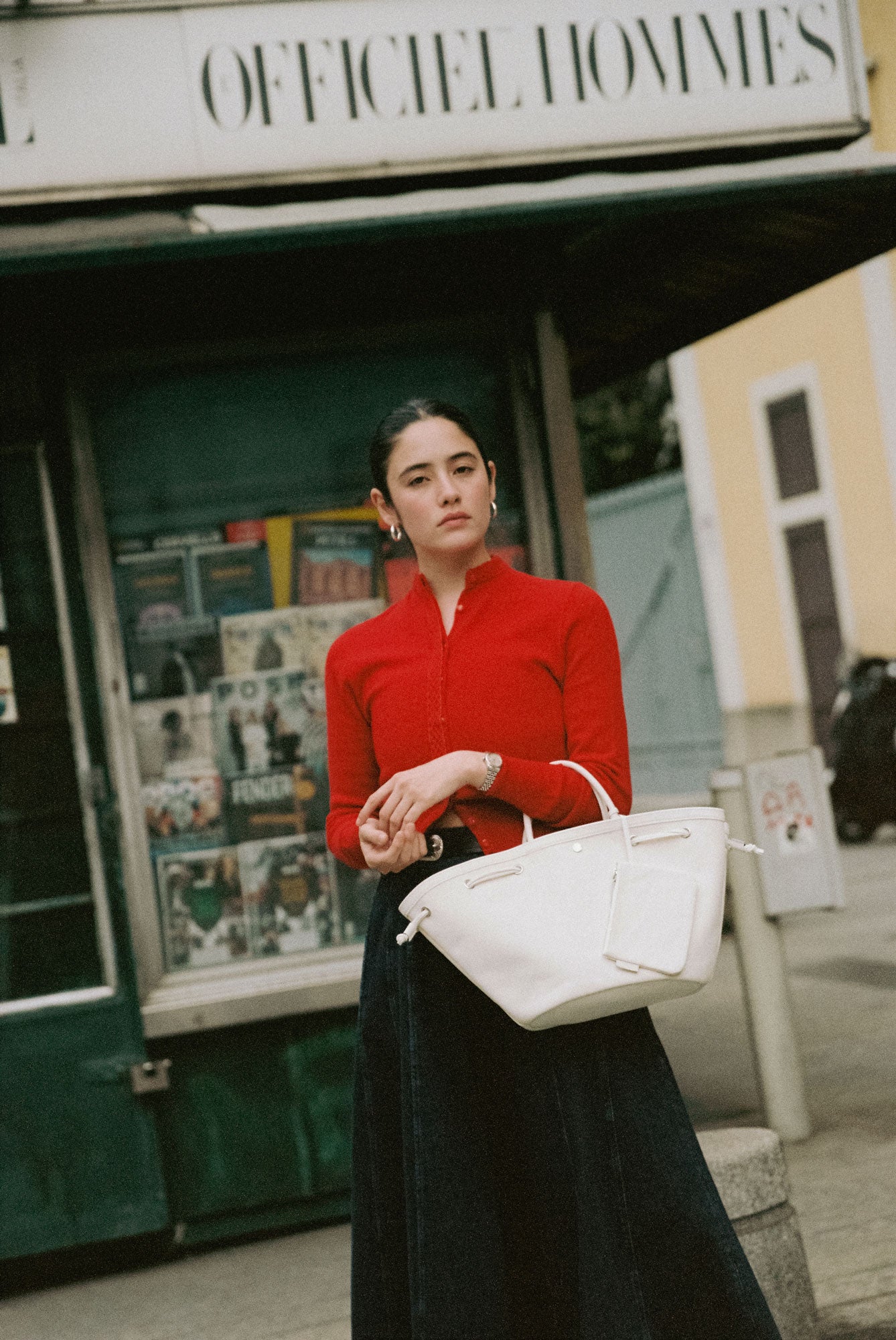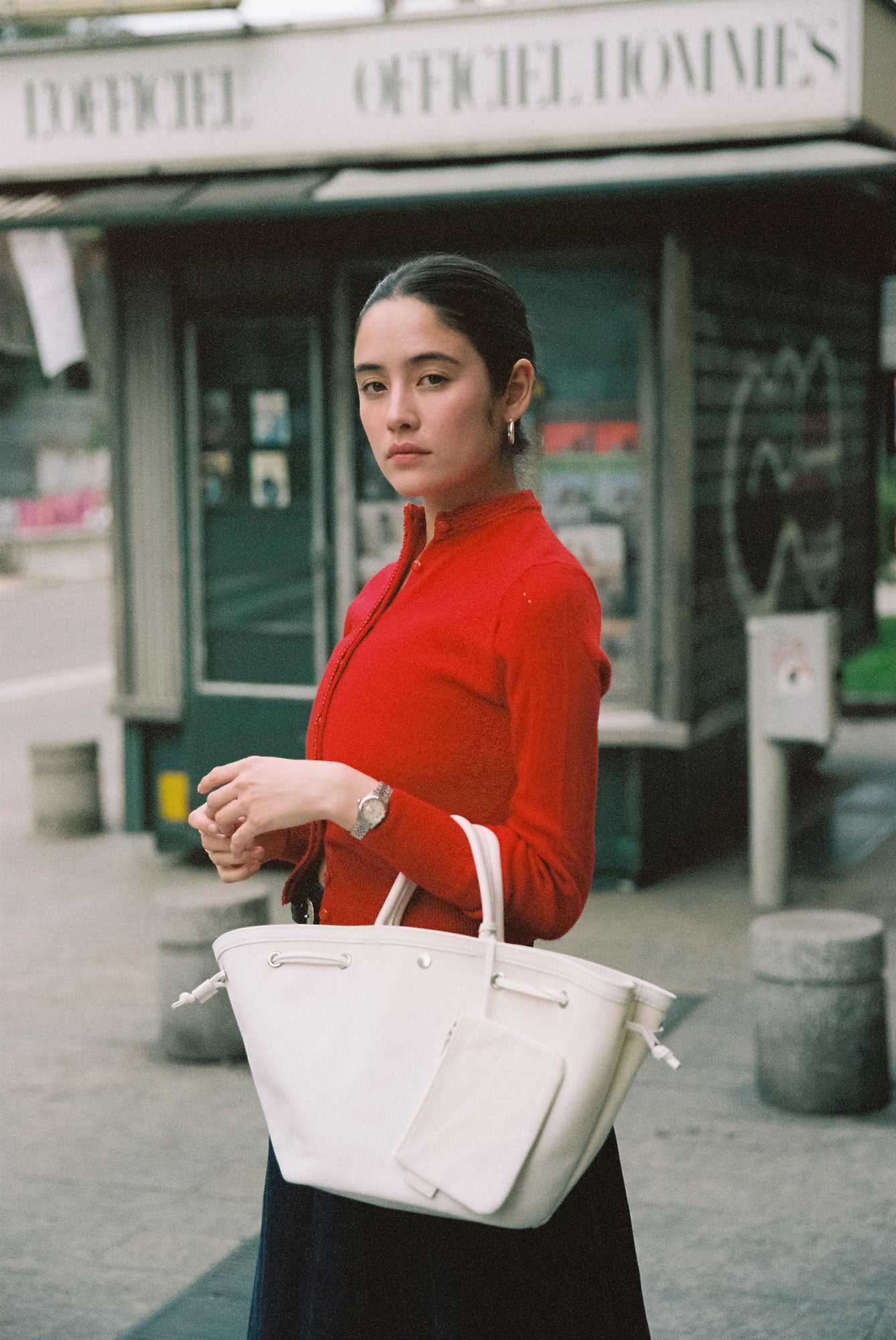 This shopper bag is crafted by combining soft sheepskin with cotton canvas material. Named "COQUILLE," which means "shell" in French, it embodies the feature of a bag that can be freely shaped using the leather string at the top. When carrying many belongings, you can spread it wide to form the shape of a shopper bag, or you can tighten the string to use it as a bucket bag. There's a snap in the center with the logo embossed, allowing for secure closure. Additionally, it comes with a detachable pouch, making it convenient to store small essentials that are frequently needed. The soft and round strap provides a comfortable grip even when the bag is filled with many items, while the sturdy sheepskin bottom provides stability to the bag.