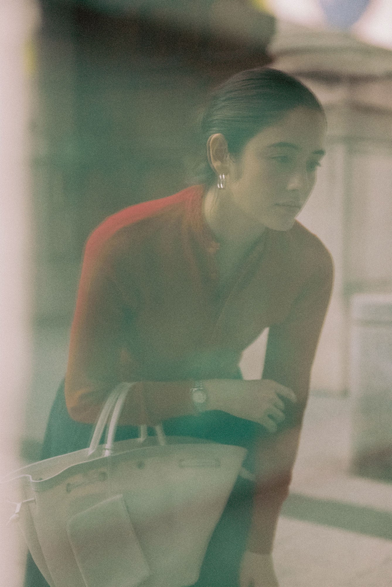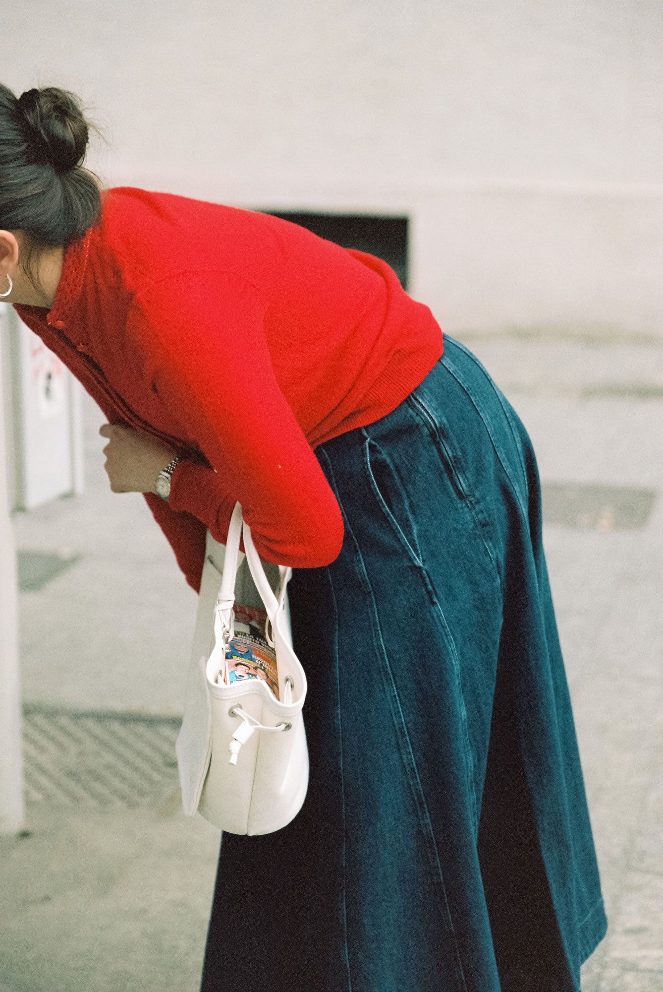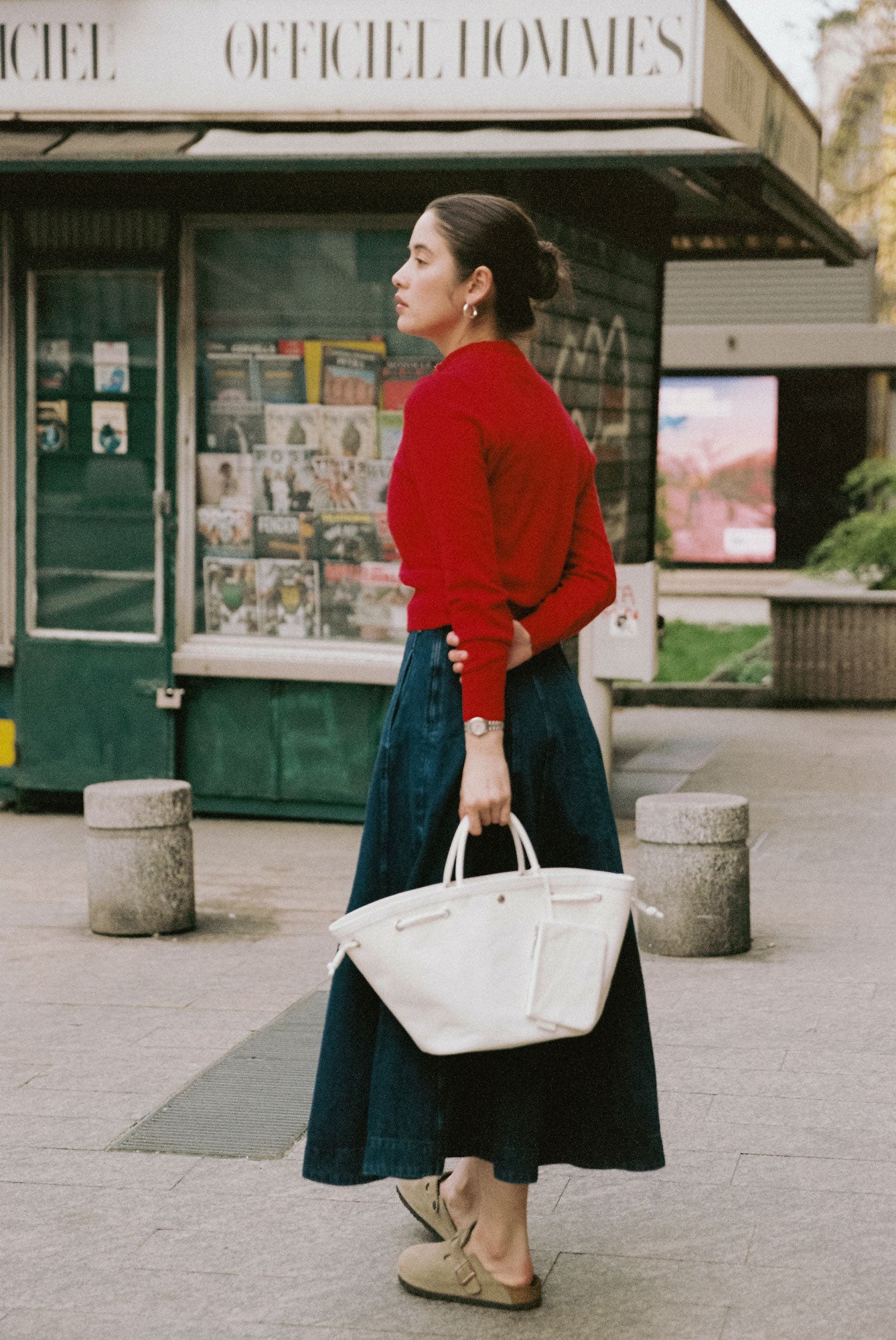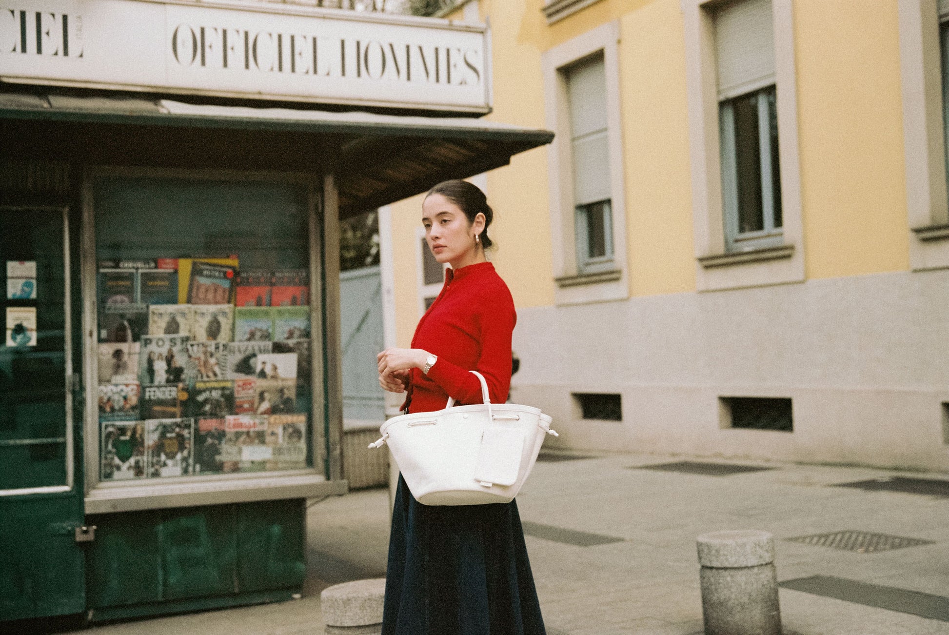 This shopper bag is crafted by combining soft sheepskin with cotton canvas material. Named "COQUILLE," which means "shell" in French, it embodies the feature of a bag that can be freely shaped using the leather string at the top. When carrying many belongings, you can spread it wide to form the shape of a shopper bag, or you can tighten the string to use it as a bucket bag. There's a snap in the center with the logo embossed, allowing for secure closure. Additionally, it comes with a detachable pouch, making it convenient to store small essentials that are frequently needed. The soft and round strap provides a comfortable grip even when the bag is filled with many items, while the sturdy sheepskin bottom provides stability to the bag.