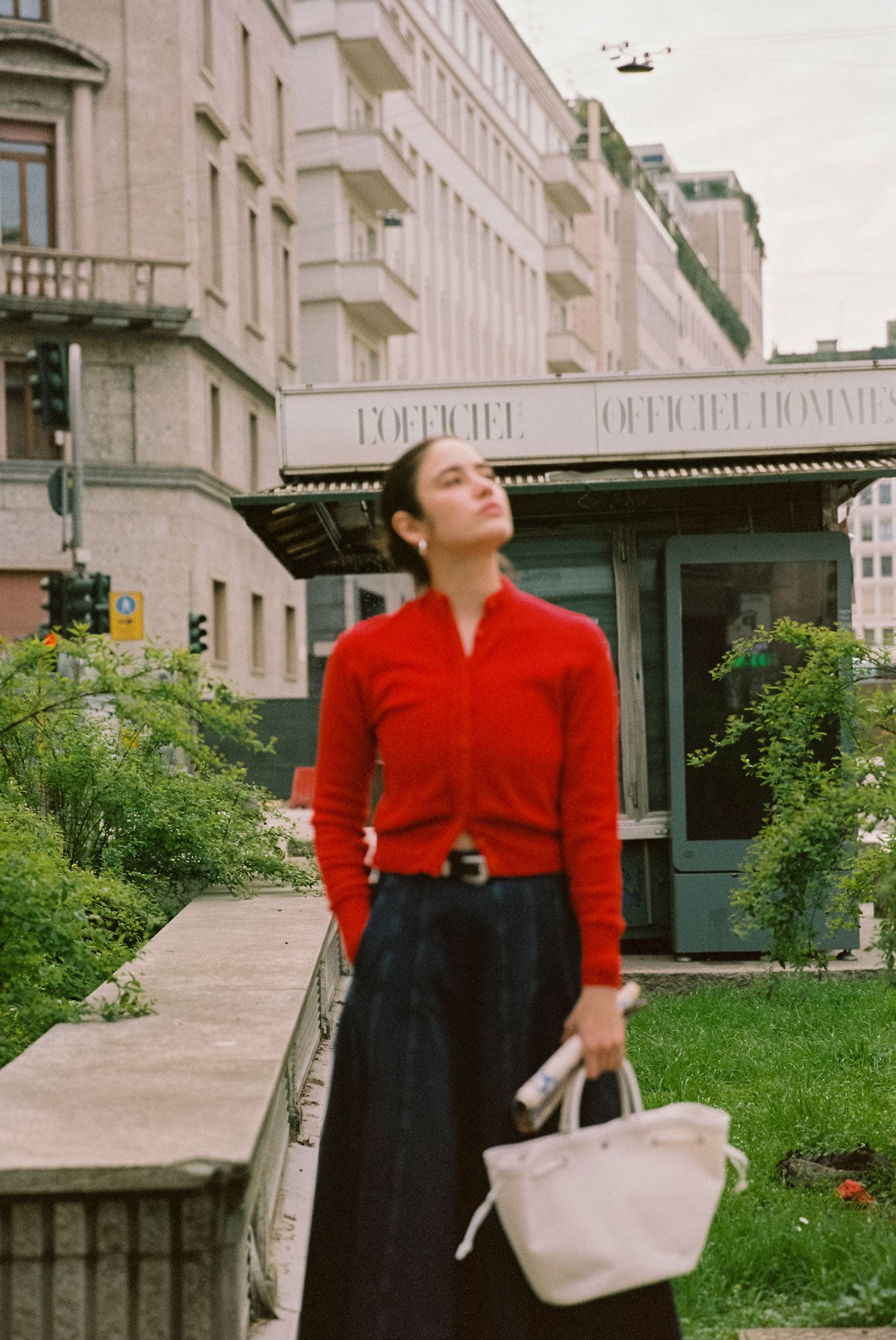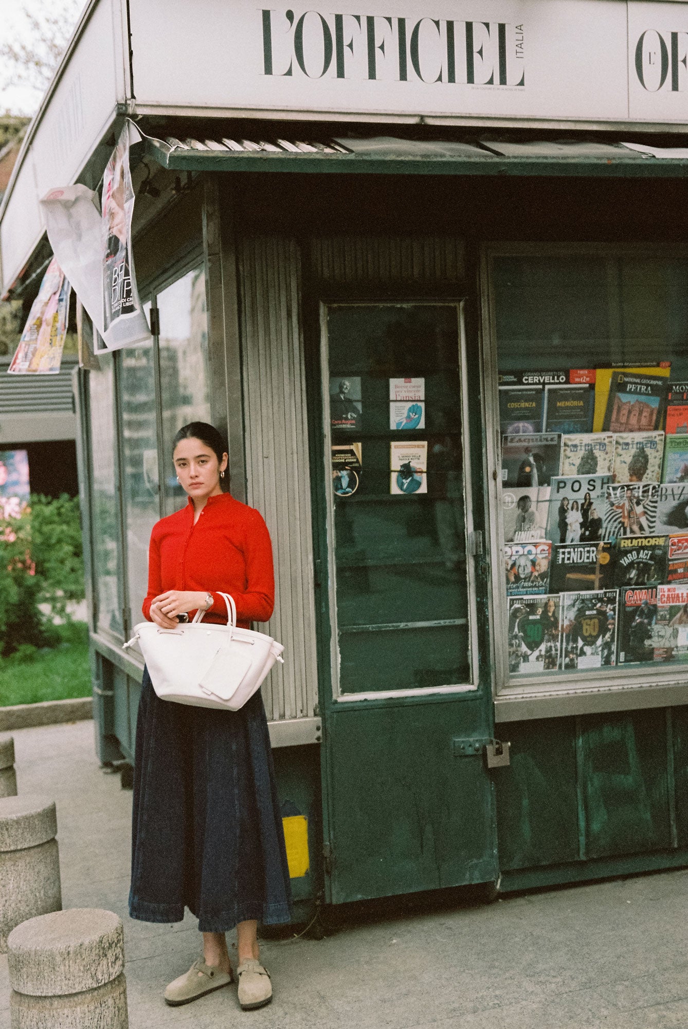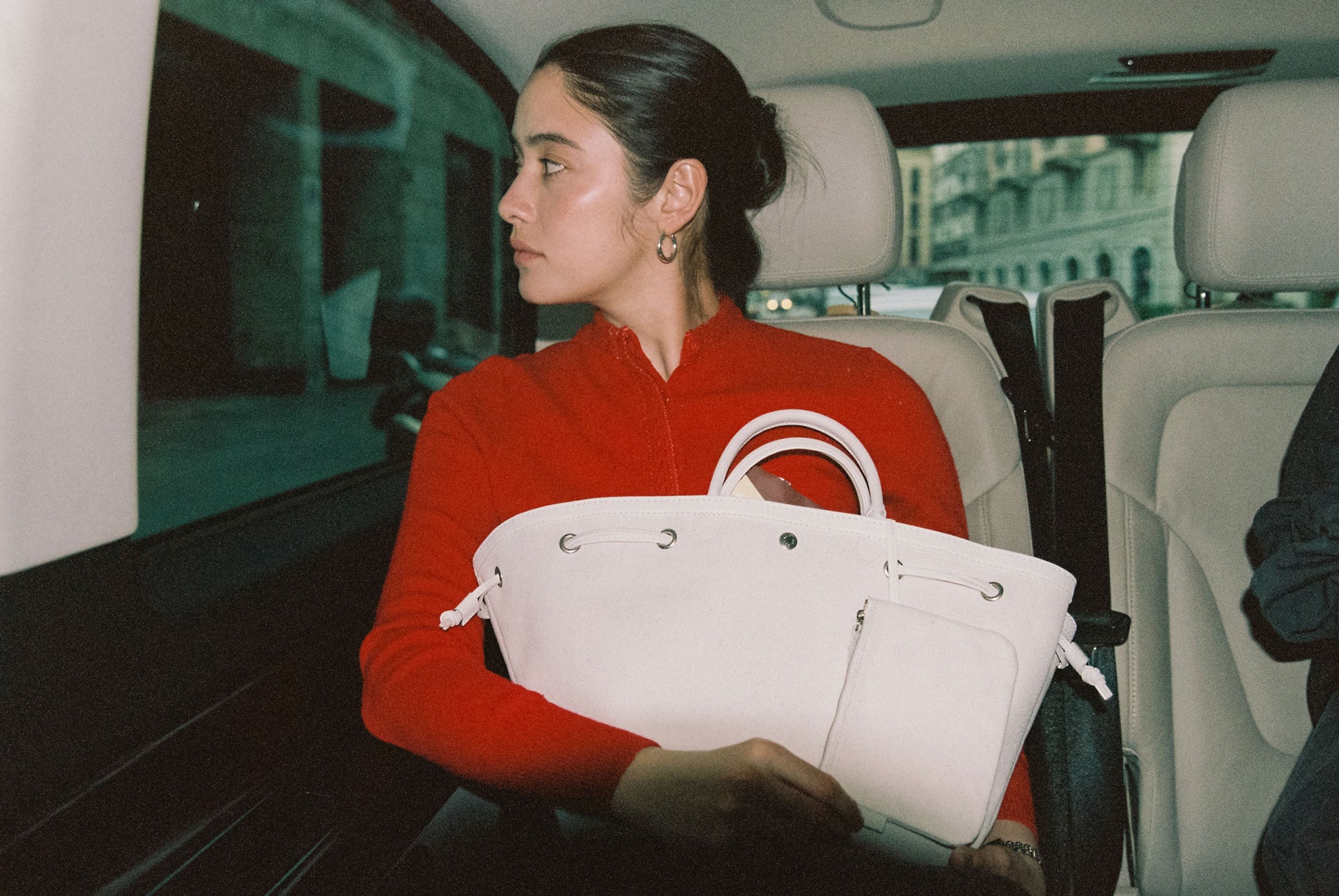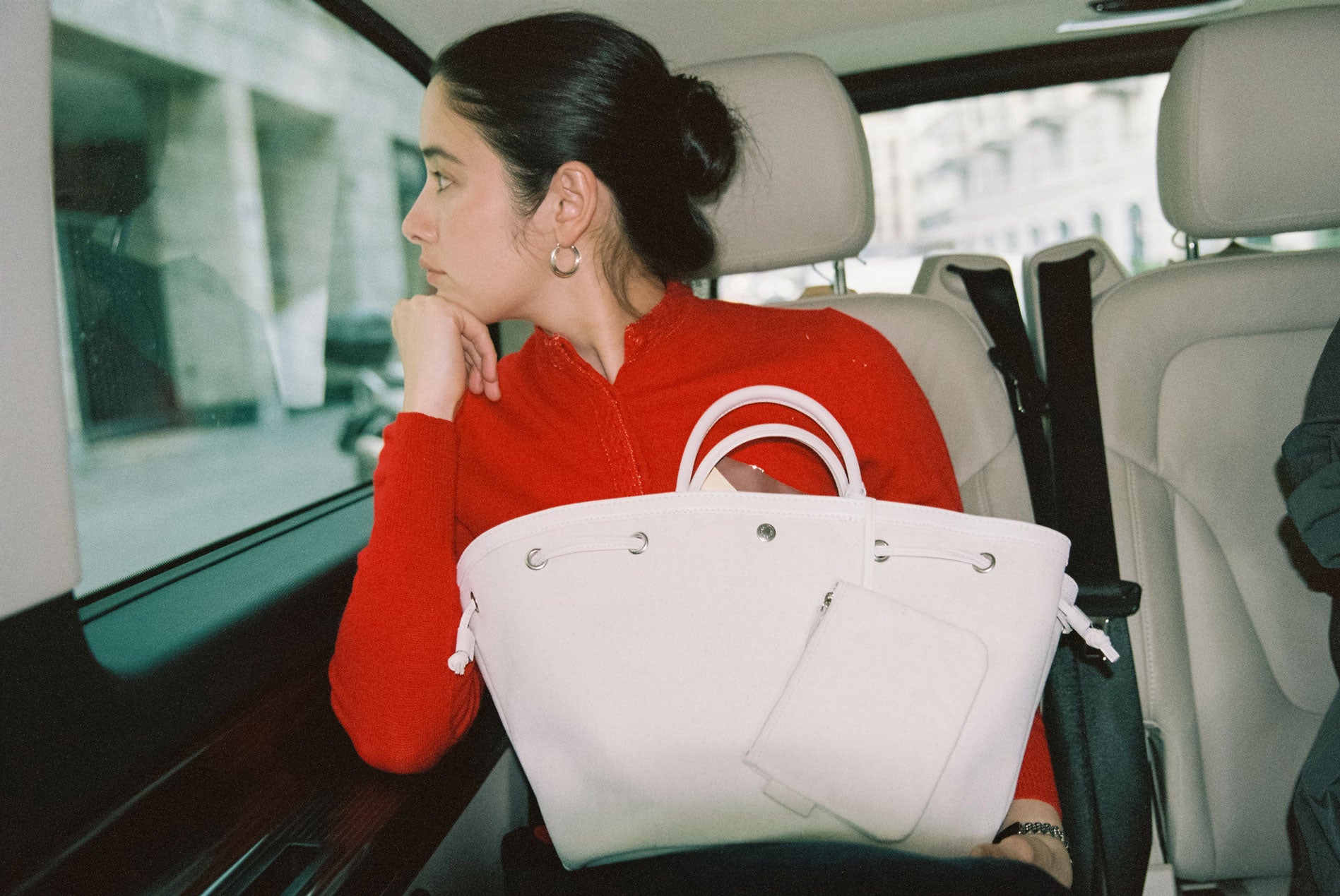 This shopper bag is crafted by combining soft sheepskin with cotton canvas material. Named "COQUILLE," which means "shell" in French, it embodies the feature of a bag that can be freely shaped using the leather string at the top. When carrying many belongings, you can spread it wide to form the shape of a shopper bag, or you can tighten the string to use it as a bucket bag. There's a snap in the center with the logo embossed, allowing for secure closure. Additionally, it comes with a detachable pouch, making it convenient to store small essentials that are frequently needed. The soft and round strap provides a comfortable grip even when the bag is filled with many items, while the sturdy sheepskin bottom provides stability to the bag.