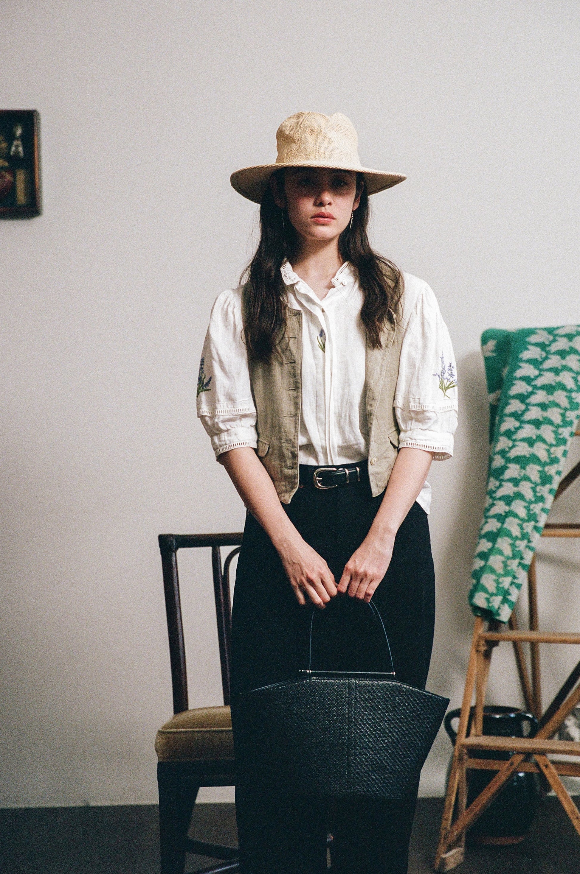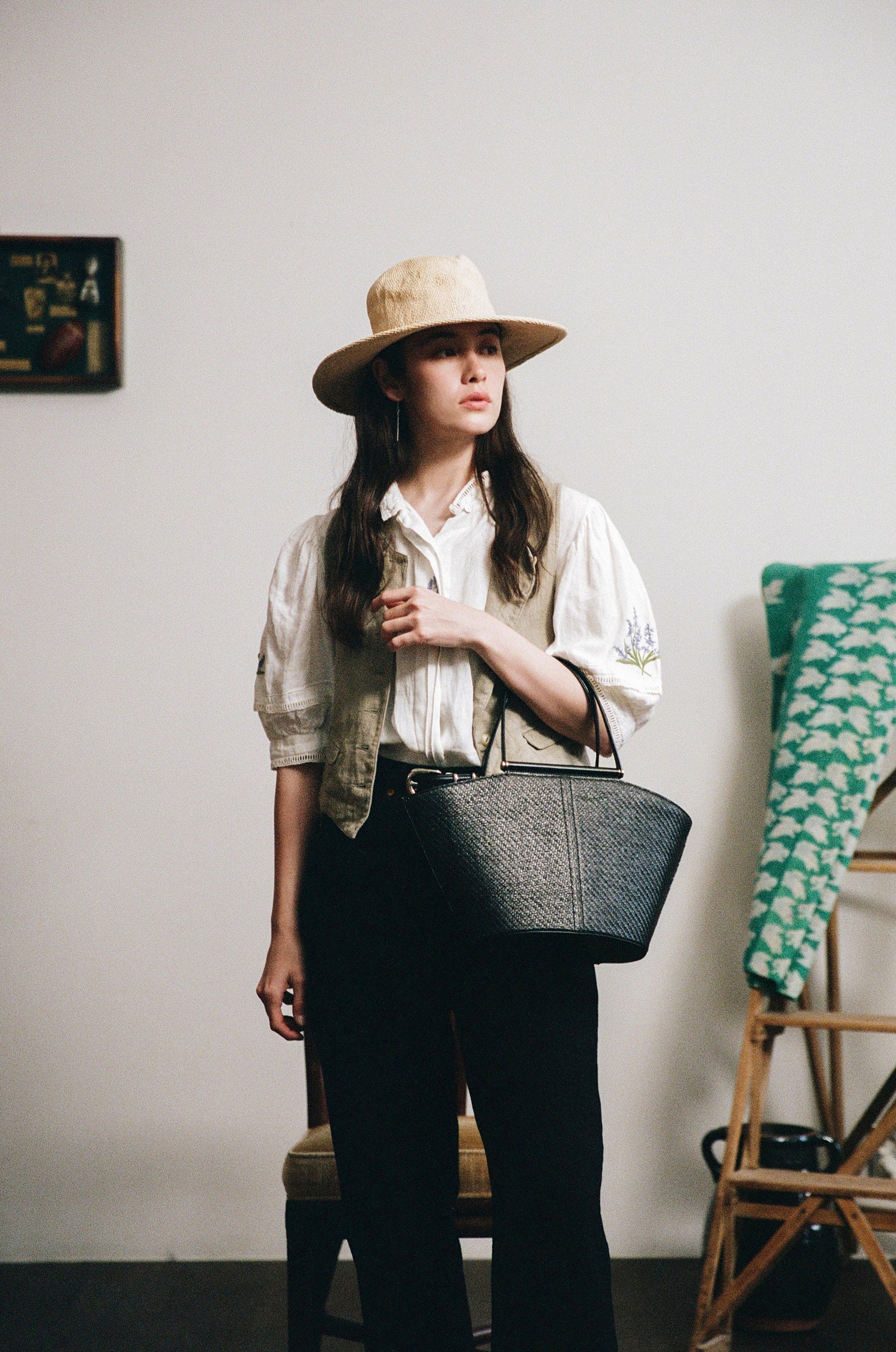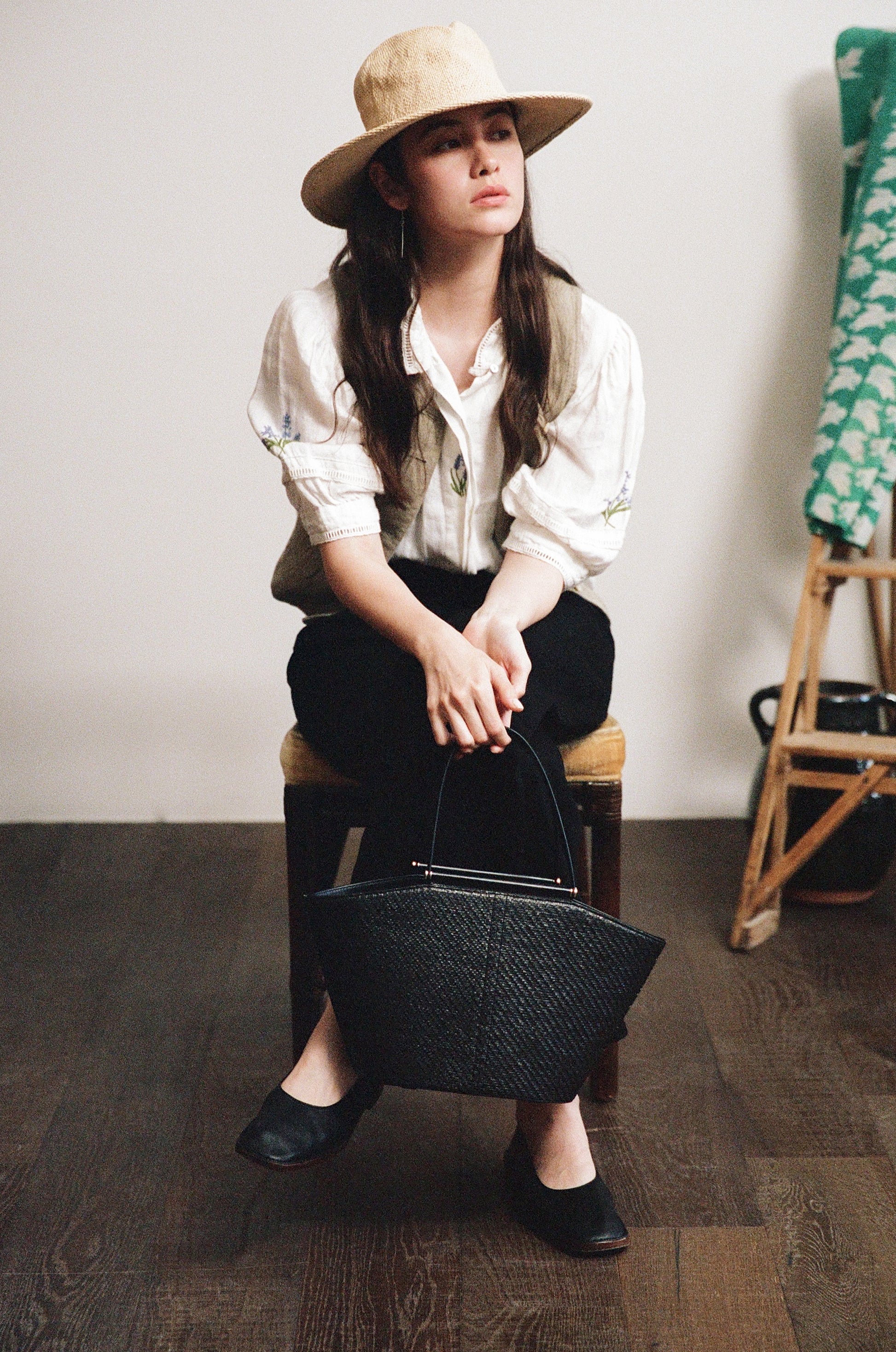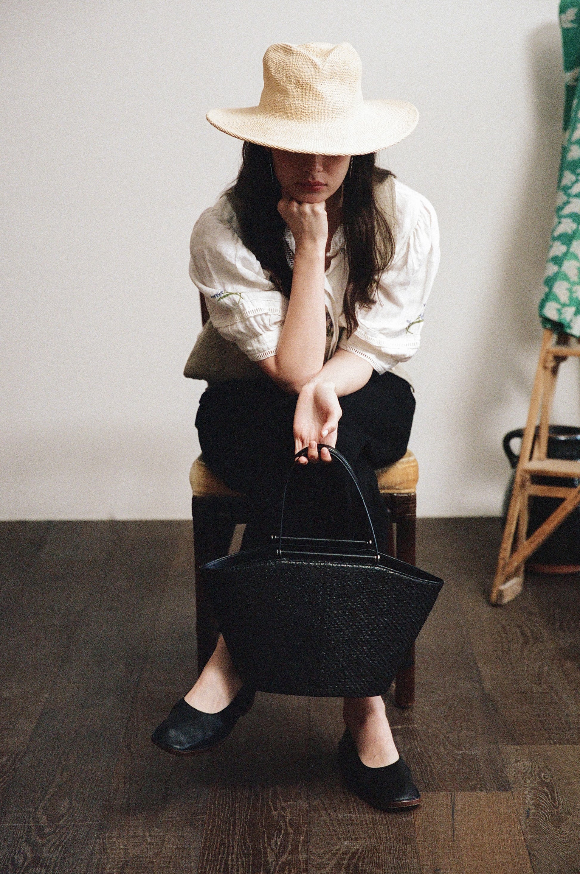 The SAC ÉTIRÉ is reintroduced this season in three new colors. Woven from finely twisted pulp material and finished with vintage two-tone leather accents, it combines a light, airy feel with a classic mood. Its linen lining keeps the bag lightweight, while the roomy interior makes it perfect for both daily use and travel. A zippered inner pocket provides secure storage for small essentials, and a small leather tab allows for easy opening and closing. The bottom is reinforced with full-grain leather and features leather-designed pads for added durability.