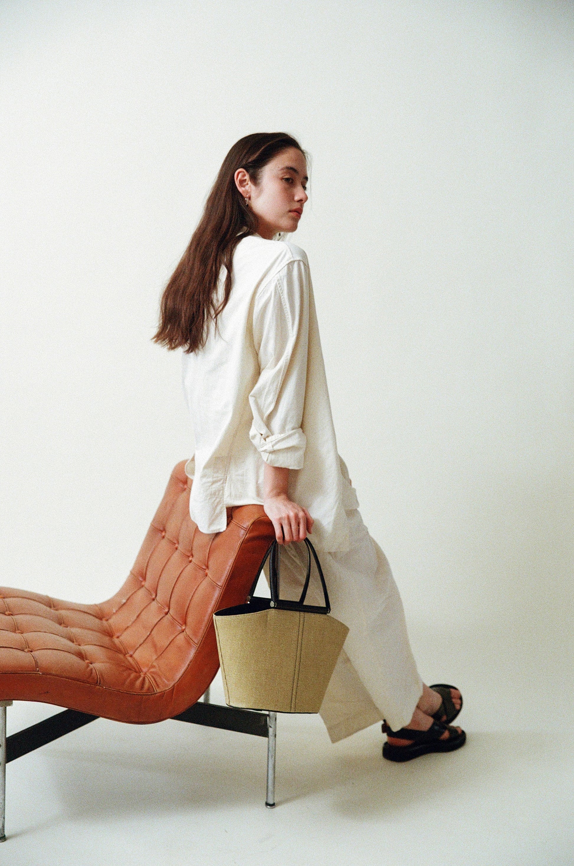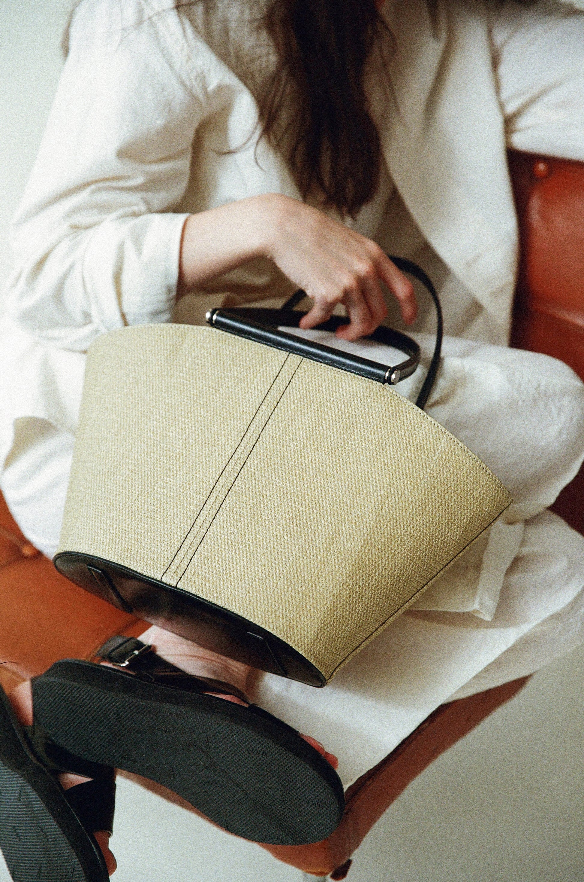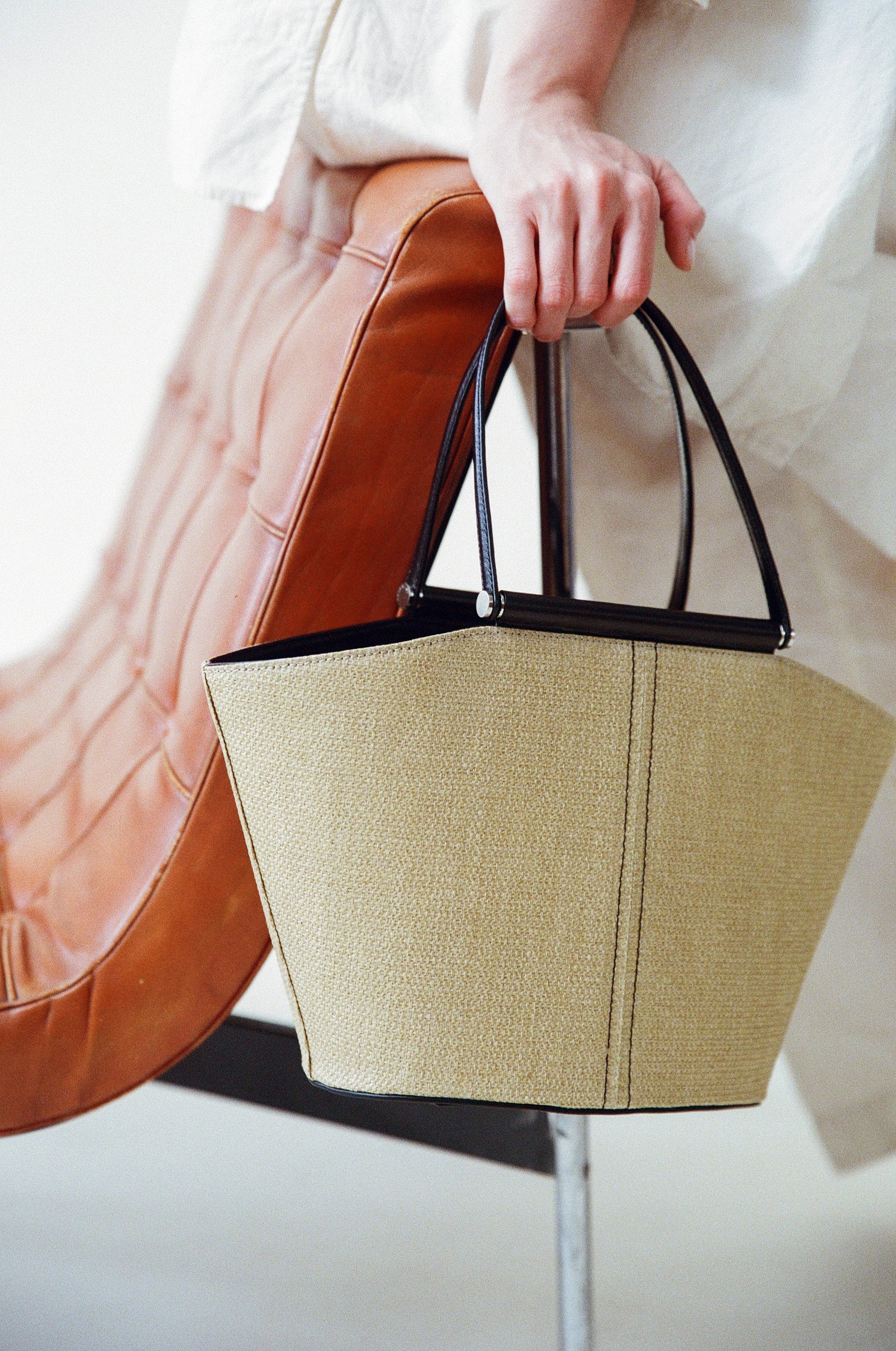 The SAC ÉTIRÉ is reintroduced this season in three new colors. Woven from finely twisted pulp material and finished with vintage two-tone leather accents, it combines a light, airy feel with a classic mood. Its linen lining keeps the bag lightweight, while the roomy interior makes it perfect for both daily use and travel. A zippered inner pocket provides secure storage for small essentials, and a small leather tab allows for easy opening and closing. The bottom is reinforced with full-grain leather and features leather-designed pads for added durability.