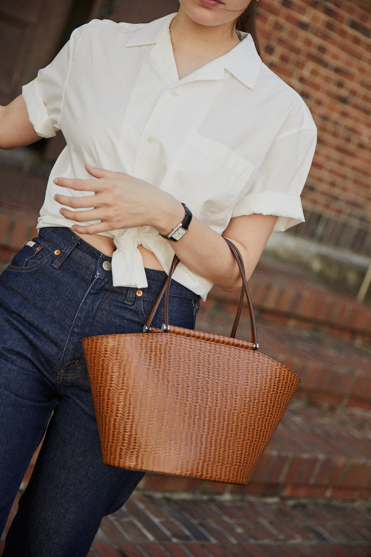 The ÉTIRÉ bag, crafted with a newly introduced weave pattern, is a shopper bag with substantial storage capacity. The intricate weave pattern, resembling woven leather, strikes a balance between delicacy and sturdiness, presenting a natural two-tone expression that preserves the vintage ambiance. The lining, noticeable at first glance, is also fashioned from a linen-cotton blend with a robust texture, enhancing its overall quality. The zippered interior pocket ensures the secure storage of your belongings and opens and closes with a small, easily removable hook, adding to its practicality.