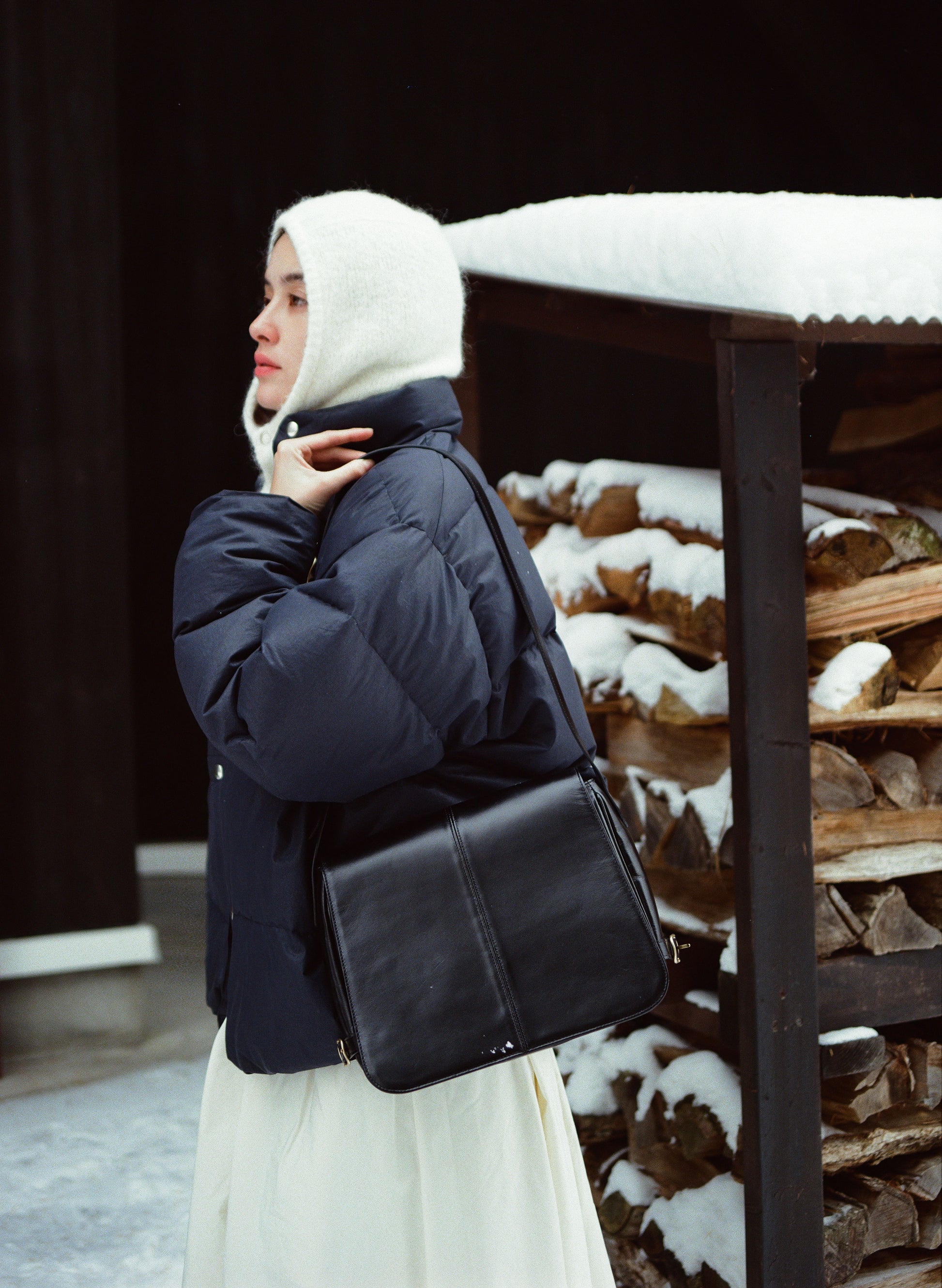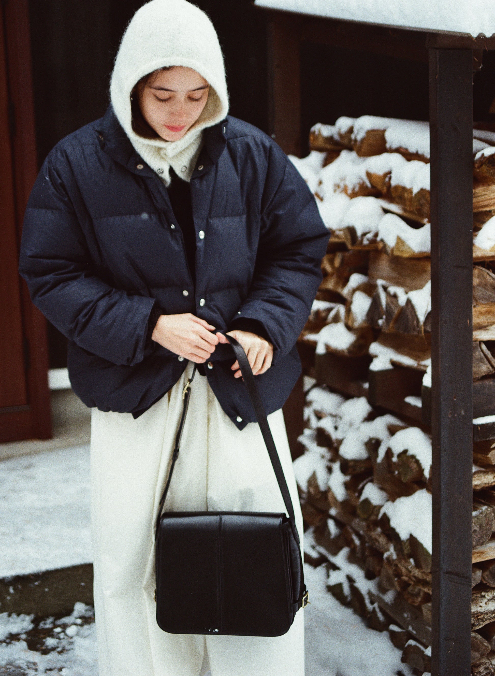 The front leather flap is neatly finished with central stitch detailing, while the sides are divided into accordion-style sections and secured with small buckles, adding intricate details. The side buckles allow you to adjust the bag's capacity based on your belongings, and the adjustable strap ensures versatility, allowing for both shoulder and cross-body wear.