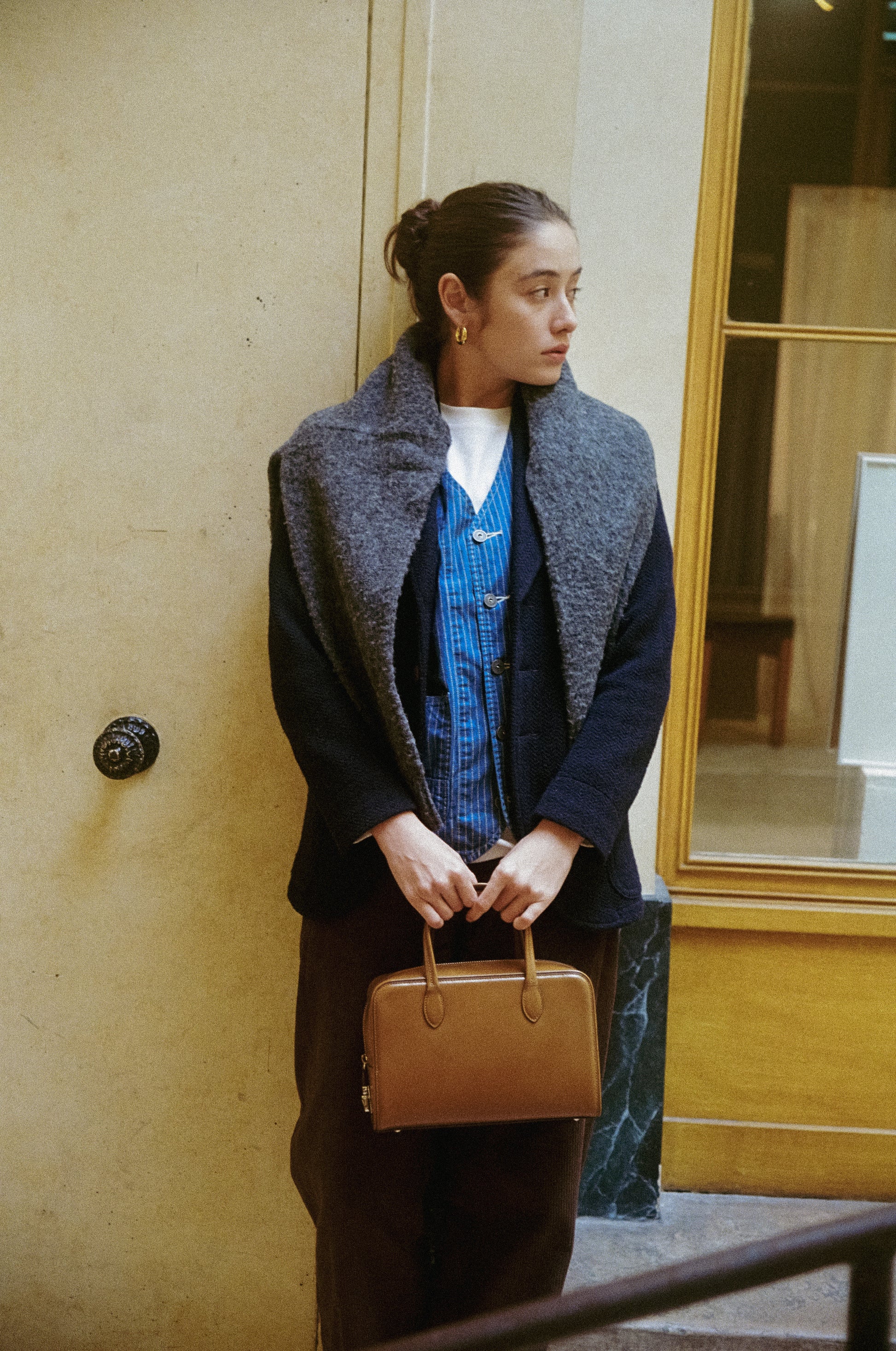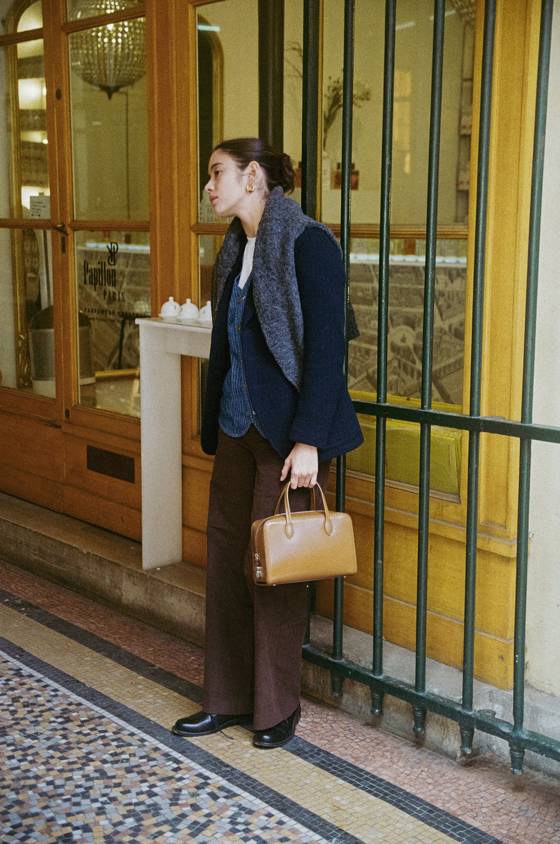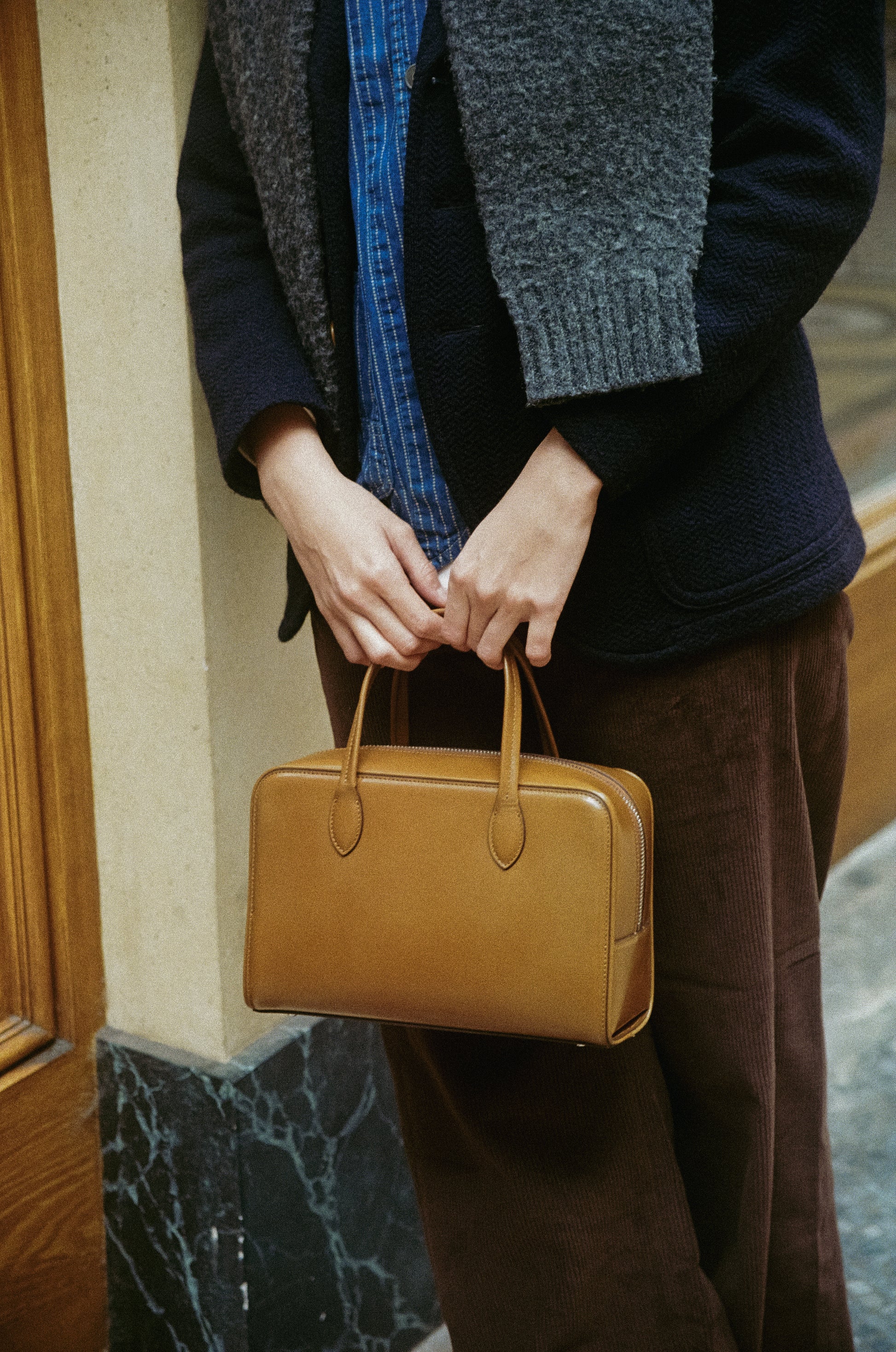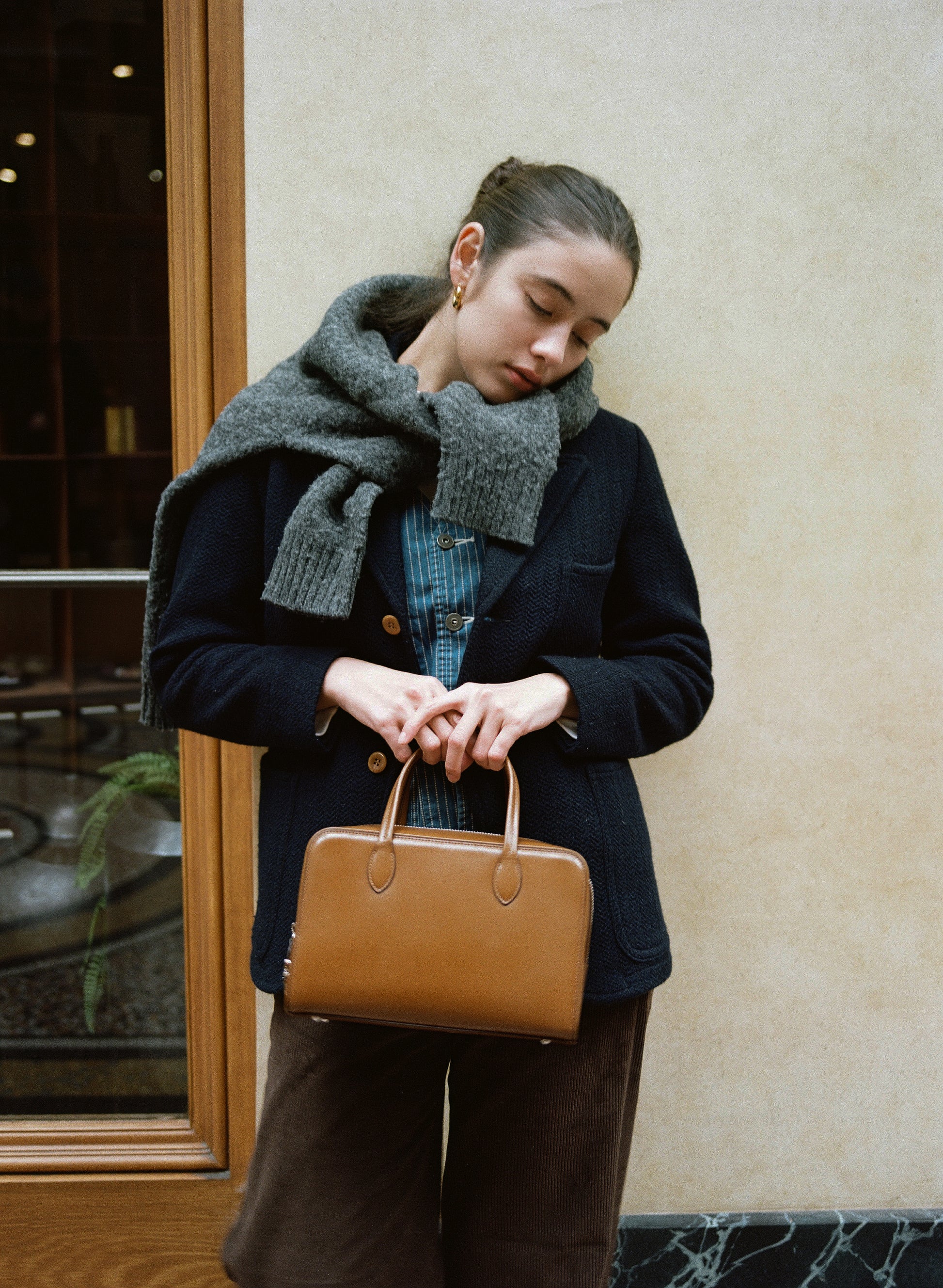 The LOQUET bag features a classic shape adorned with delicate decorations, offering a distinctive interpretation of bawling bag by TOUT Y EST. Crafted from oil-finished leather with a subtle sheen, it incorporates a secure zipper closure enhanced by a signature push lock. The four foot decorations provide stable support, and a firm and classic shape complements any outfit. The thick linen-cotton lining enhances durability, while the wide-opening zipper offers generous storage capacity.