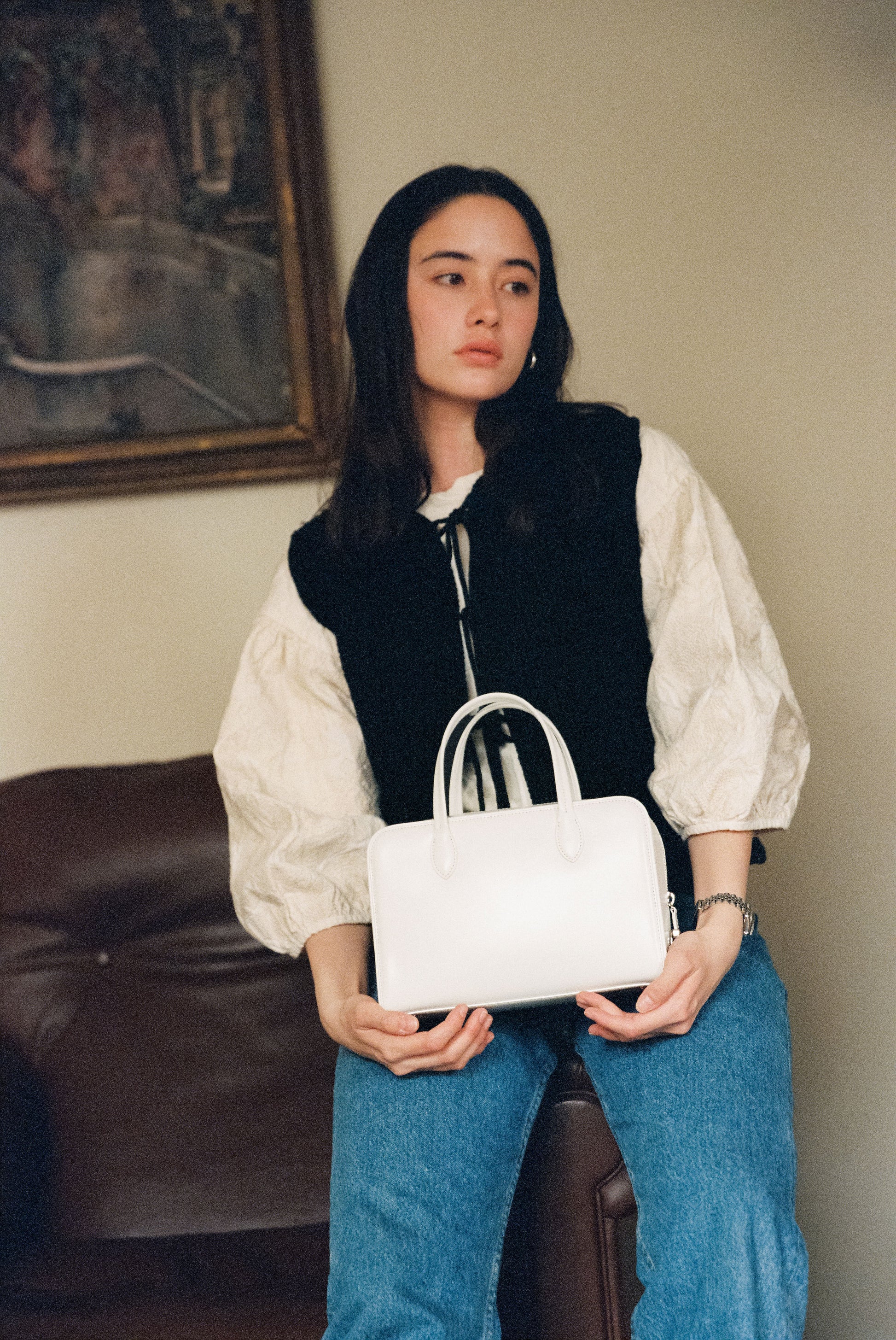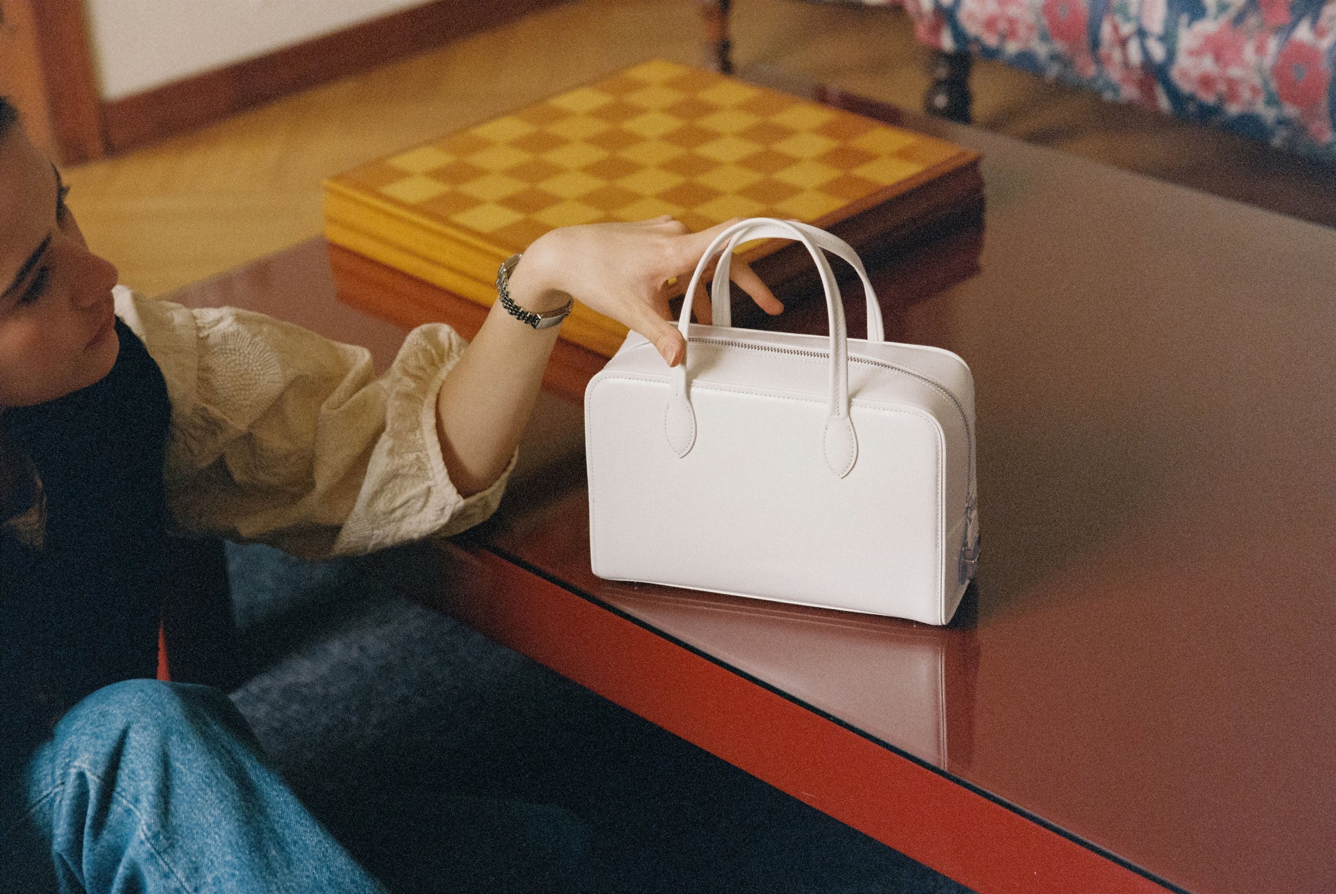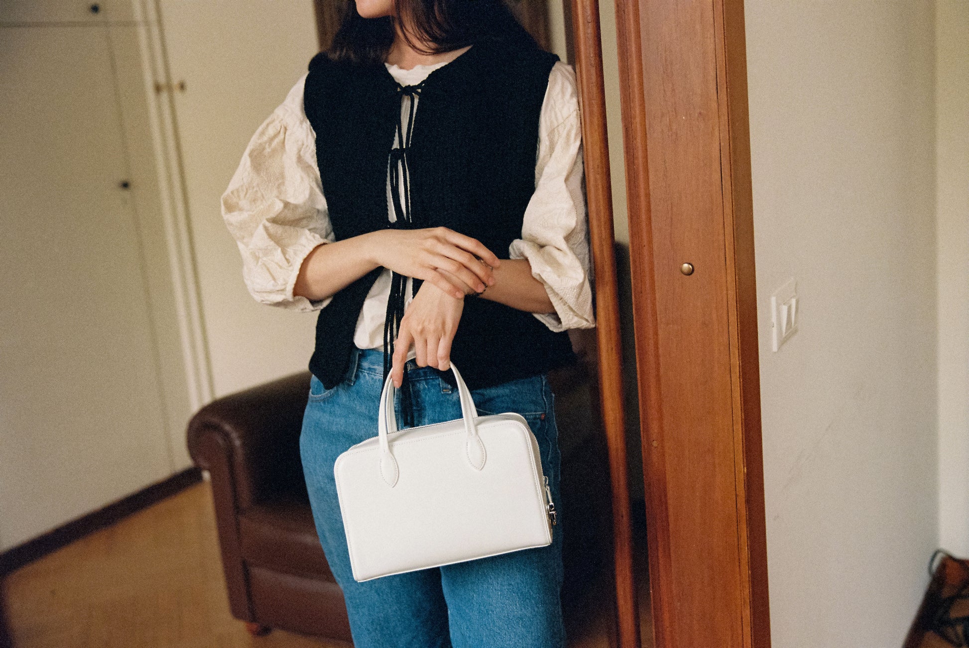 The LOQUET bag features a classic shape adorned with delicate decorations, offering a distinctive interpretation of bawling bag by TOUT Y EST. Crafted from oil-finished leather with a subtle sheen, it incorporates a secure zipper closure enhanced by a signature push lock. The four foot decorations provide stable support, and a firm and classic shape complements any outfit. The thick linen-cotton lining enhances durability, while the wide-opening zipper offers generous storage capacity.