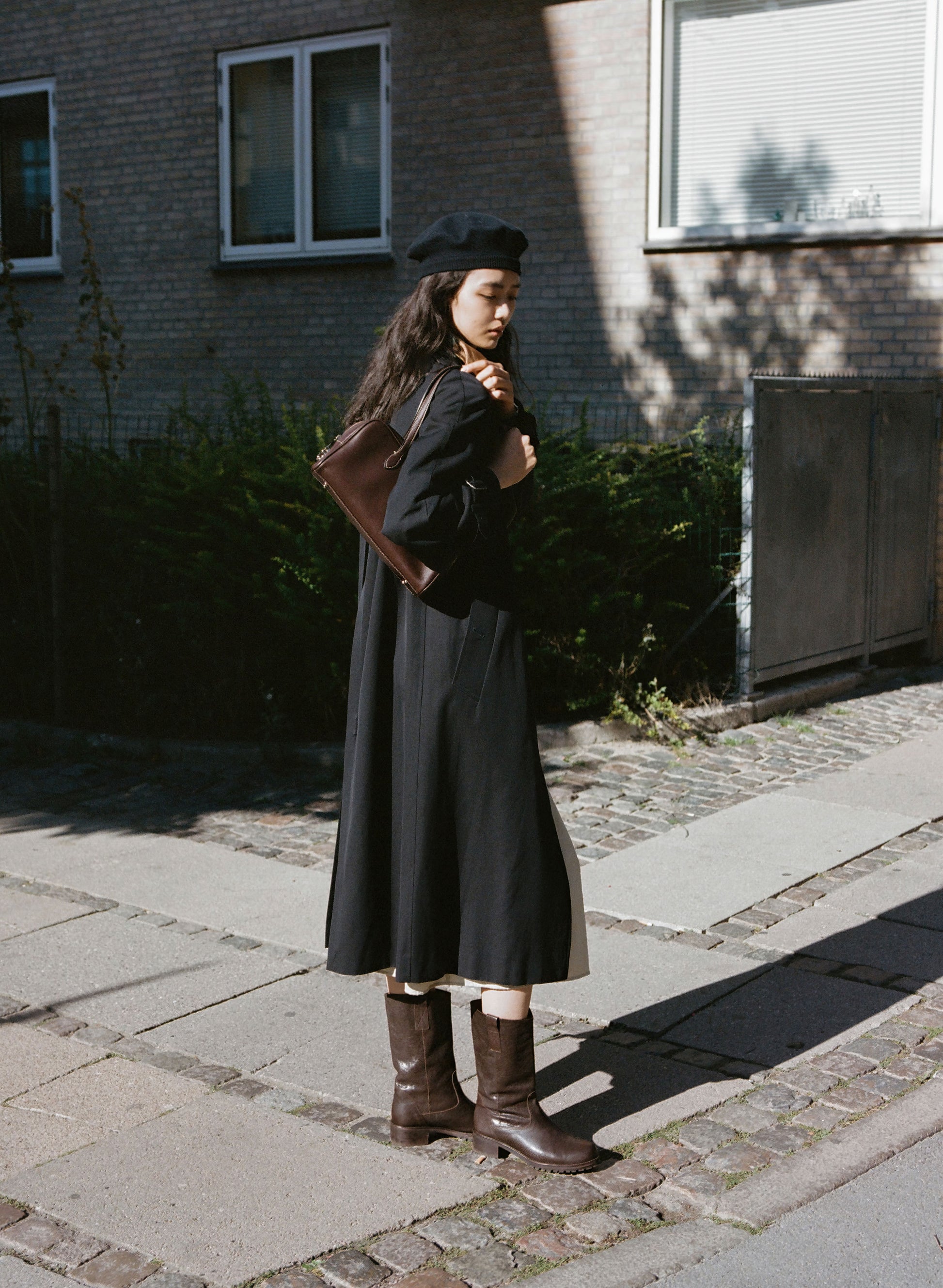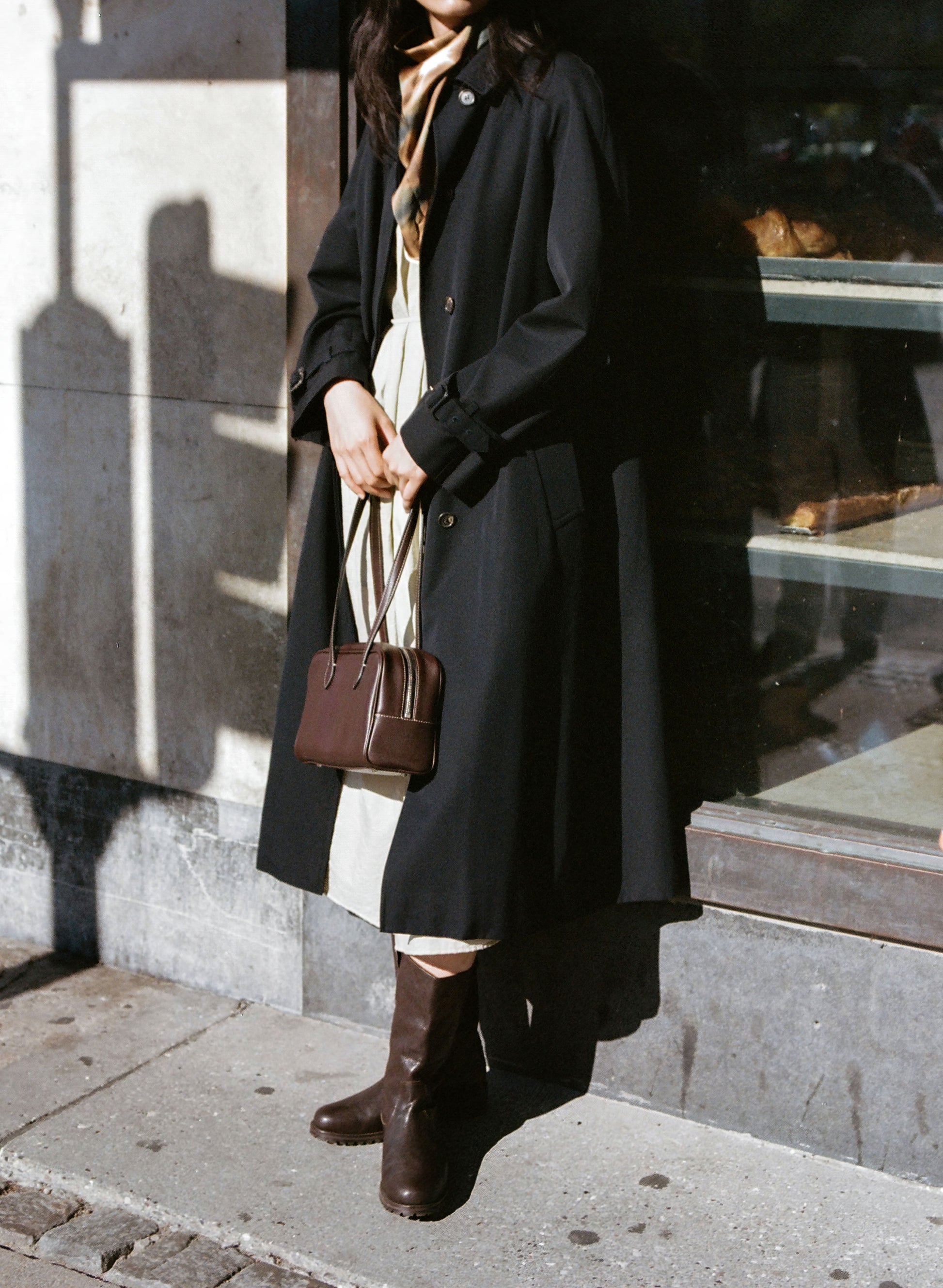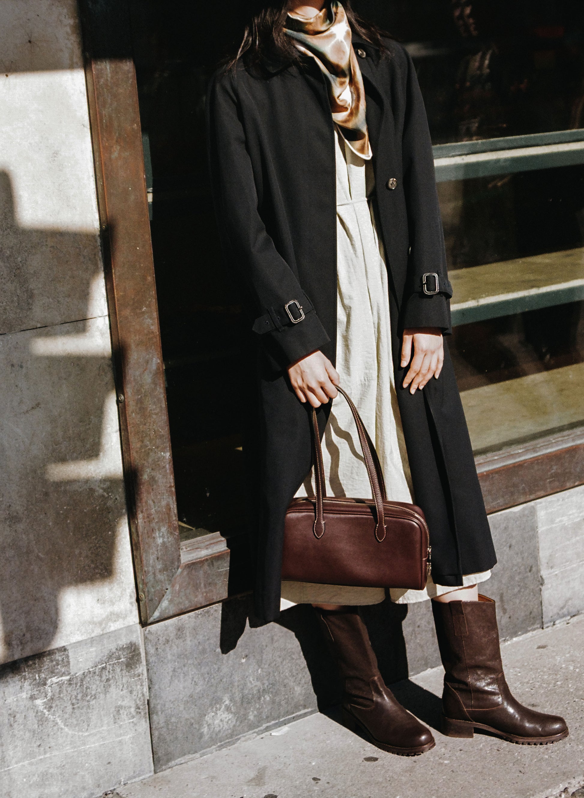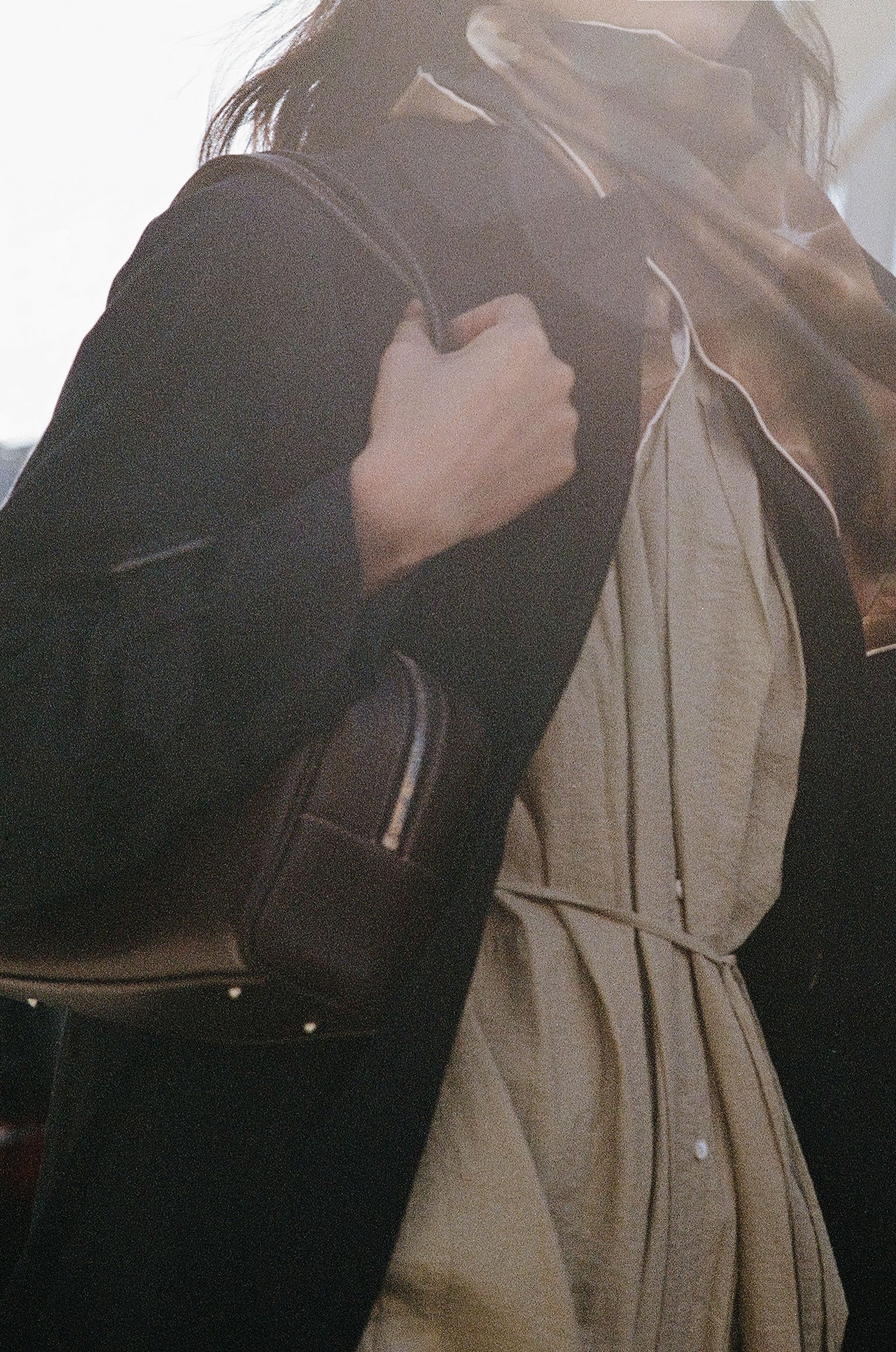 SAC LOQUET SMALL is a compact version of the original long-strap design. Crafted from oil-finished leather with a subtle sheen, it incorporates a secure zipper closure enhanced by a signature push lock. The four foot decorations provide stable support, and a firm and classic shape complements any outfit. The thick linen-cotton lining enhances durability, while the wide-opening zipper offers generous storage capacity. With the addition of the long strap, it can be comfortably worn over winter outerwear.
