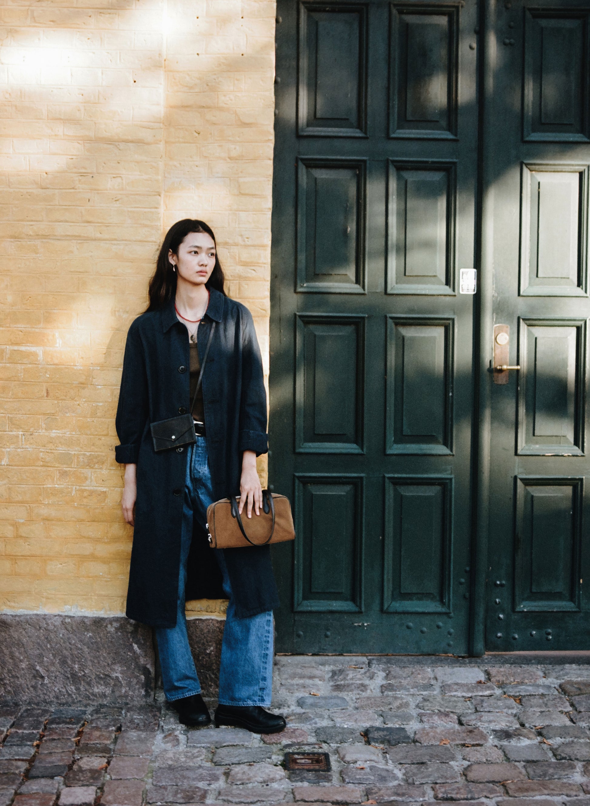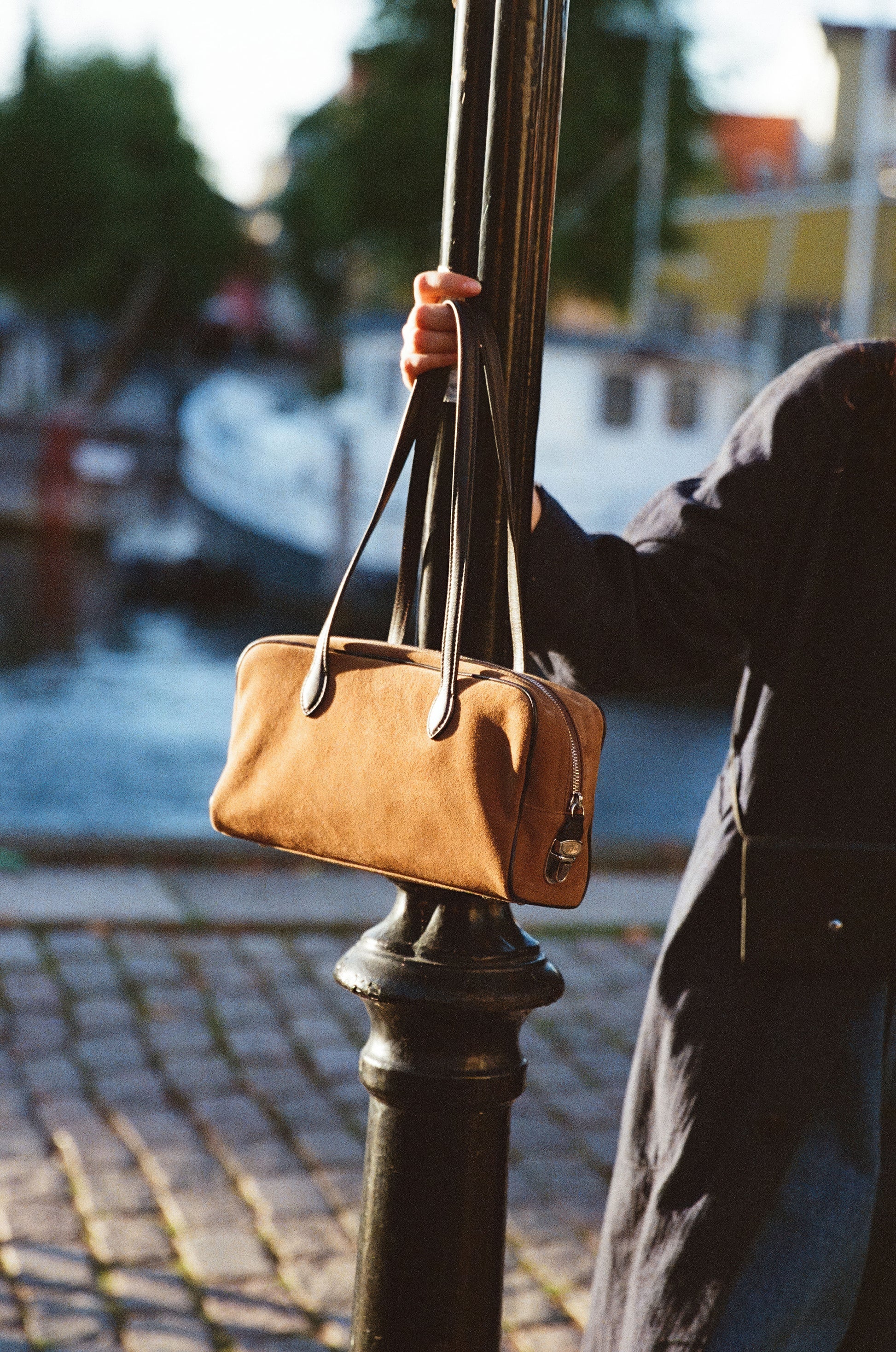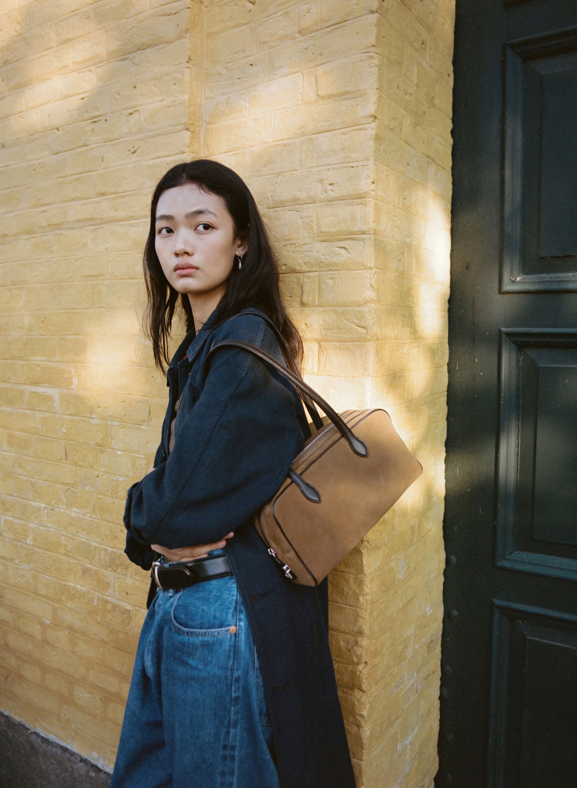 SAC LOQUET SMALL is a compact version of the original long-strap design. Crafted from goat suede, it displays subtle color variations that shift with the light. Its soft texture lets the bag naturally contour to the shoulder for a comfortable fit. A cowhide strap adds durability, while leather-trimmed edges preserve the structured silhouette. Inside, a linen-cotton lining and wide-opening zipper provide easy access and generous storage, all in a lightweight 350g design.