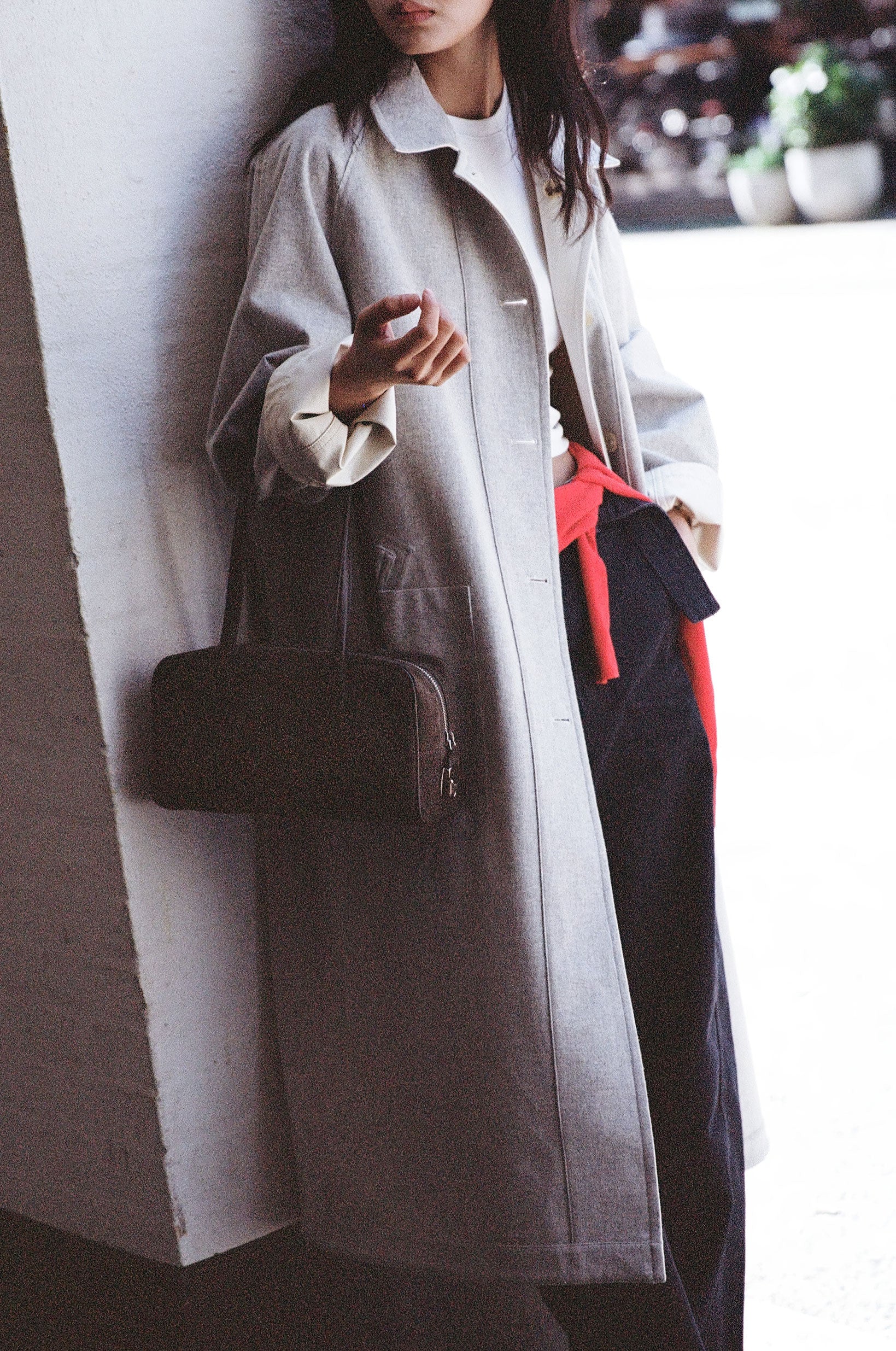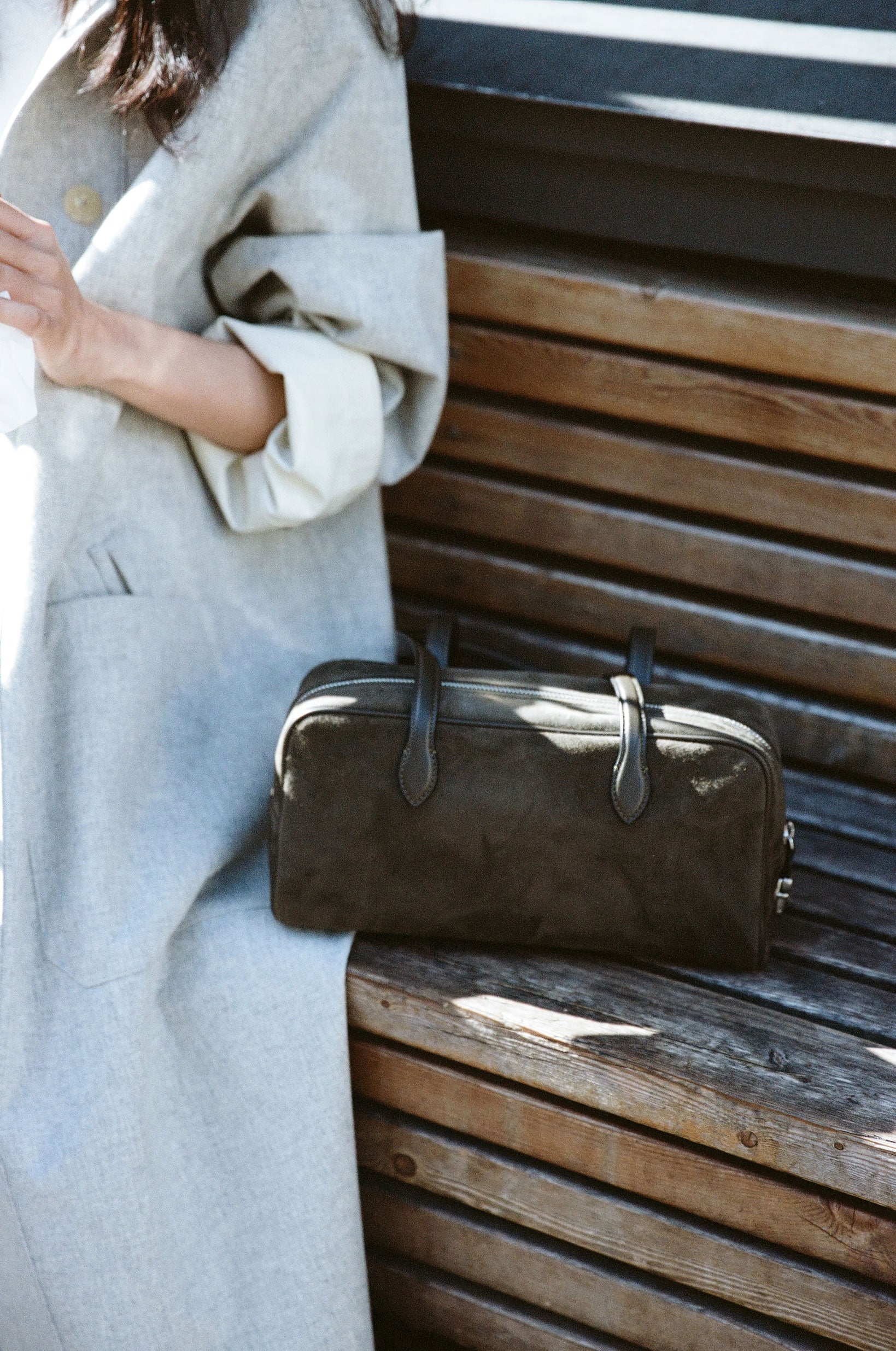 SAC LOQUET SMALL is a compact version of the original long-strap design. Crafted from goat suede, it displays subtle color variations that shift with the light. Its soft texture lets the bag naturally contour to the shoulder for a comfortable fit. A cowhide strap adds durability, while leather-trimmed edges preserve the structured silhouette. Inside, a linen-cotton lining and wide-opening zipper provide easy access and generous storage, all in a lightweight 350g design.