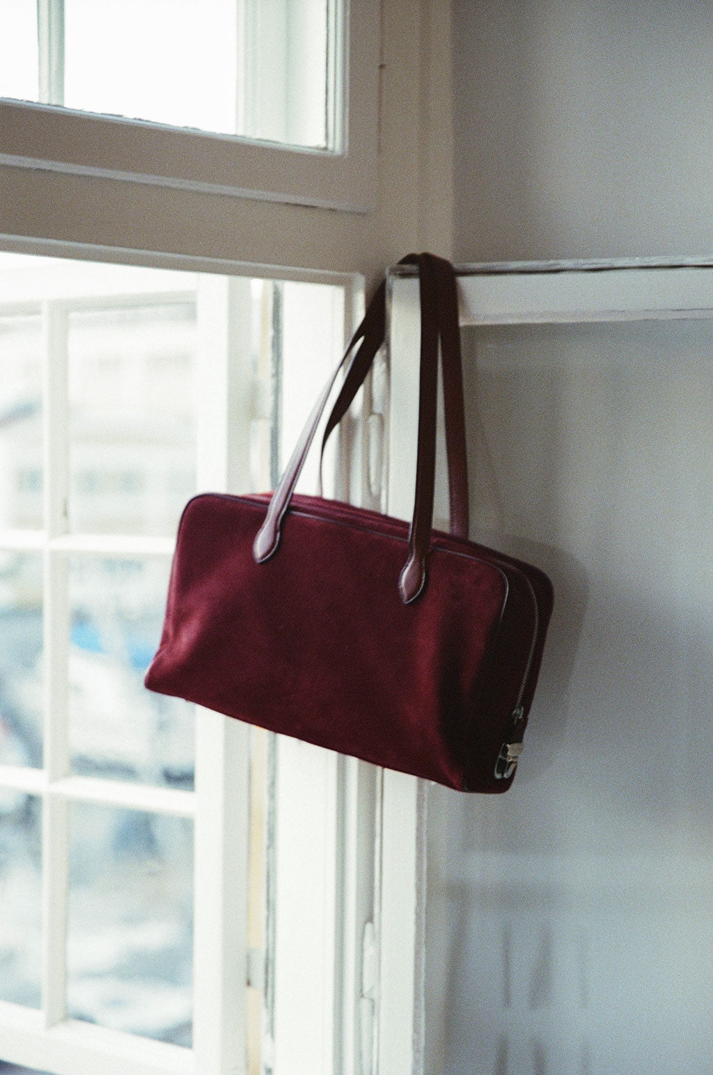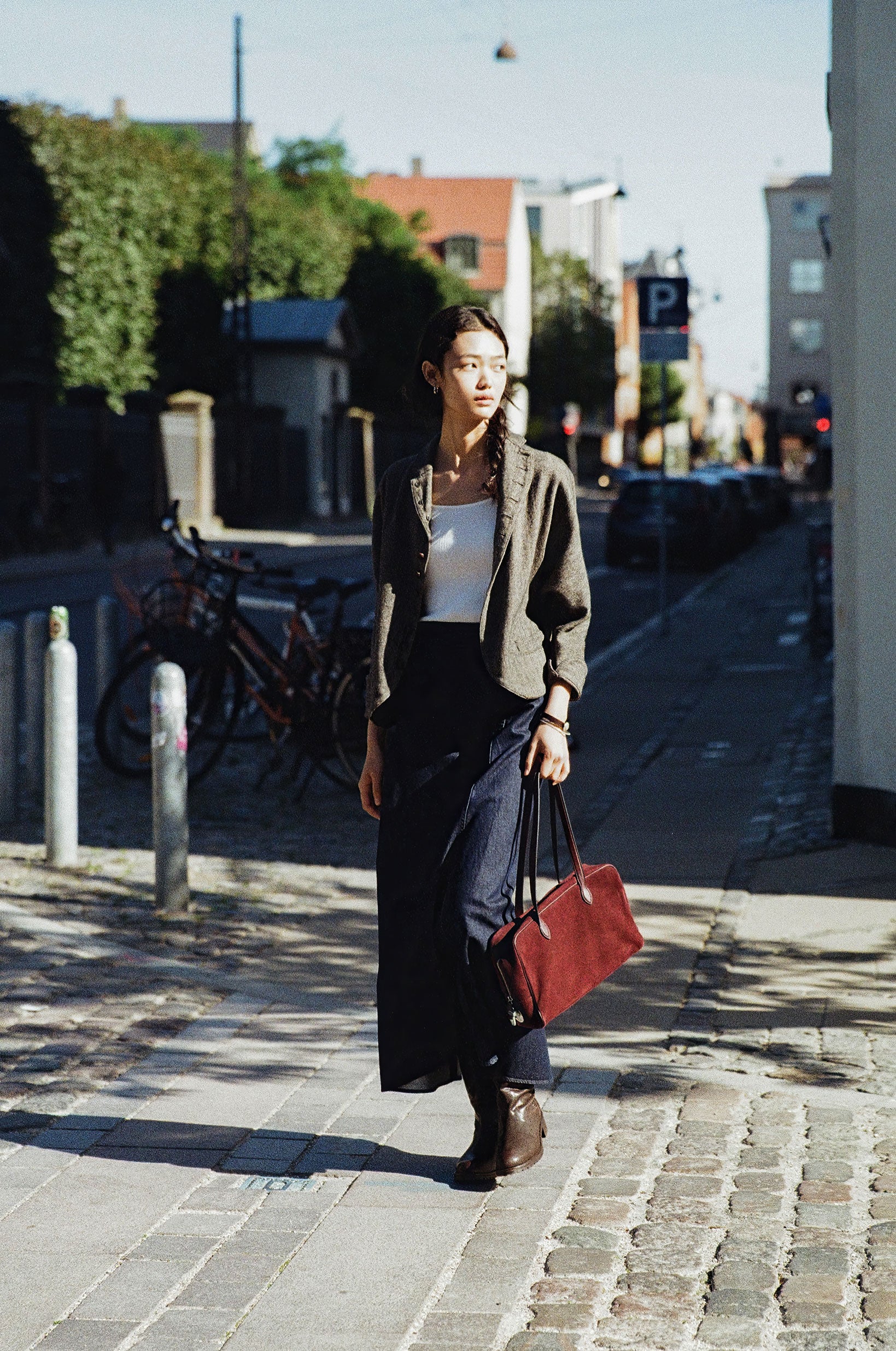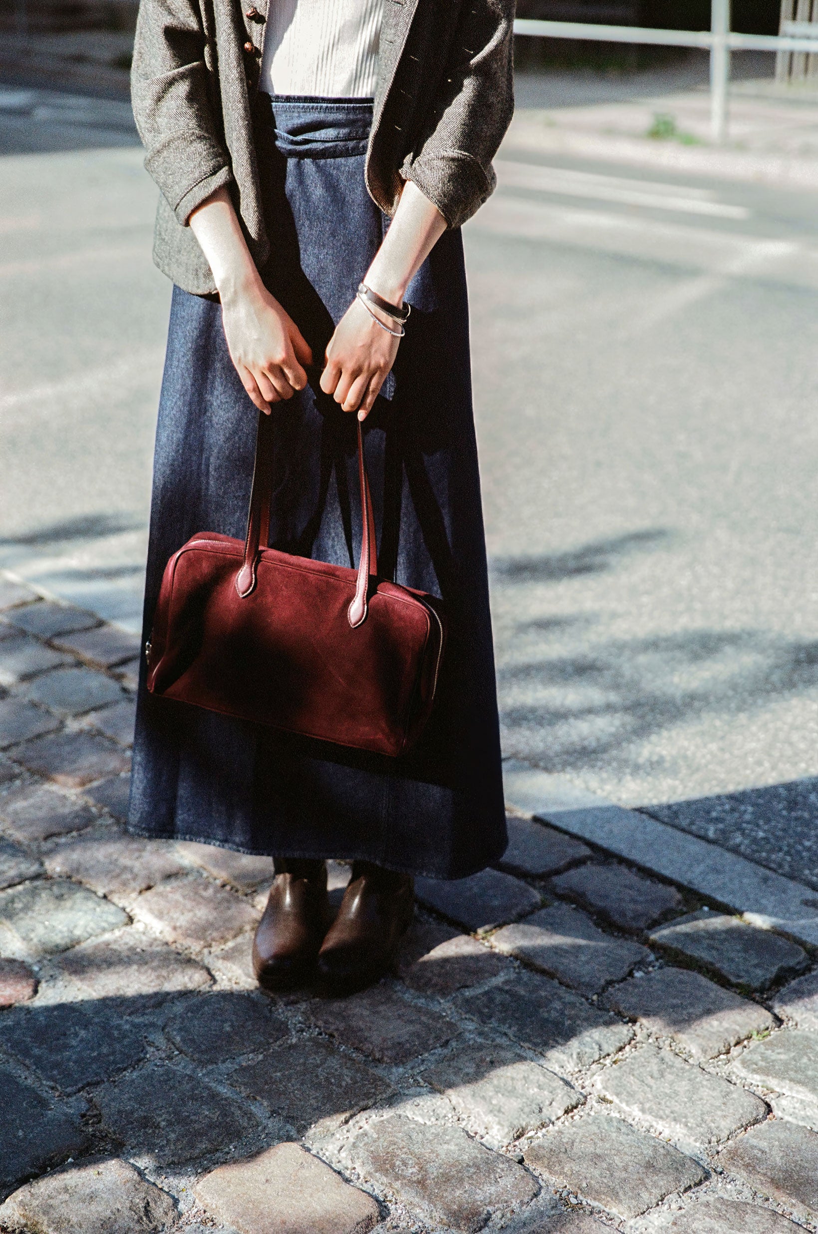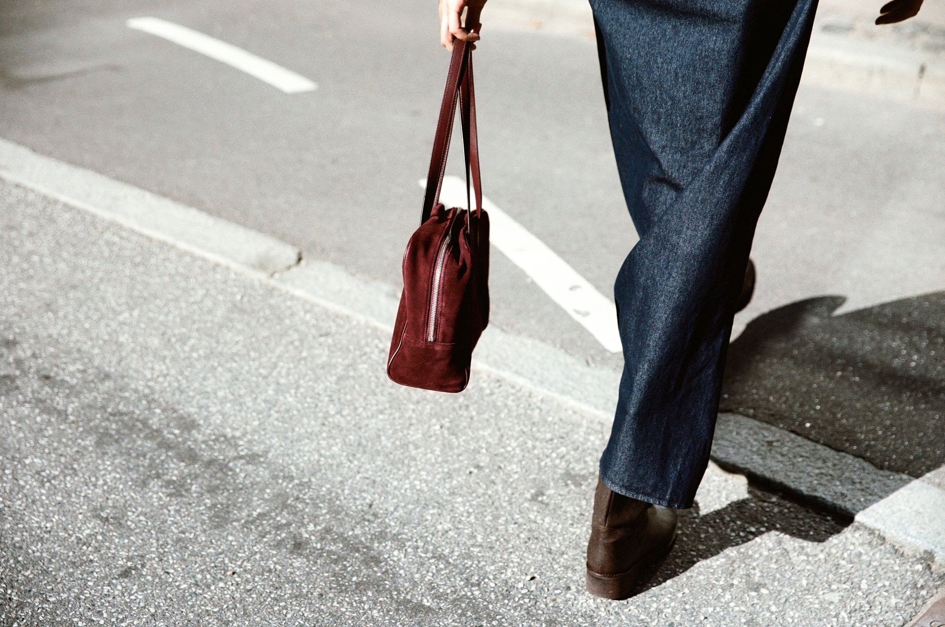 This is the long strap version of the original LOQUET bag and can also be worn over the shoulder. The goat suede stands out with its subtle color that changes depending on the light, and its soft finish allows for a natural shape and comfortable fit when used as a shoulder bag. The strap section is crafted from cowhide to enhance durability, and the leather trim along the edges stabilizes the bag's shape. The lining, made from thick linen-cotton, coupled with the wide-opening zipper, provides ample storage capacity while maintaining a lightweight.