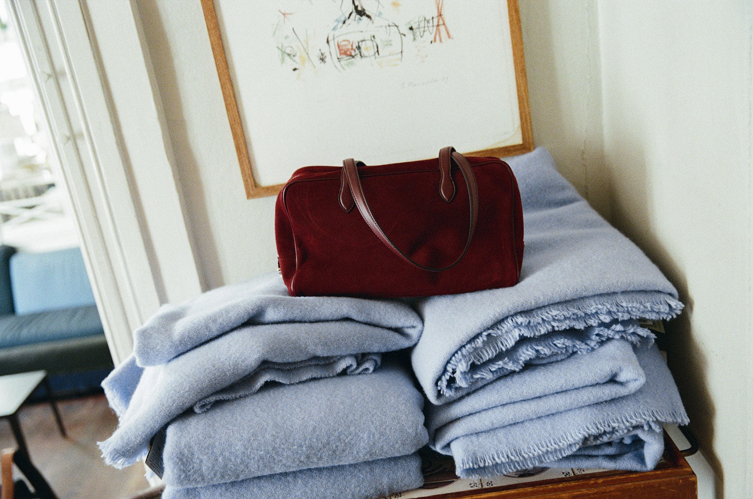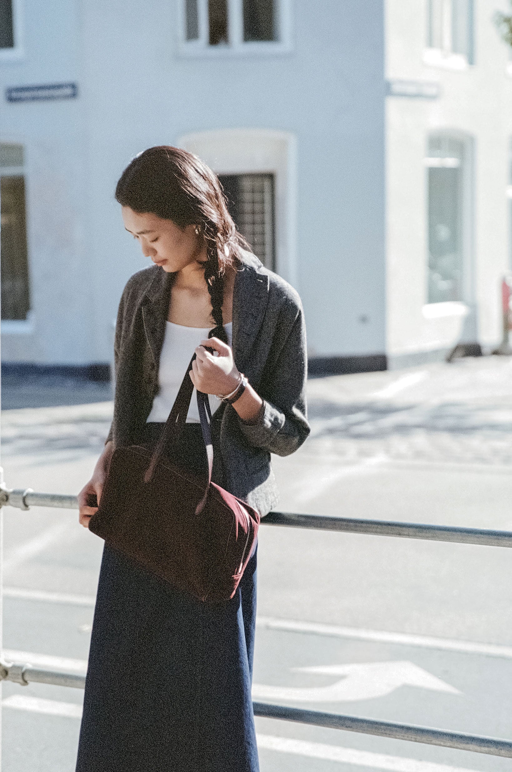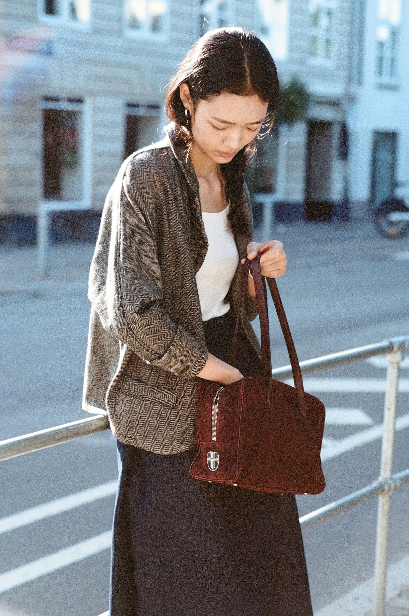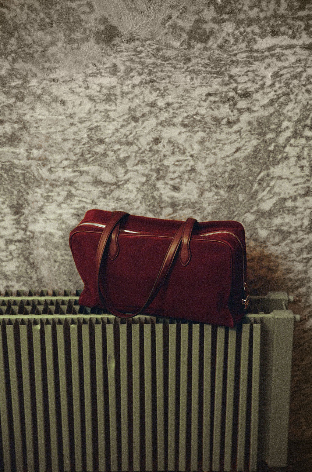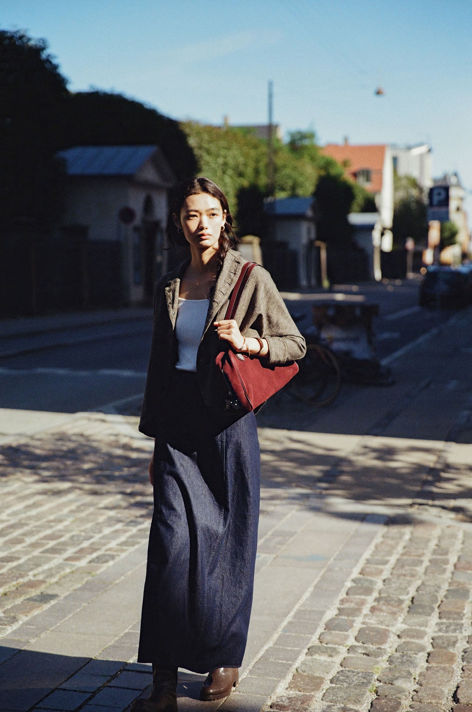 This is the long strap version of the original LOQUET bag and can also be worn over the shoulder. The goat suede stands out with its subtle color that changes depending on the light, and its soft finish allows for a natural shape and comfortable fit when used as a shoulder bag. The strap section is crafted from cowhide to enhance durability, and the leather trim along the edges stabilizes the bag's shape. The lining, made from thick linen-cotton, coupled with the wide-opening zipper, provides ample storage capacity while maintaining a lightweight.