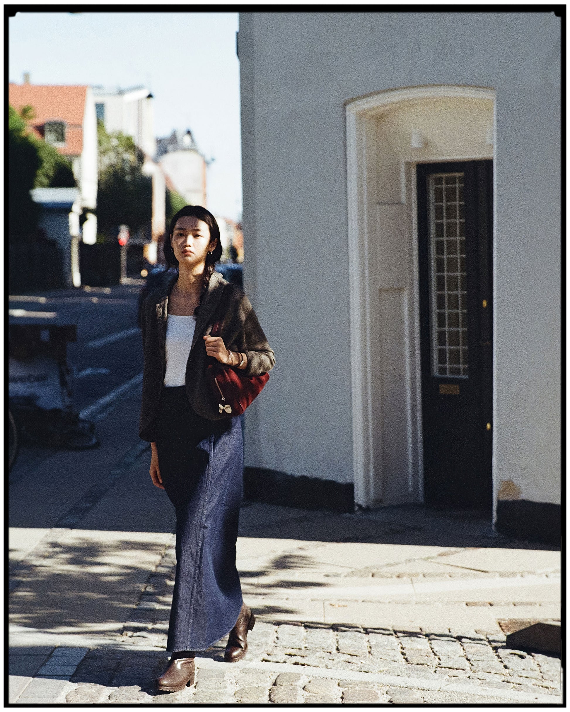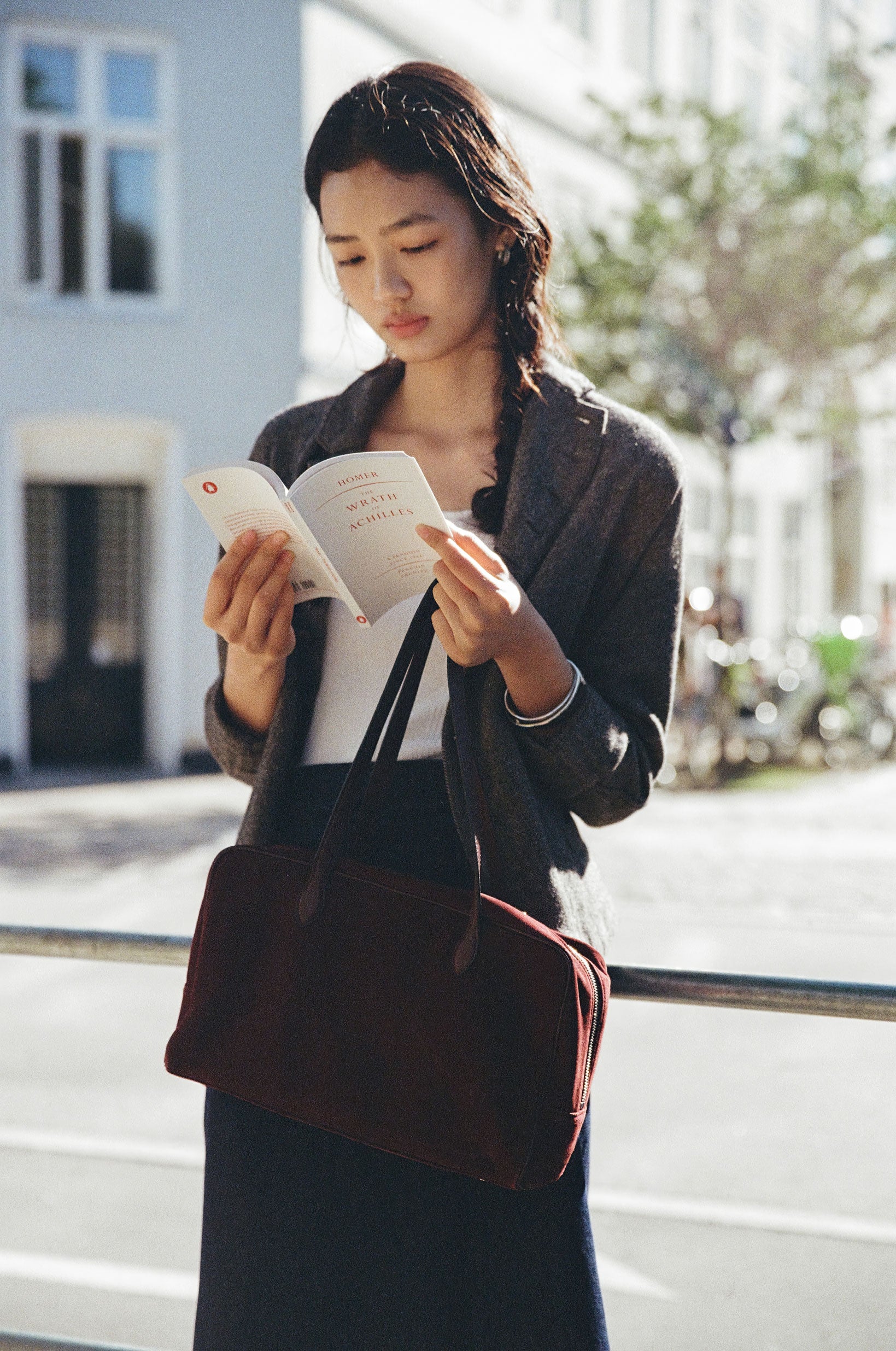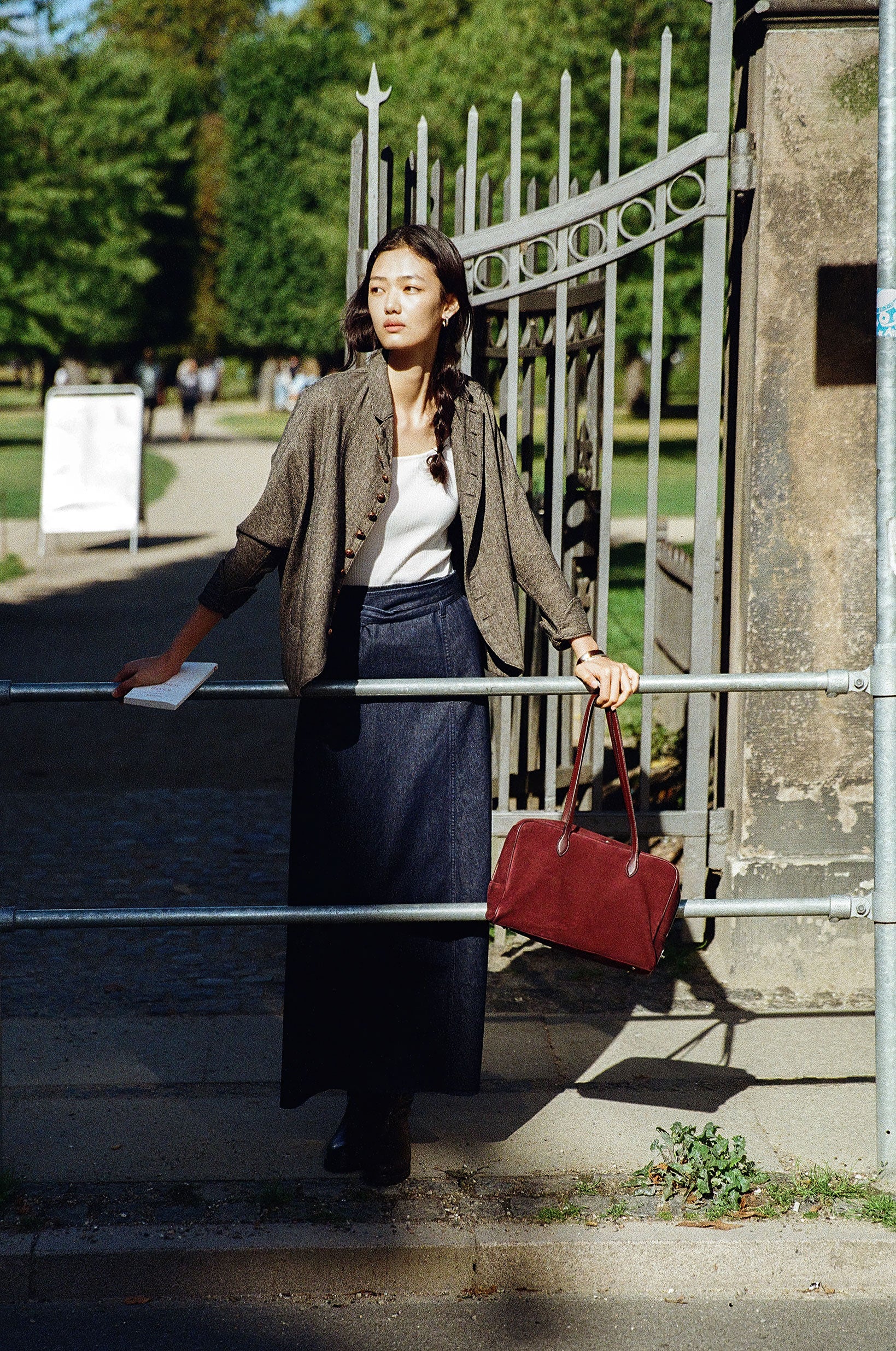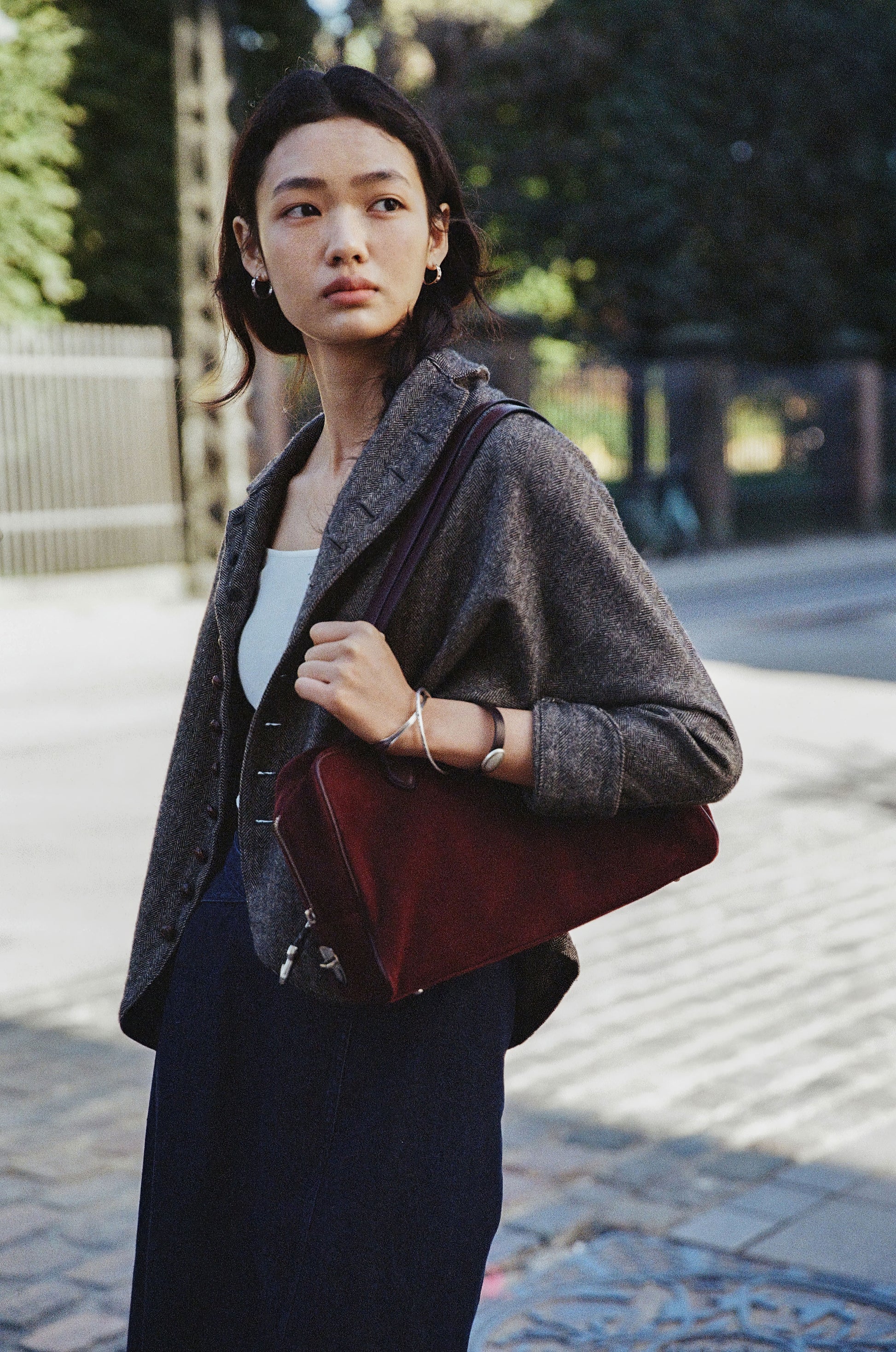 This is the long strap version of the original LOQUET bag and can also be worn over the shoulder. The goat suede stands out with its subtle color that changes depending on the light, and its soft finish allows for a natural shape and comfortable fit when used as a shoulder bag. The strap section is crafted from cowhide to enhance durability, and the leather trim along the edges stabilizes the bag's shape. The lining, made from thick linen-cotton, coupled with the wide-opening zipper, provides ample storage capacity while maintaining a lightweight.