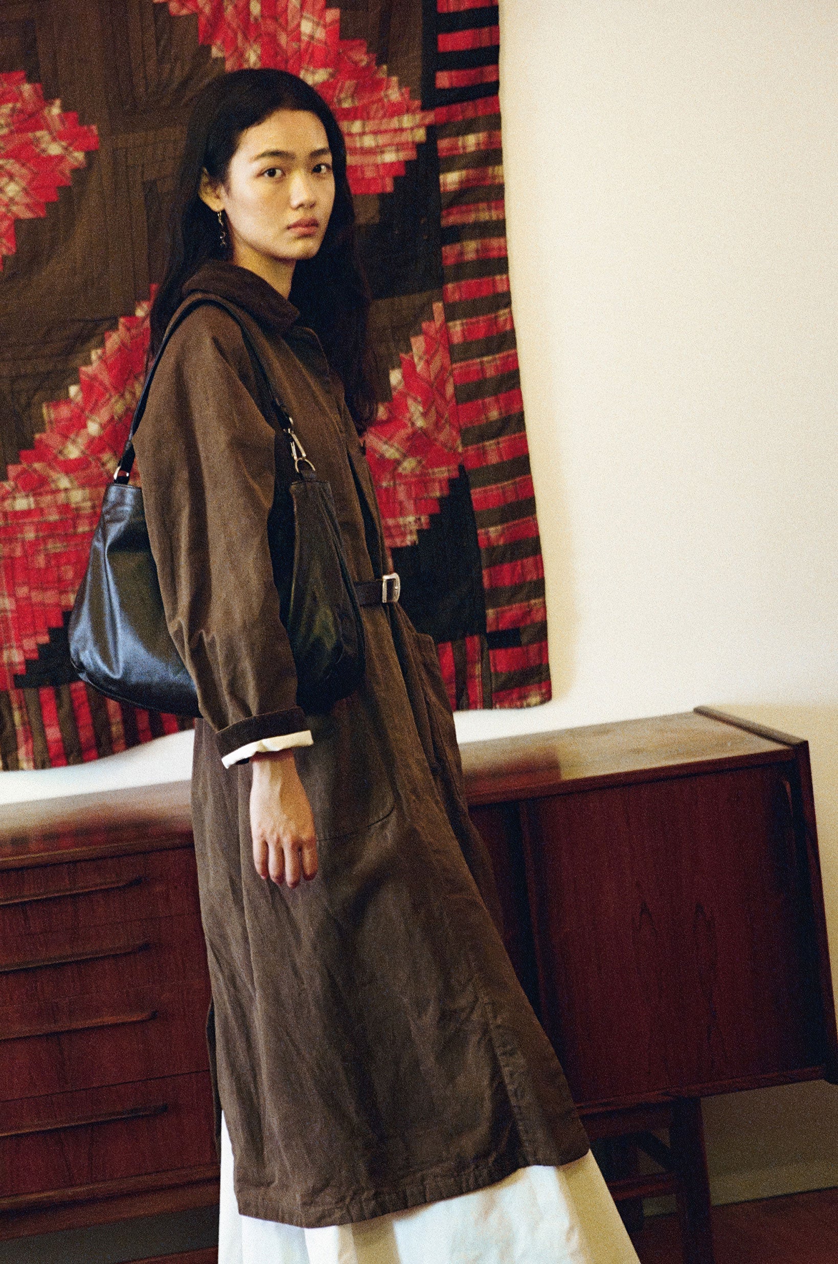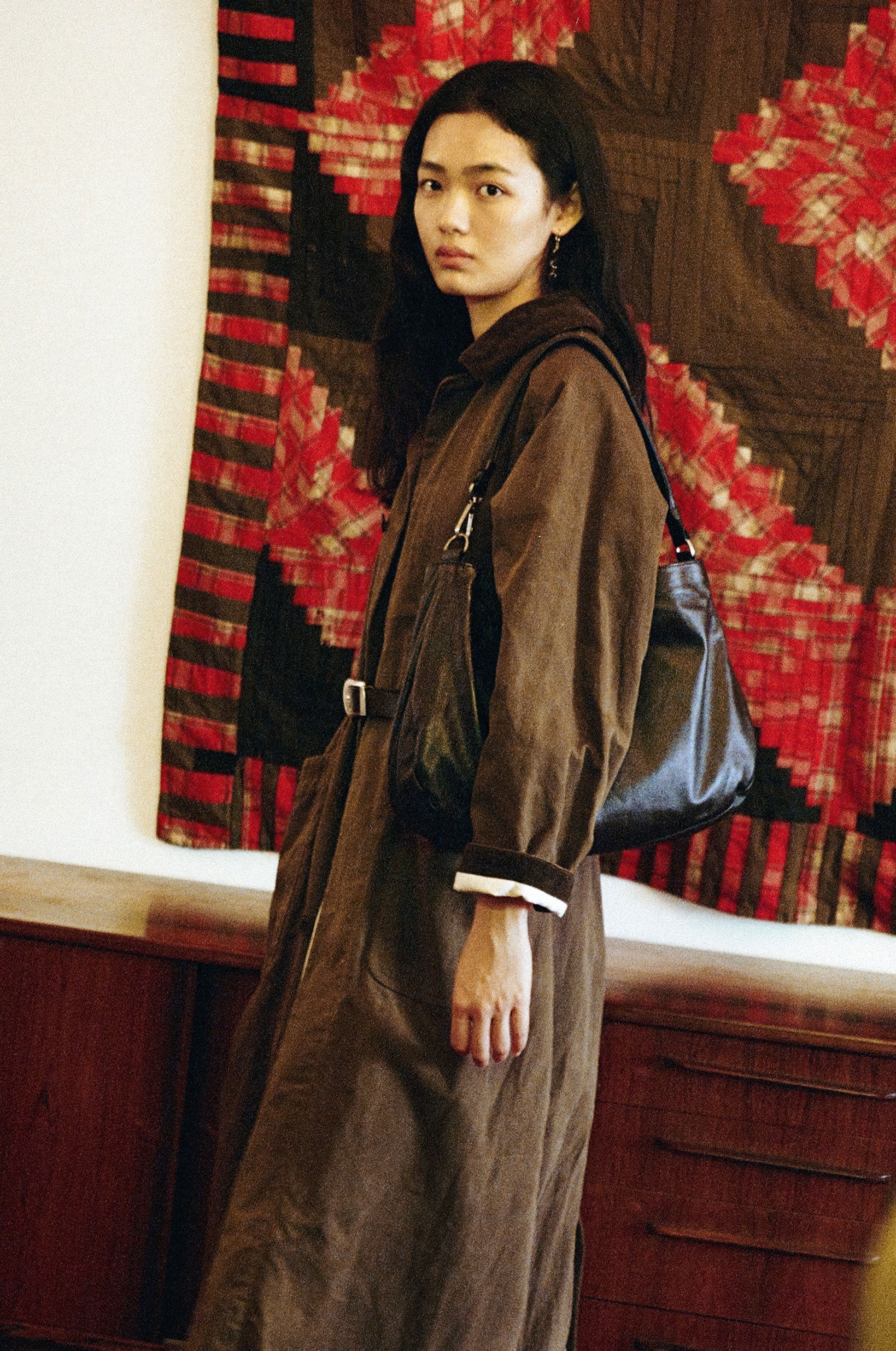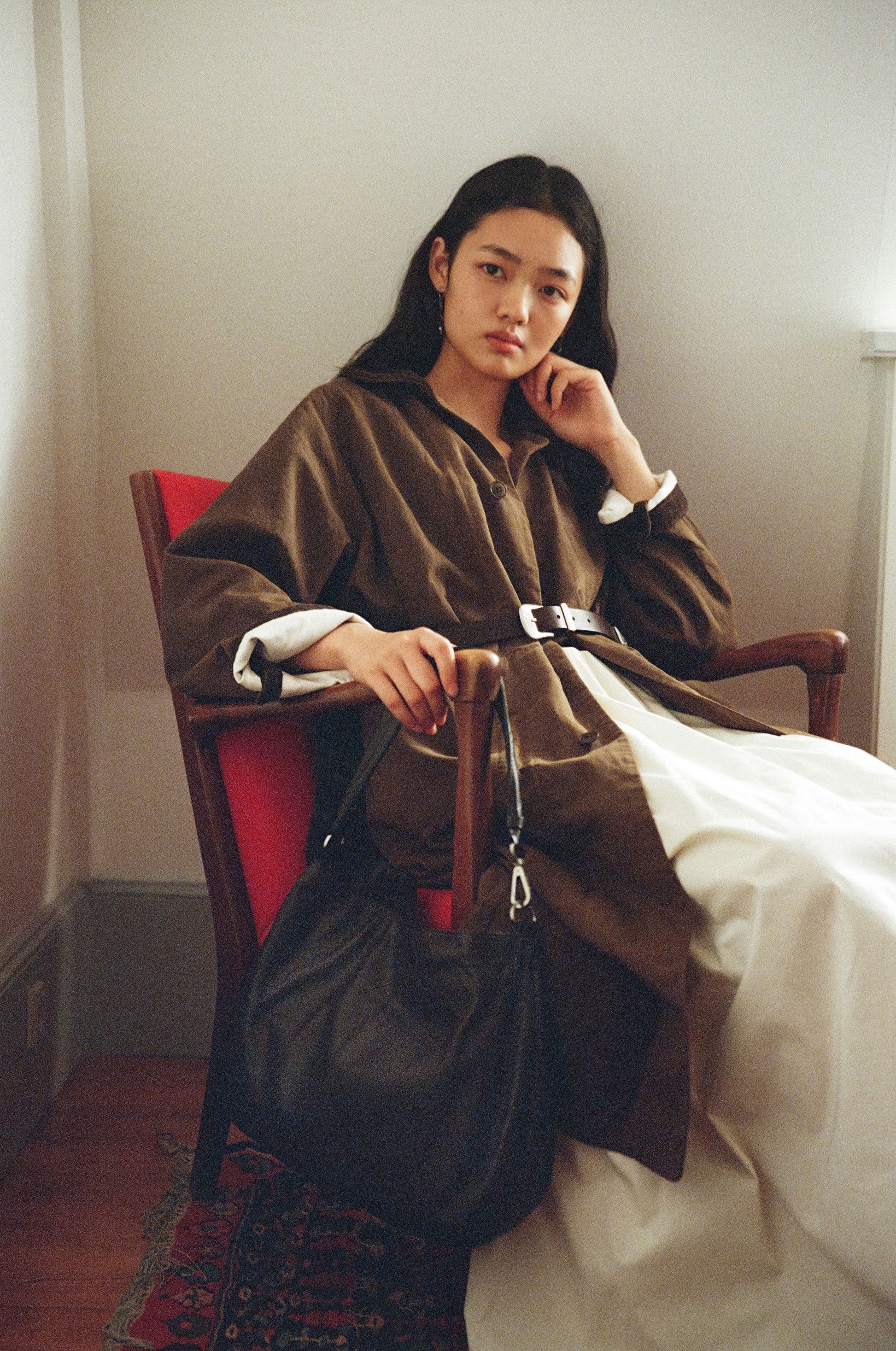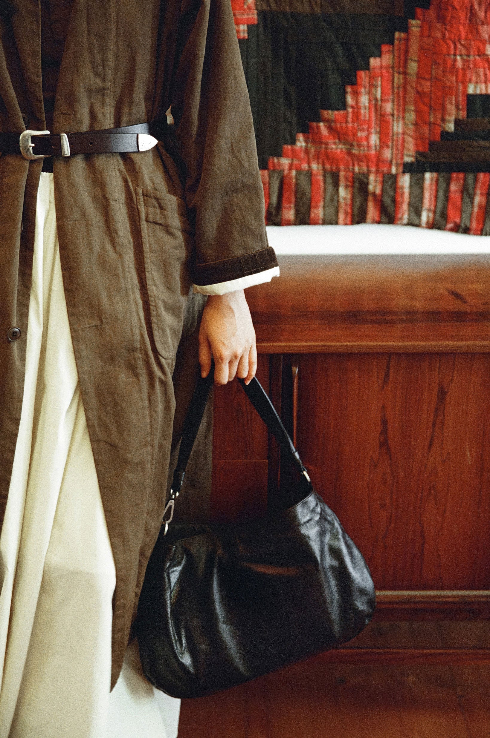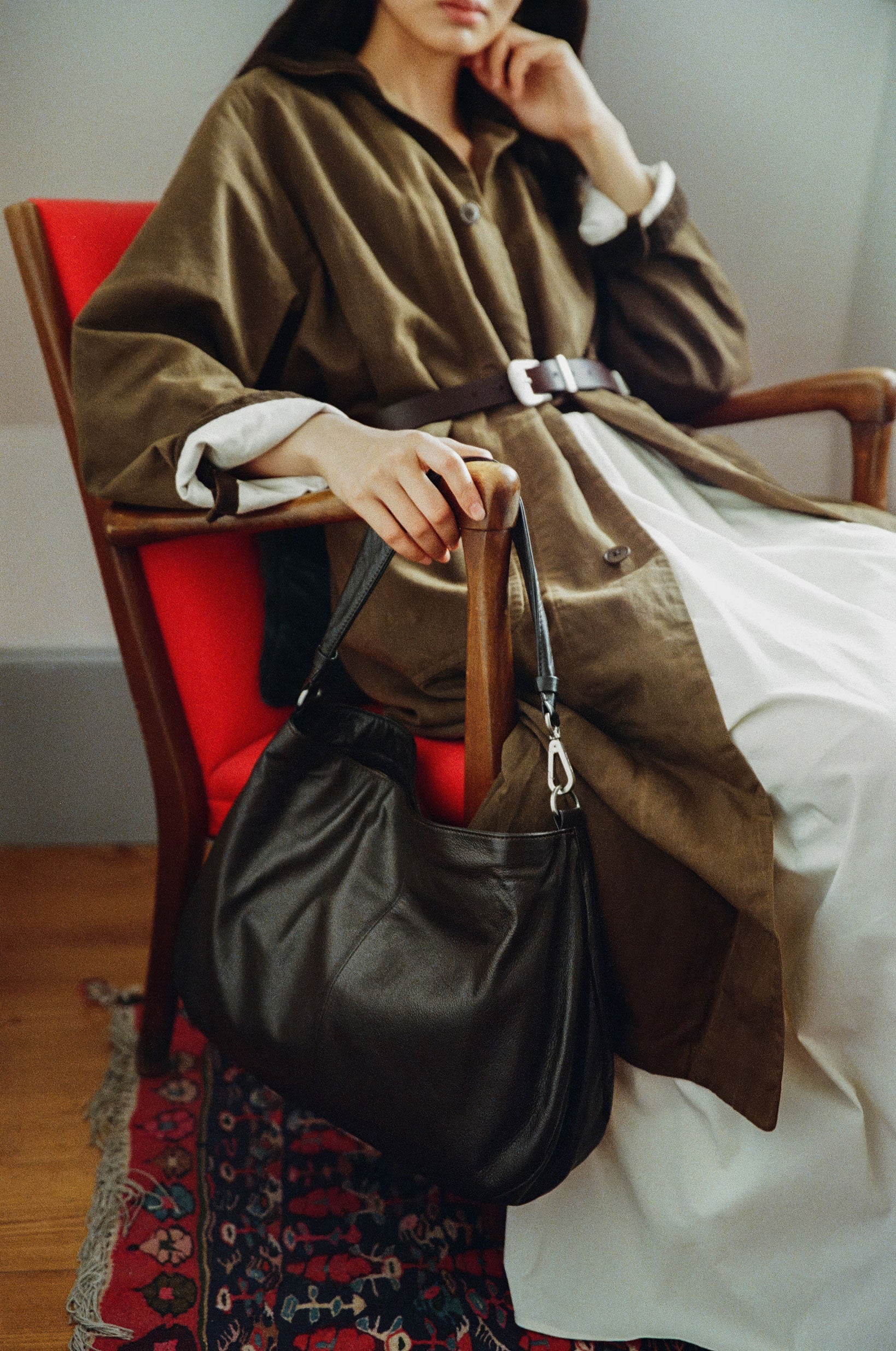 The NACELLE bag, inspired by the French word 'Nacelle' meaning small ship, is a hobo bag made of soft and flexible leather. The leather, with a soft feel, shapes itself according to the belongings being stored, and the double-layered strap provides a comfortable fit. At one end of the strap, a ring decoration with a engraved logo is used. The interior is divided into two compartments, and a zipper is attached to the center panel for storage. The nacelle bag, with its simple shape accented by buckle decorations and incisions, is lightweight and complements any outfit in any season.