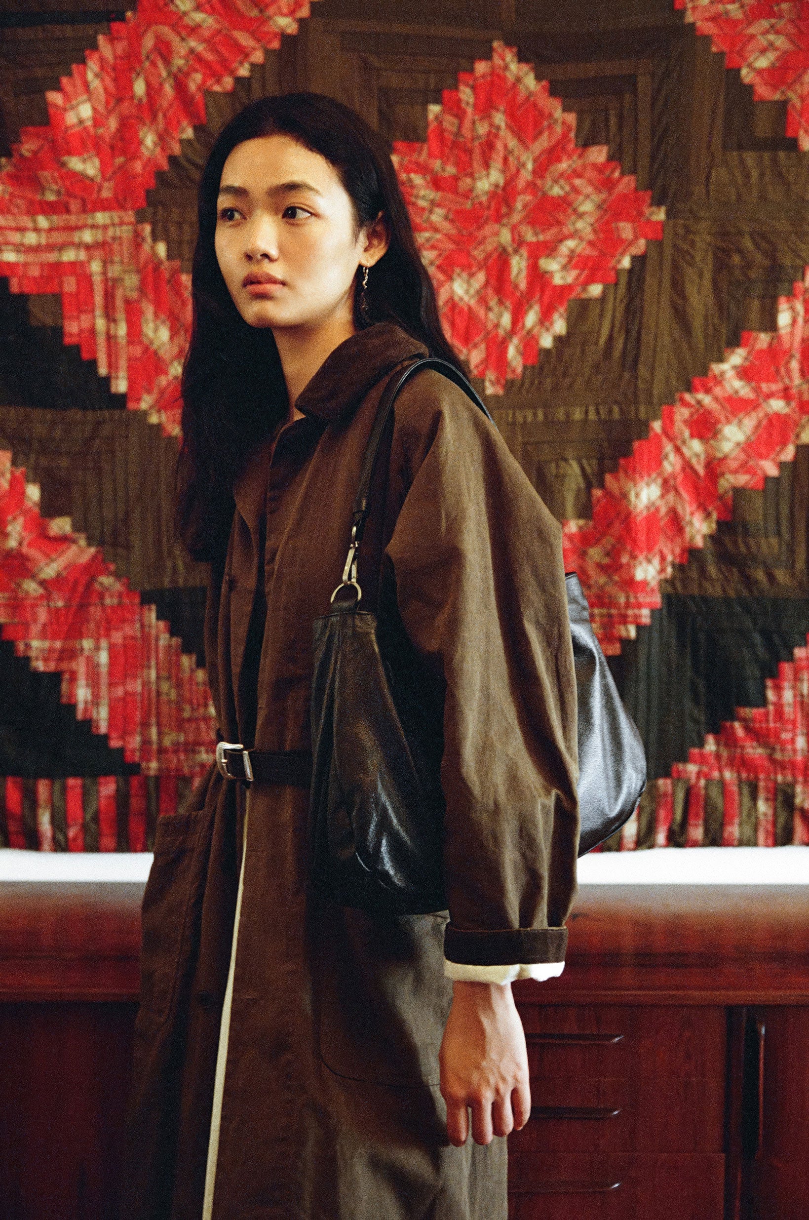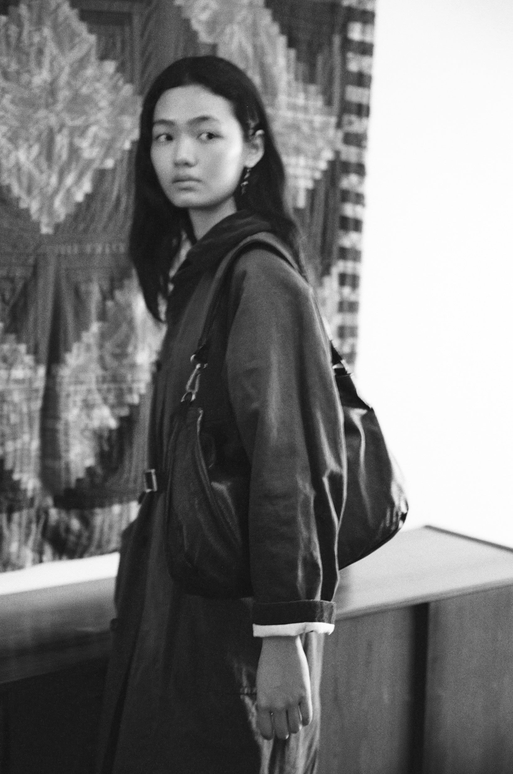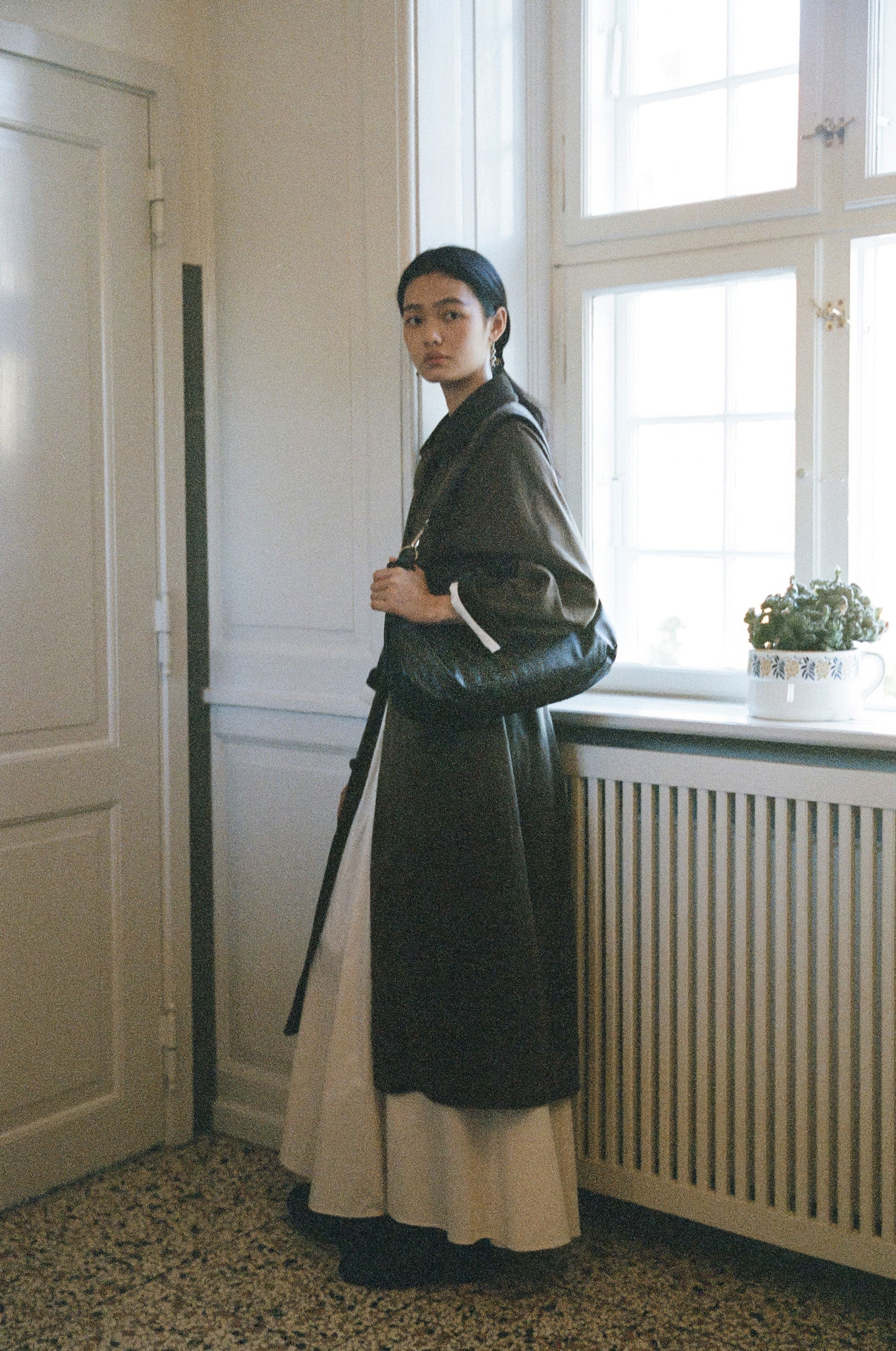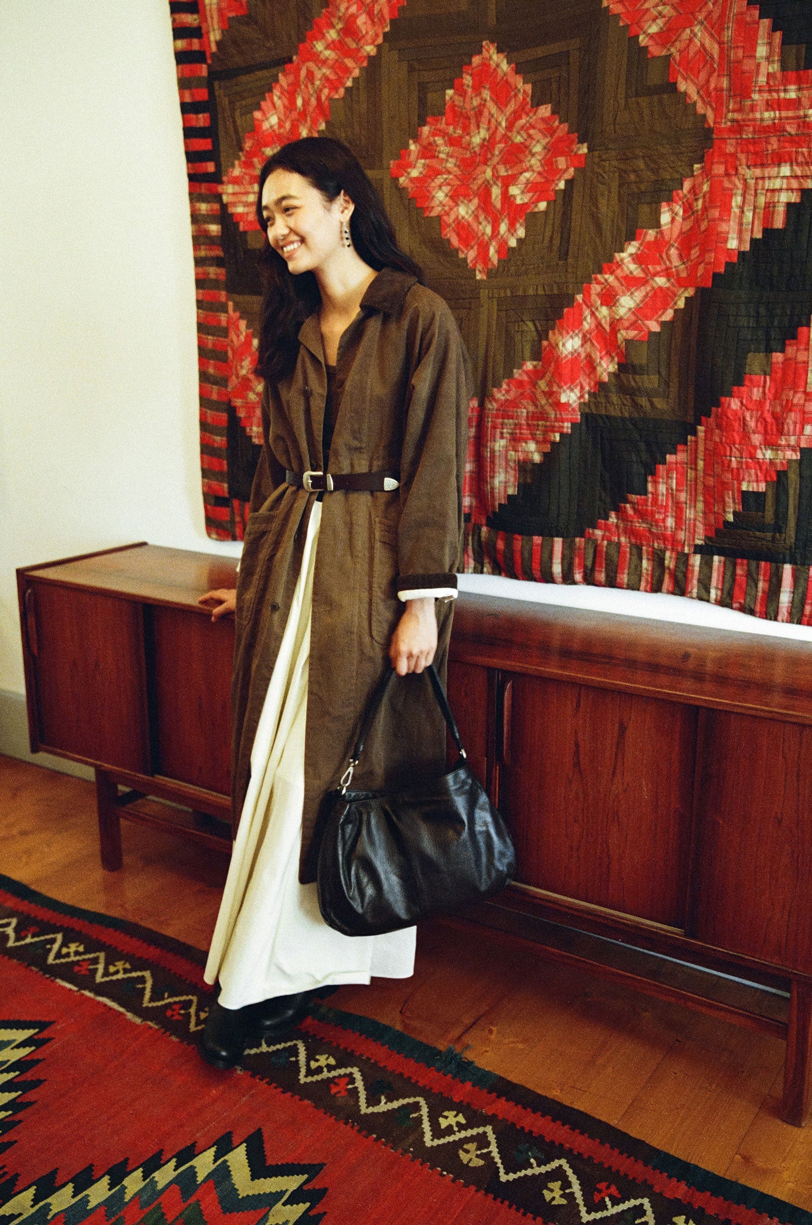The NACELLE bag, inspired by the French word 'Nacelle' meaning small ship, is a hobo bag made of soft and flexible leather. The leather, with a soft feel, shapes itself according to the belongings being stored, and the double-layered strap provides a comfortable fit. At one end of the strap, a ring decoration with a engraved logo is used. The interior is divided into two compartments, and a zipper is attached to the center panel for storage. The nacelle bag, with its simple shape accented by buckle decorations and incisions, is lightweight and complements any outfit in any season.