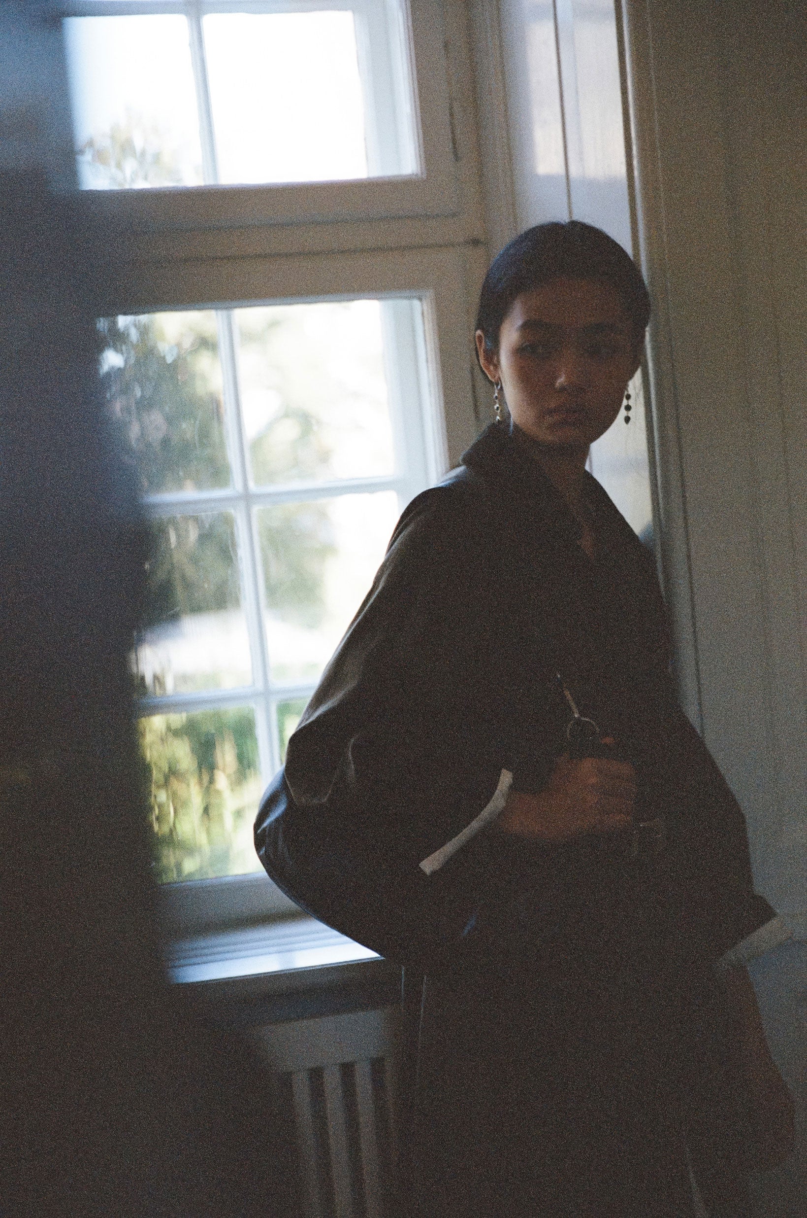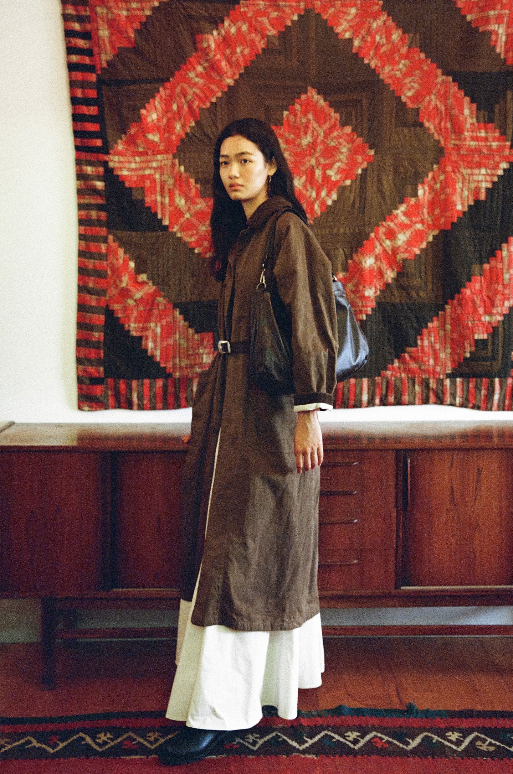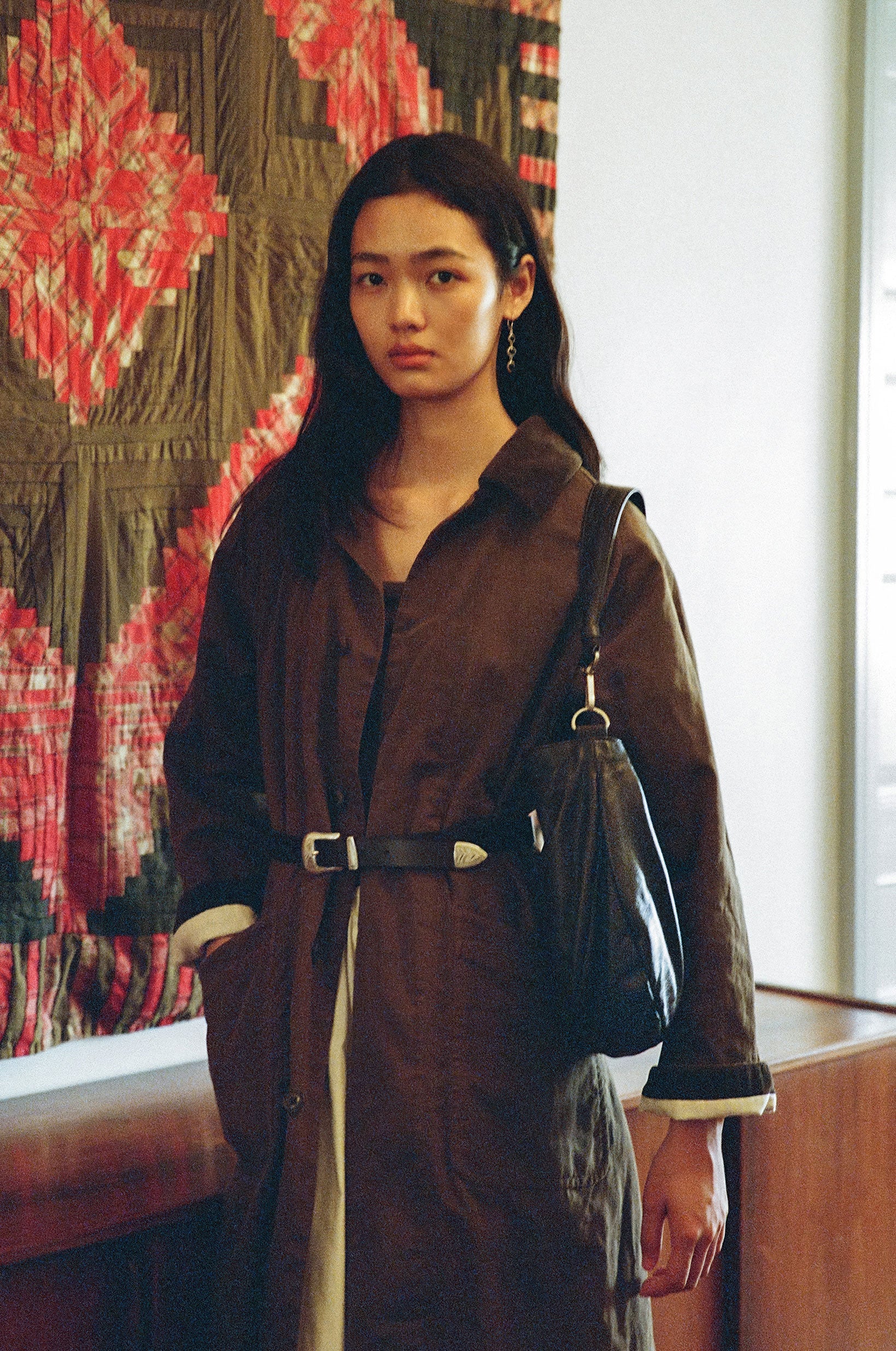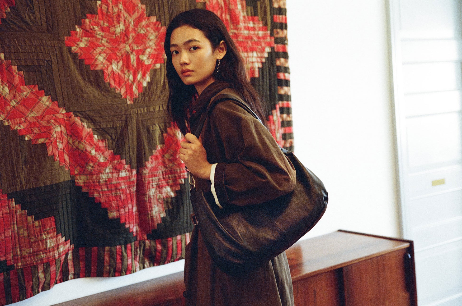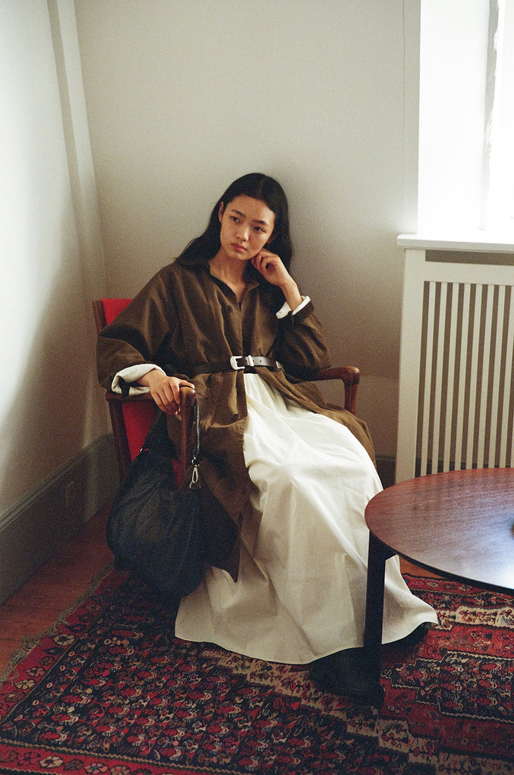 The NACELLE bag, inspired by the French word 'Nacelle' meaning small ship, is a hobo bag made of soft and flexible leather. The leather, with a soft feel, shapes itself according to the belongings being stored, and the double-layered strap provides a comfortable fit. At one end of the strap, a ring decoration with a engraved logo is used. The interior is divided into two compartments, and a zipper is attached to the center panel for storage. The nacelle bag, with its simple shape accented by buckle decorations and incisions, is lightweight and complements any outfit in any season.