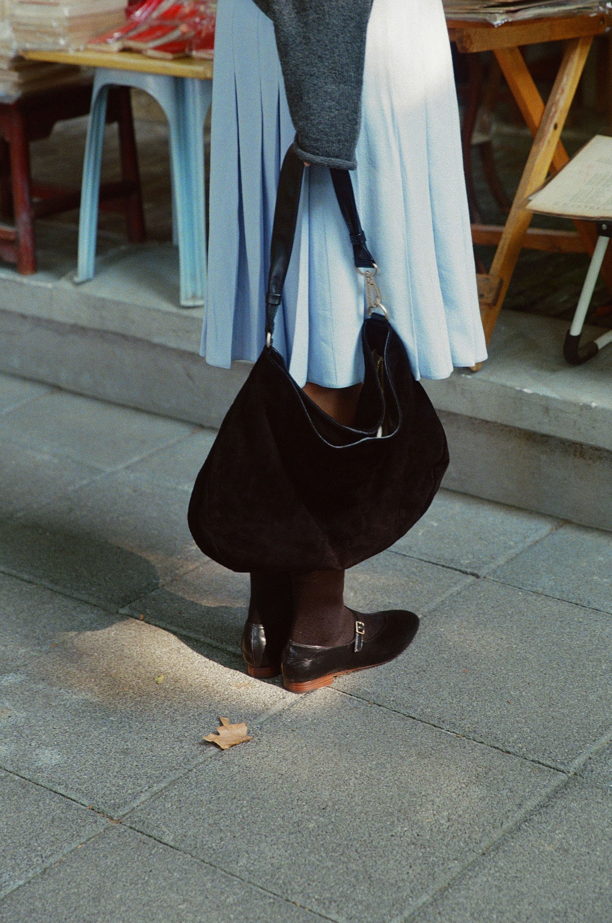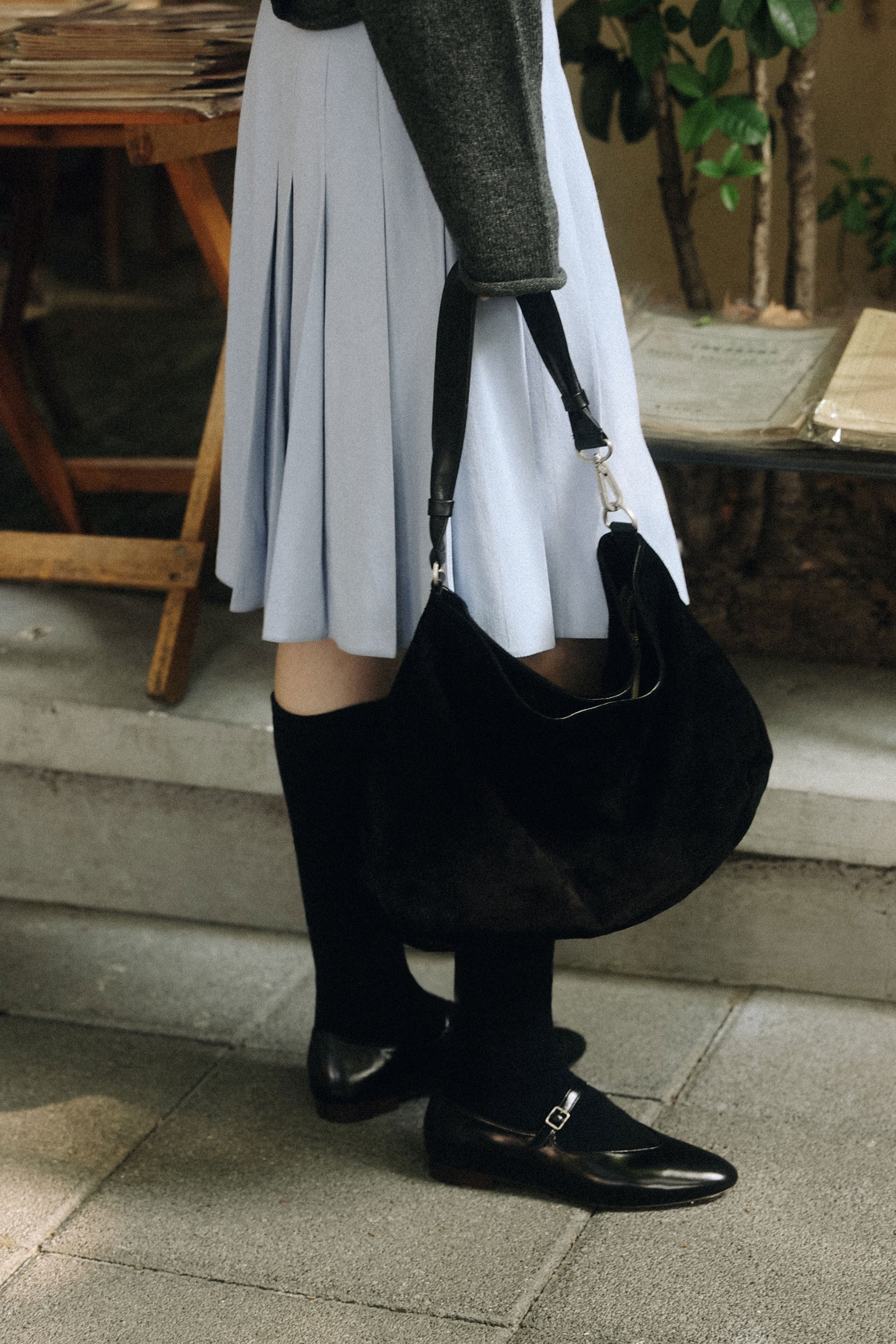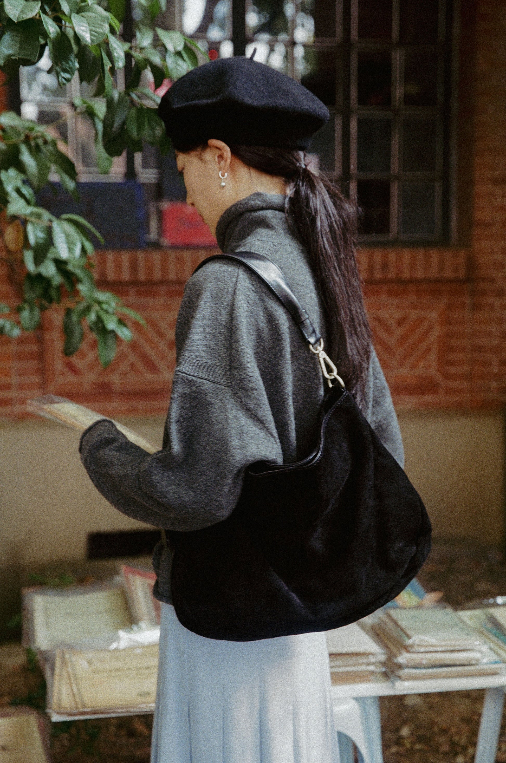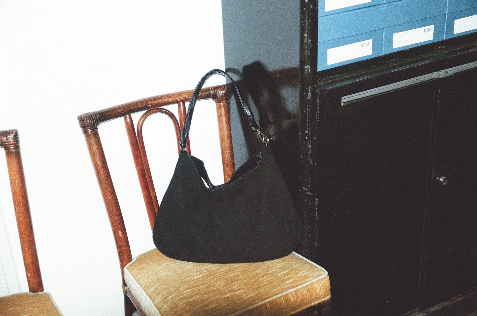 The NACELLE bag, inspired by the French word 'Nacelle' meaning small ship, is a hobo bag made of soft and flexible suede leather. The two-tone goat suede is beautifully soft, molding naturally to the shape of the items it carries. The double-layered strap provides a comfortable fit. At one end of the strap, a ring decoration with a engraved logo is used. The interior is divided into two compartments, and a zipper is attached to the center panel for storage. The nacelle bag, with its simple shape accented by buckle decorations and incisions, is lightweight and complements any outfit in any season.