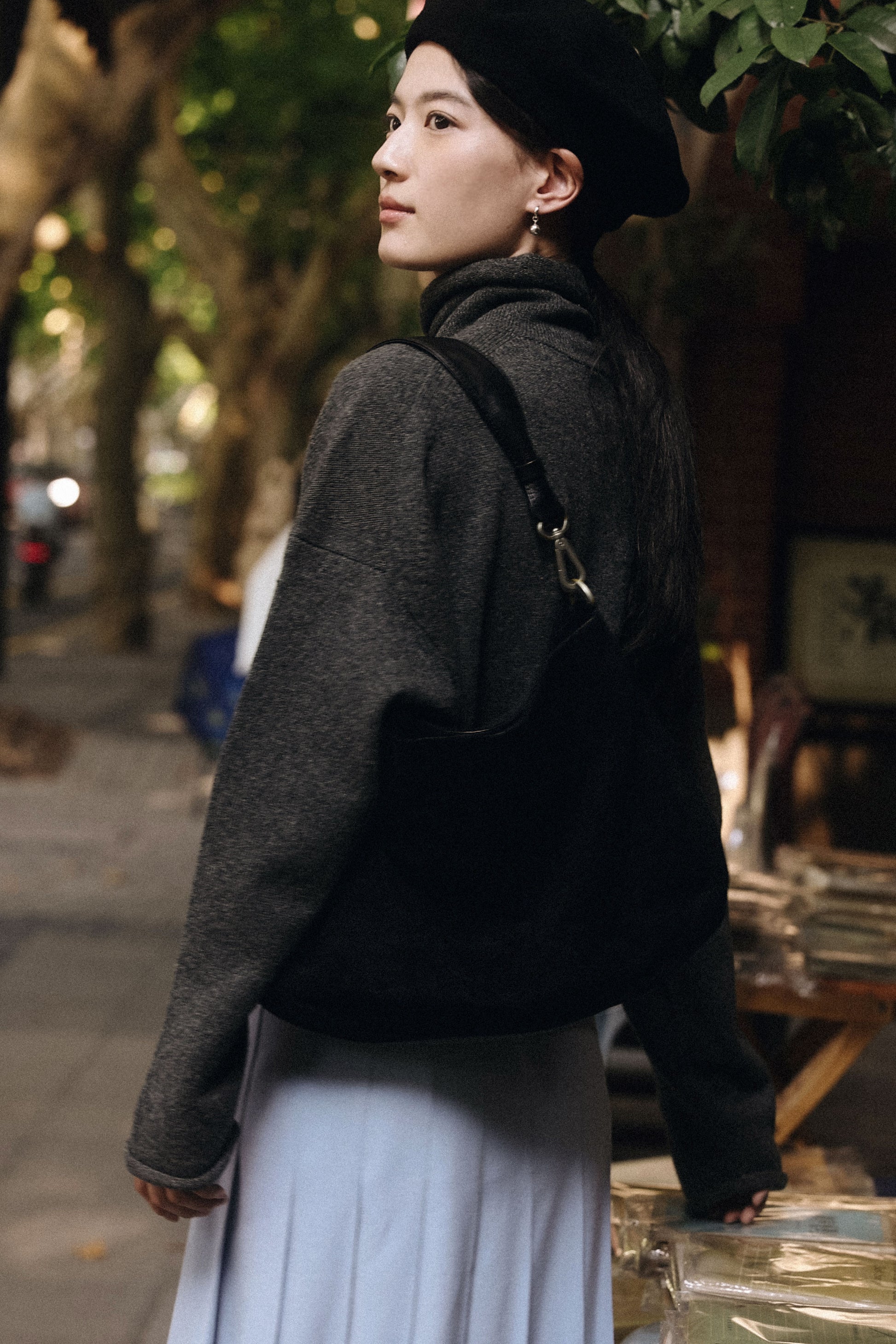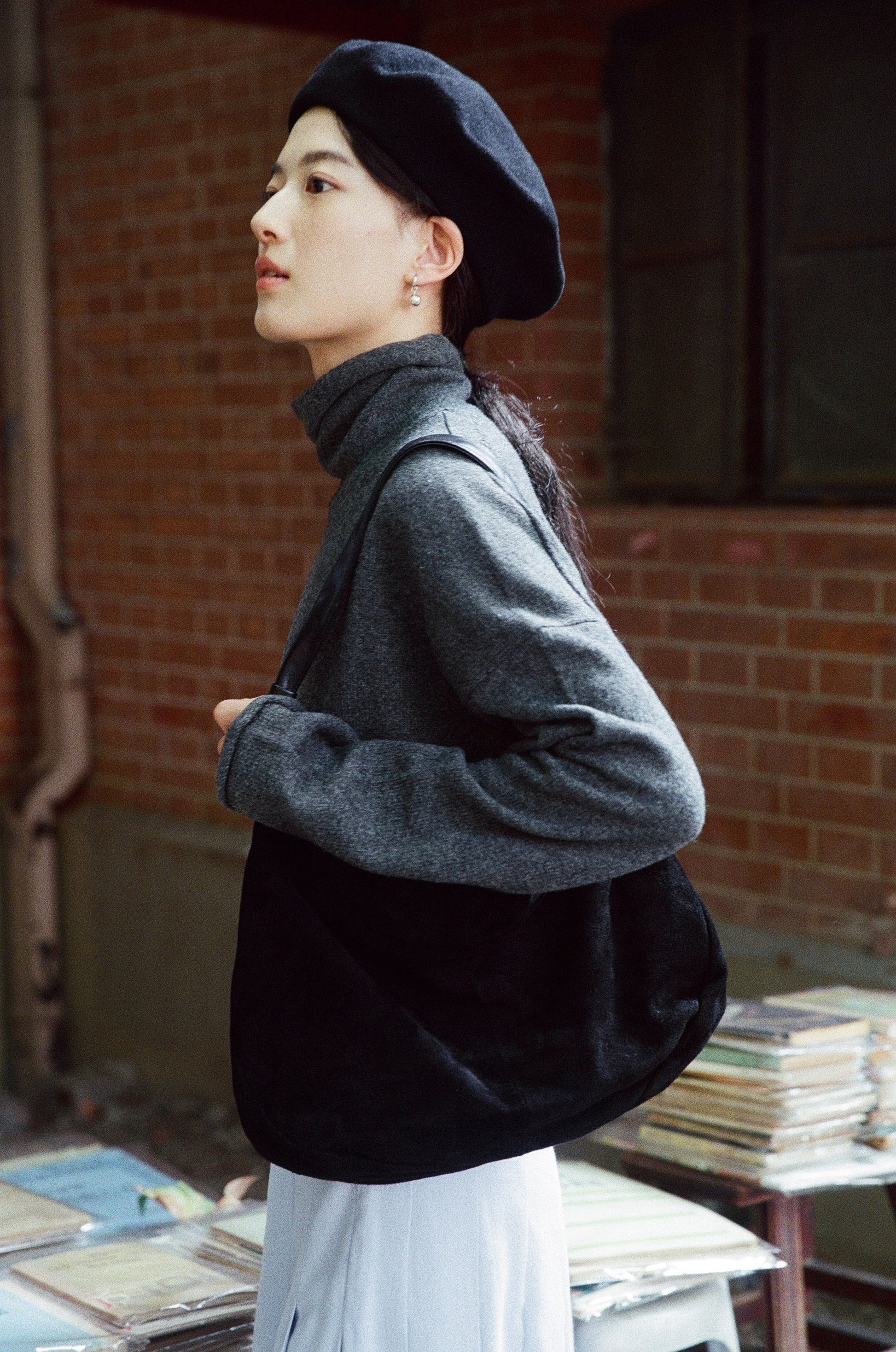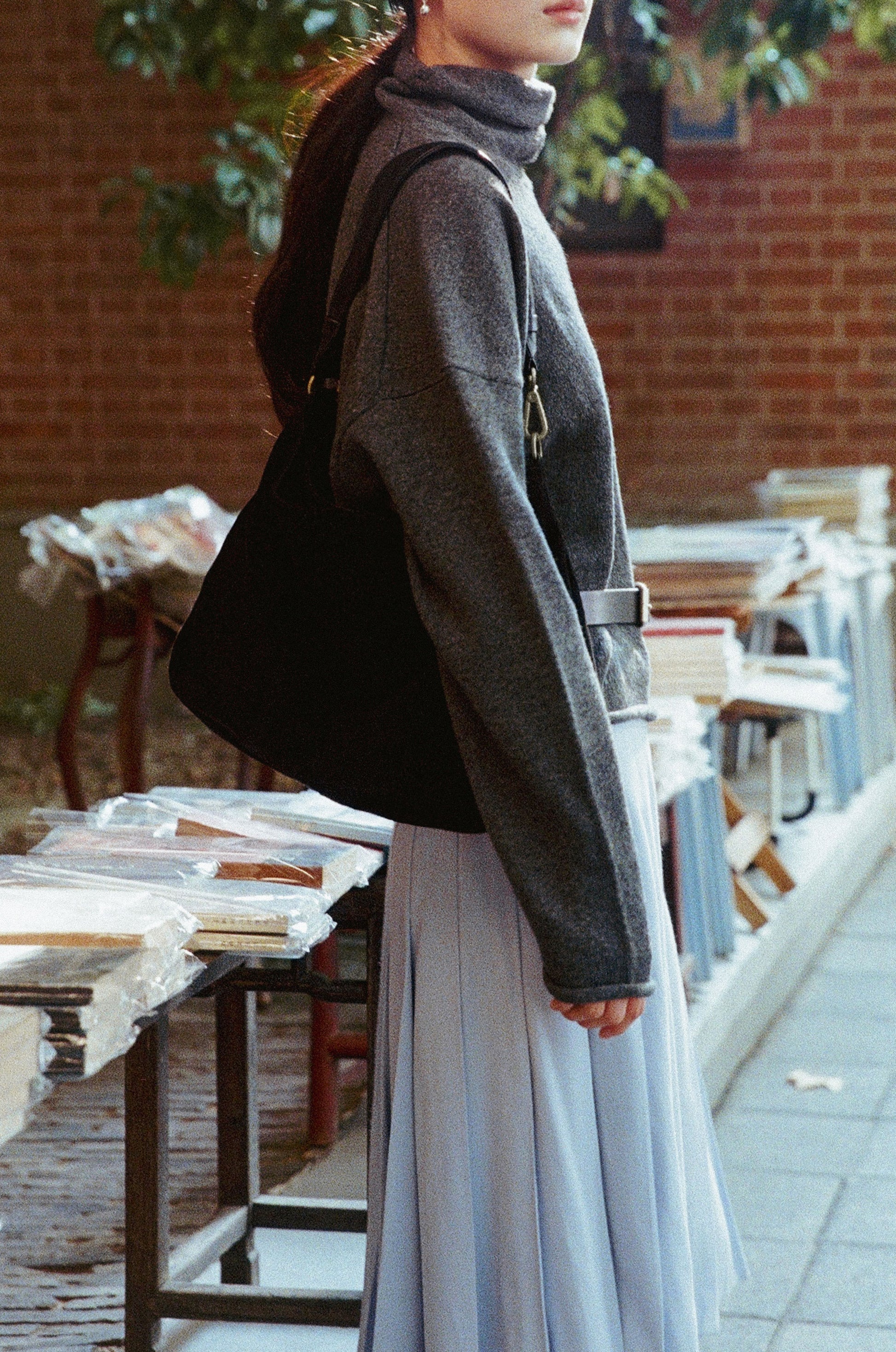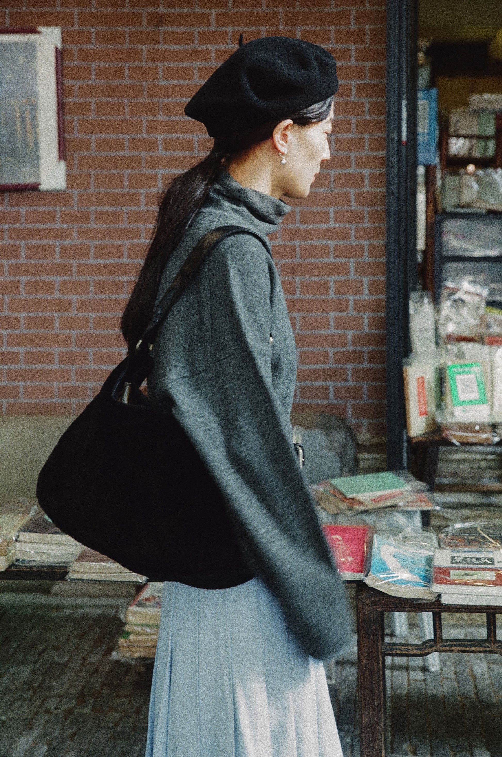 The NACELLE bag, inspired by the French word 'Nacelle' meaning small ship, is a hobo bag made of soft and flexible suede leather. The two-tone goat suede is beautifully soft, molding naturally to the shape of the items it carries. The double-layered strap provides a comfortable fit. At one end of the strap, a ring decoration with a engraved logo is used. The interior is divided into two compartments, and a zipper is attached to the center panel for storage. The nacelle bag, with its simple shape accented by buckle decorations and incisions, is lightweight and complements any outfit in any season.