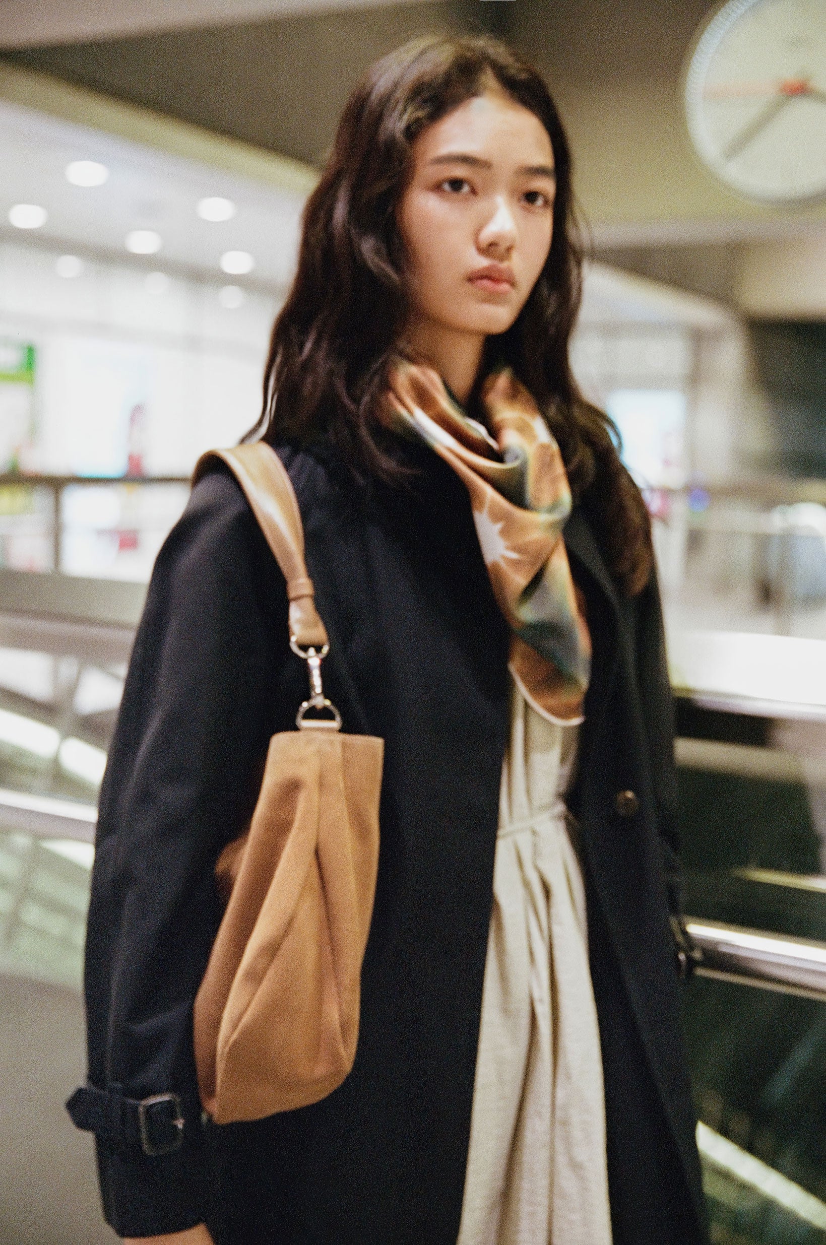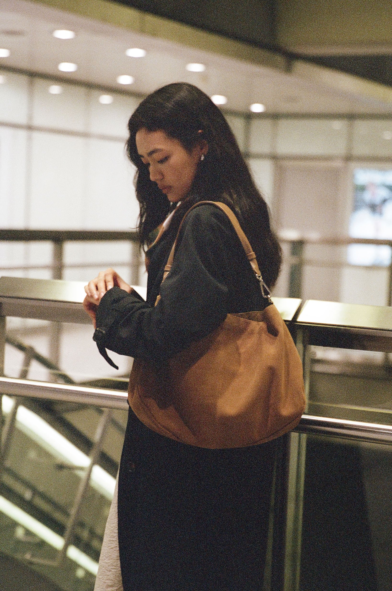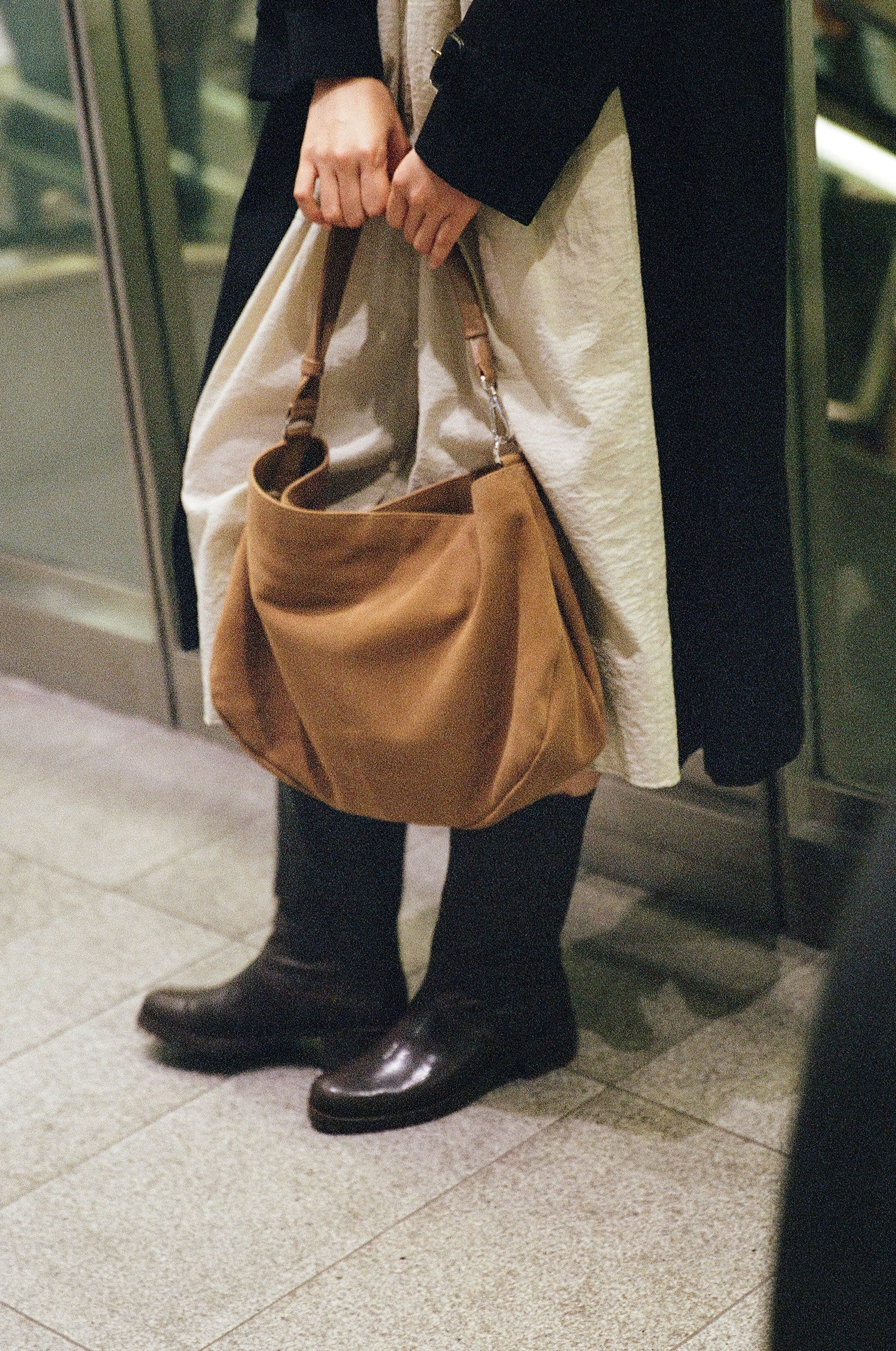 The NACELLE bag, inspired by the French word 'Nacelle' meaning small ship, is a hobo bag made of soft and flexible suede leather. The two-tone goat suede is beautifully soft, molding naturally to the shape of the items it carries. The double-layered strap provides a comfortable fit. At one end of the strap, a ring decoration with a engraved logo is used. The interior is divided into two compartments, and a zipper is attached to the center panel for storage. The nacelle bag, with its simple shape accented by buckle decorations and incisions, is lightweight and complements any outfit in any season.