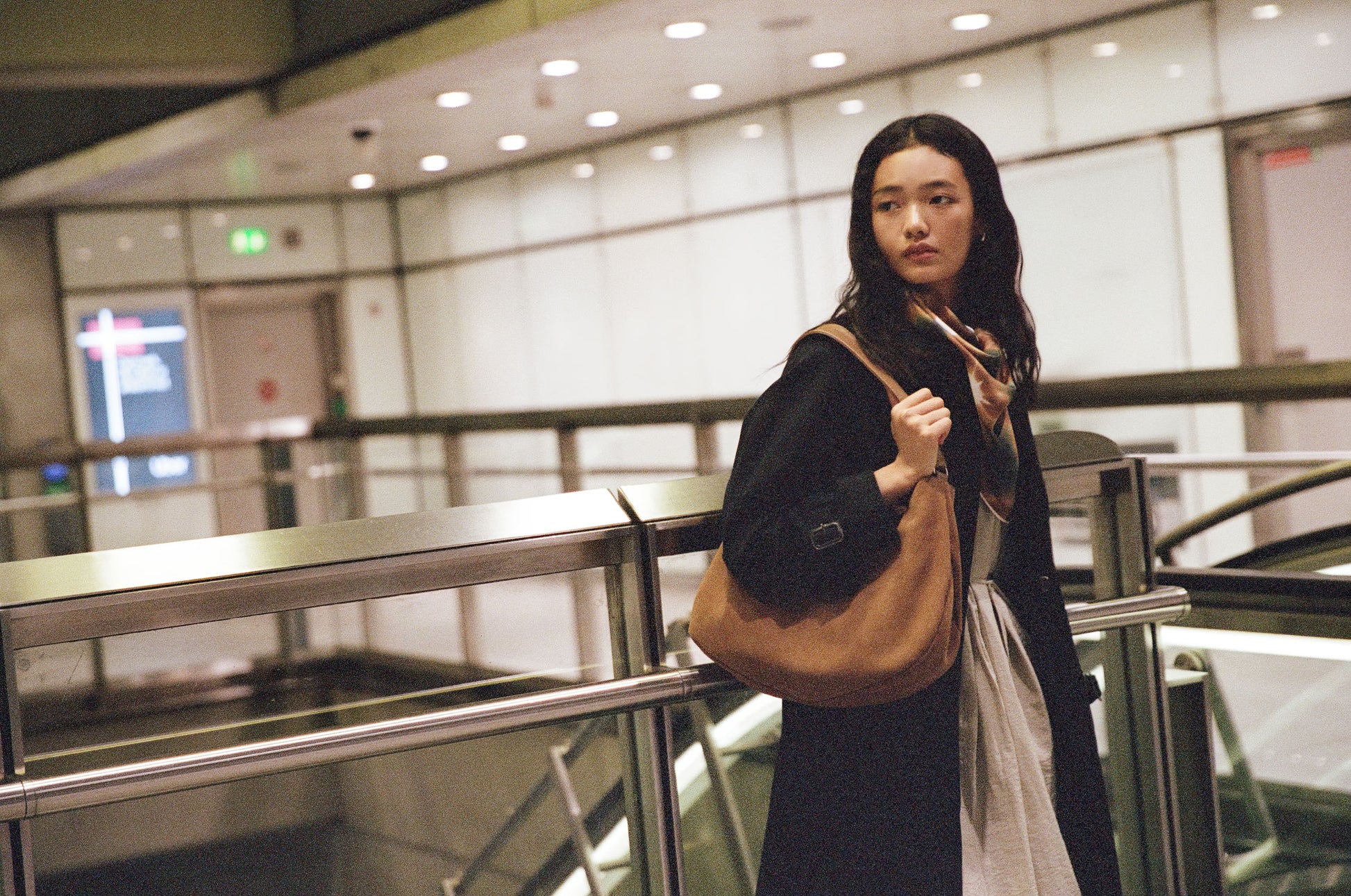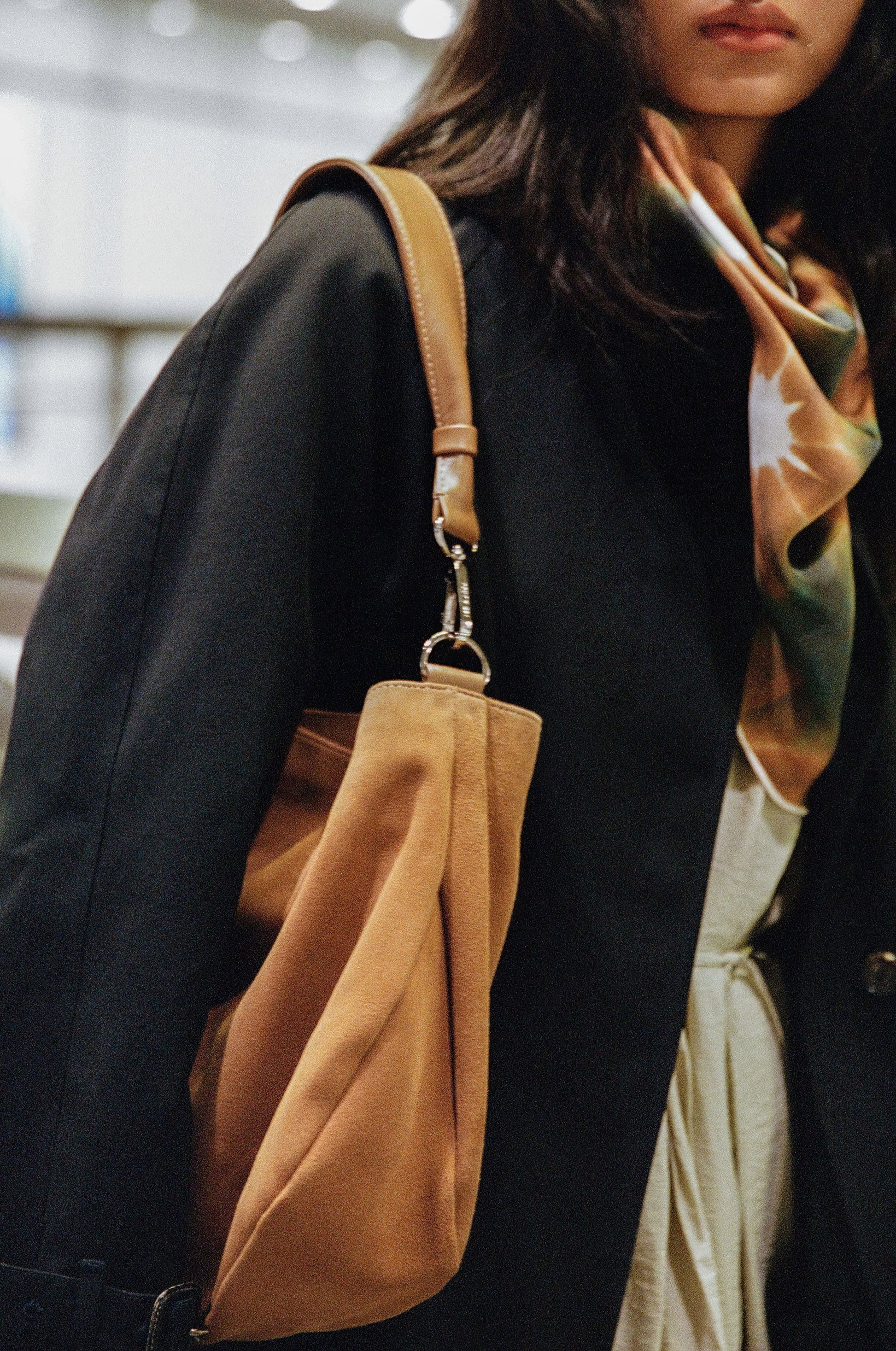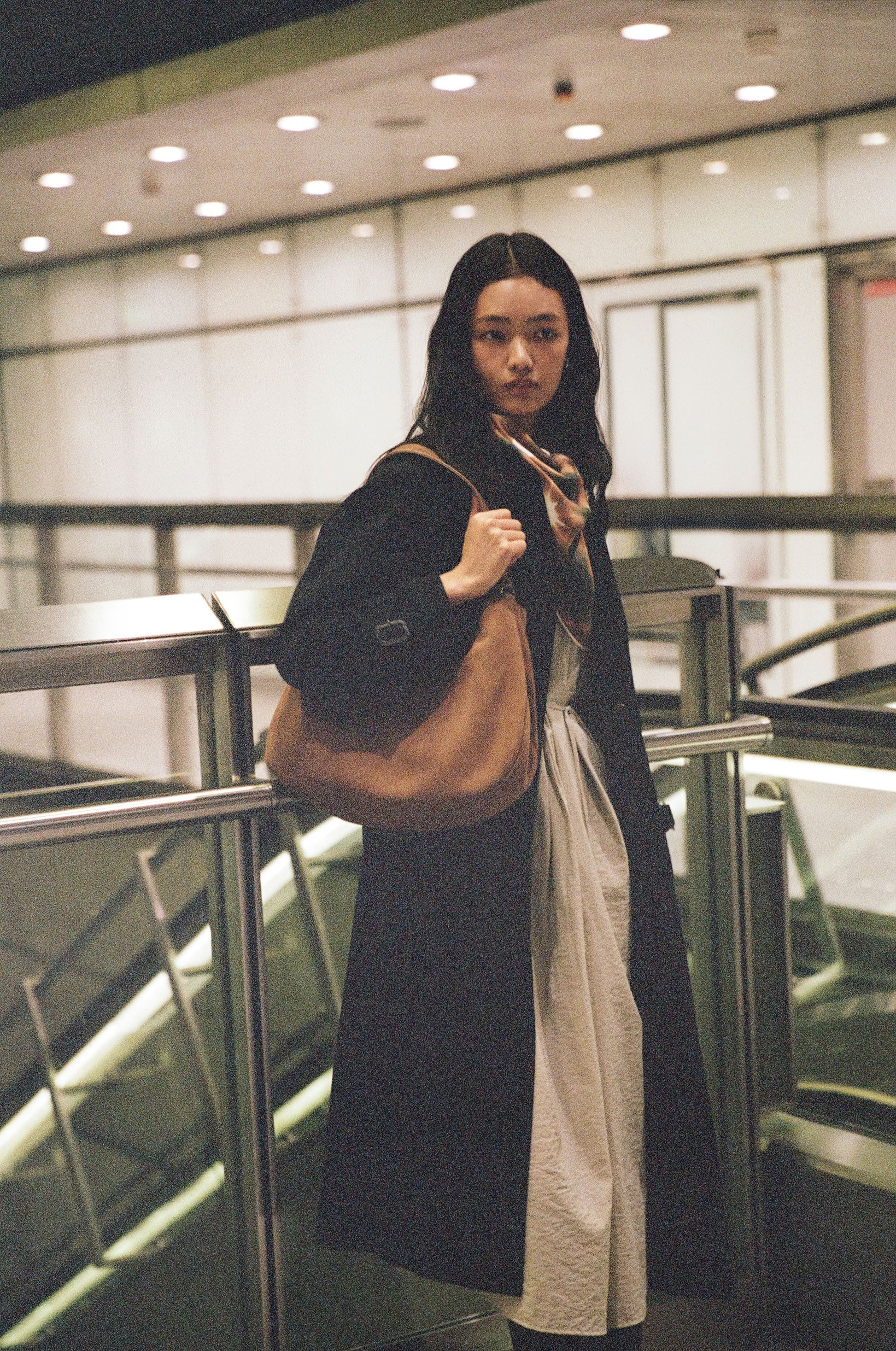 The NACELLE bag, inspired by the French word 'Nacelle' meaning small ship, is a hobo bag made of soft and flexible suede leather. The two-tone goat suede is beautifully soft, molding naturally to the shape of the items it carries. The double-layered strap provides a comfortable fit. At one end of the strap, a ring decoration with a engraved logo is used. The interior is divided into two compartments, and a zipper is attached to the center panel for storage. The nacelle bag, with its simple shape accented by buckle decorations and incisions, is lightweight and complements any outfit in any season.