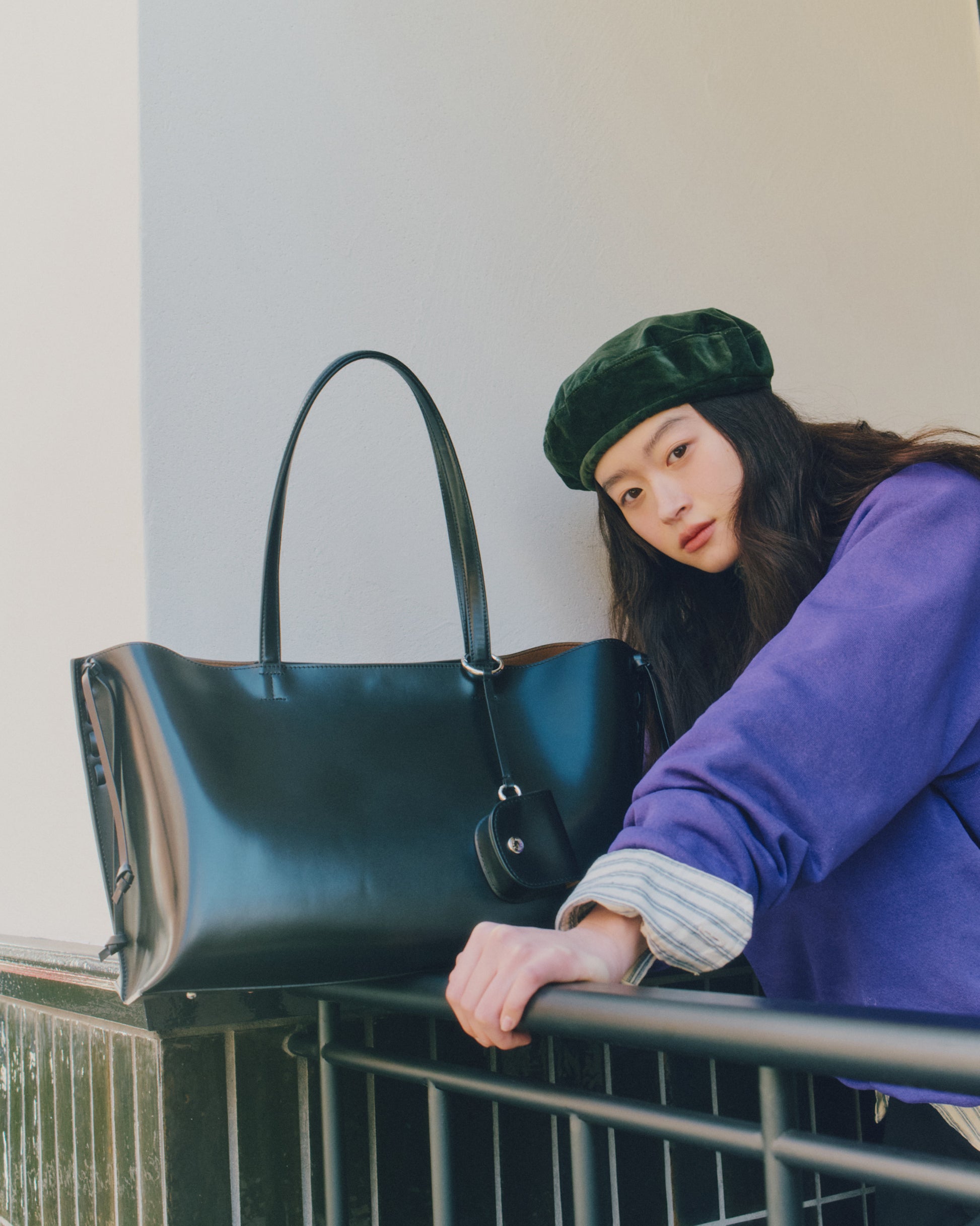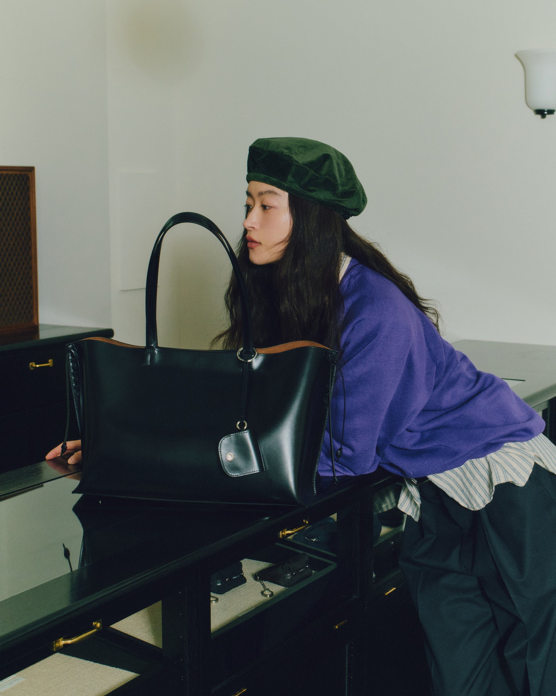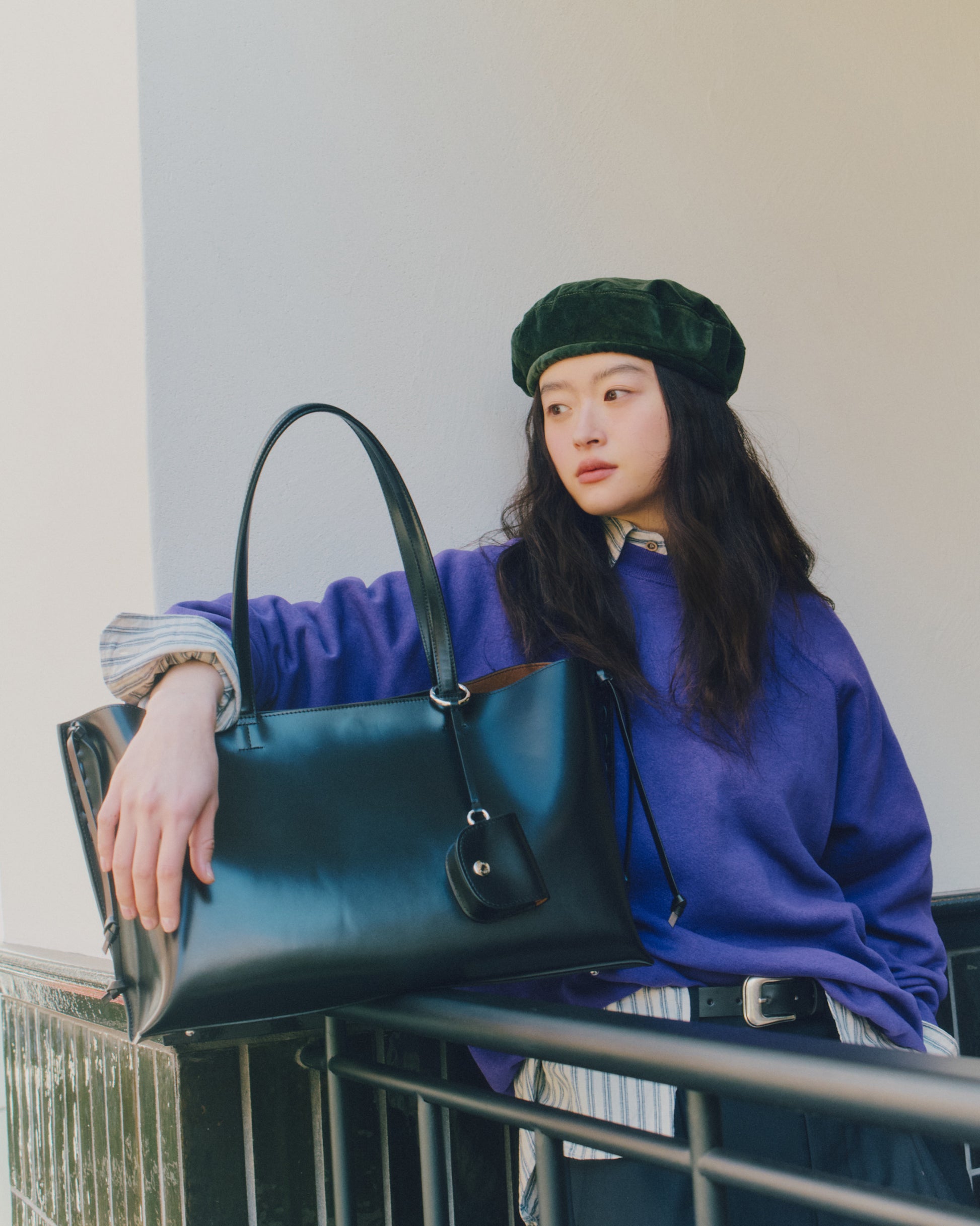The Tressé Bag is a shopper crafted from smooth cow leather with a subtle sheen that highlights its natural texture. Leather cords run along both sides, adding stitched detailing and forming delicate knots that fall gracefully to create the bag’s signature silhouette. A small leather pouch is included, sized to hold essentials such as AirPods, and can be hung naturally on the strap as an accent. The lining is made from a warm brown fabric that reveals a soft contrast when worn, and an additional leather pocket inside offers convenient storage.