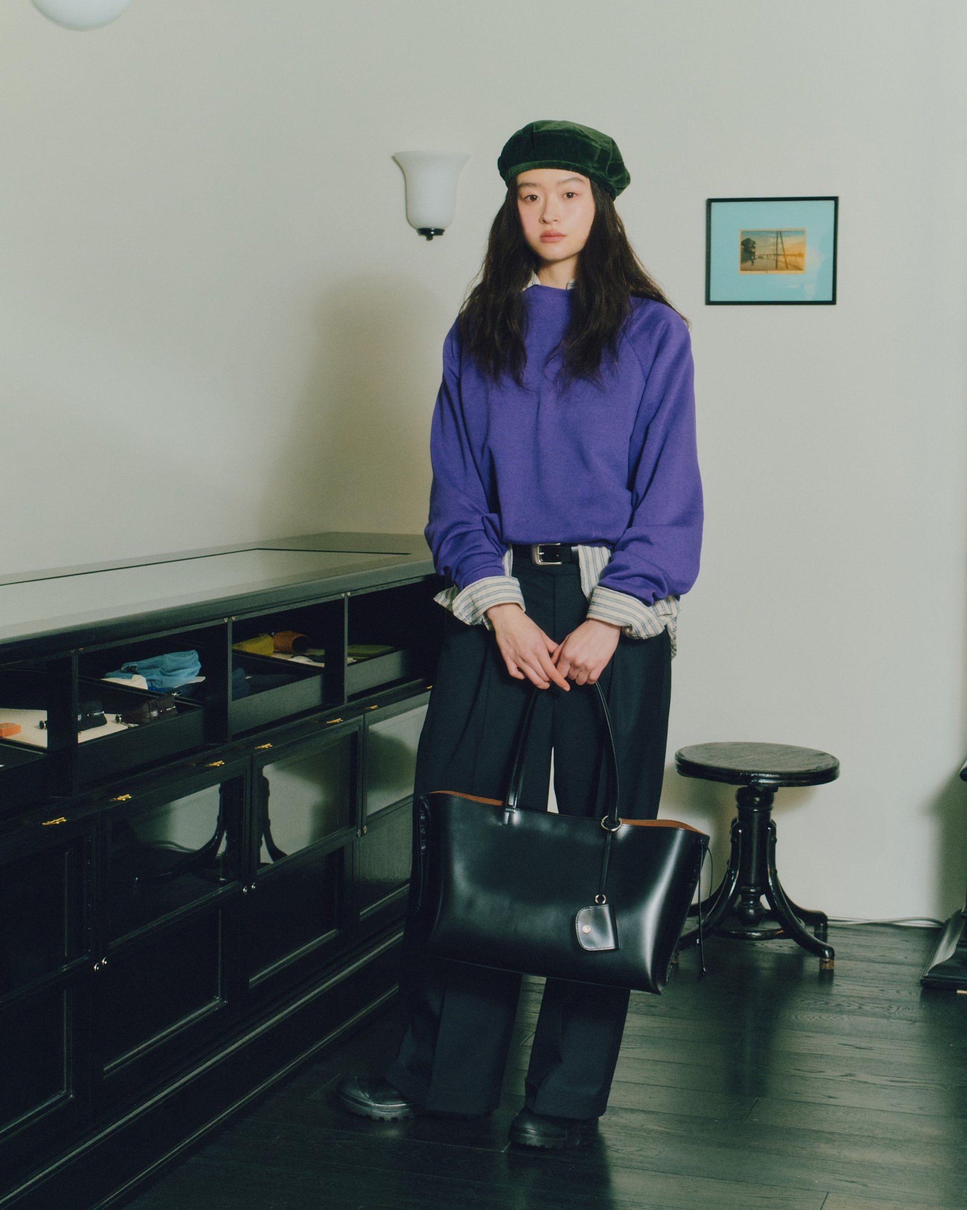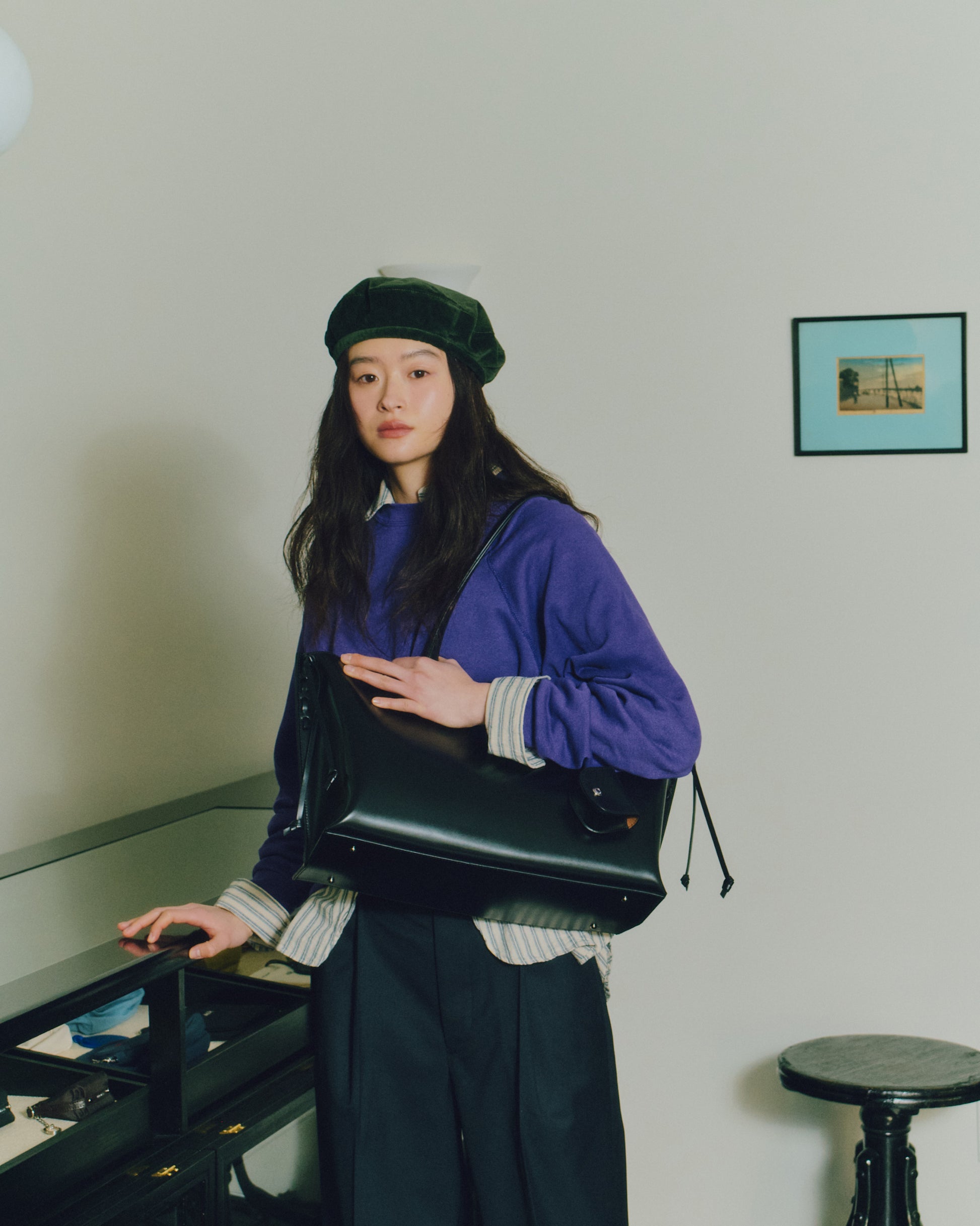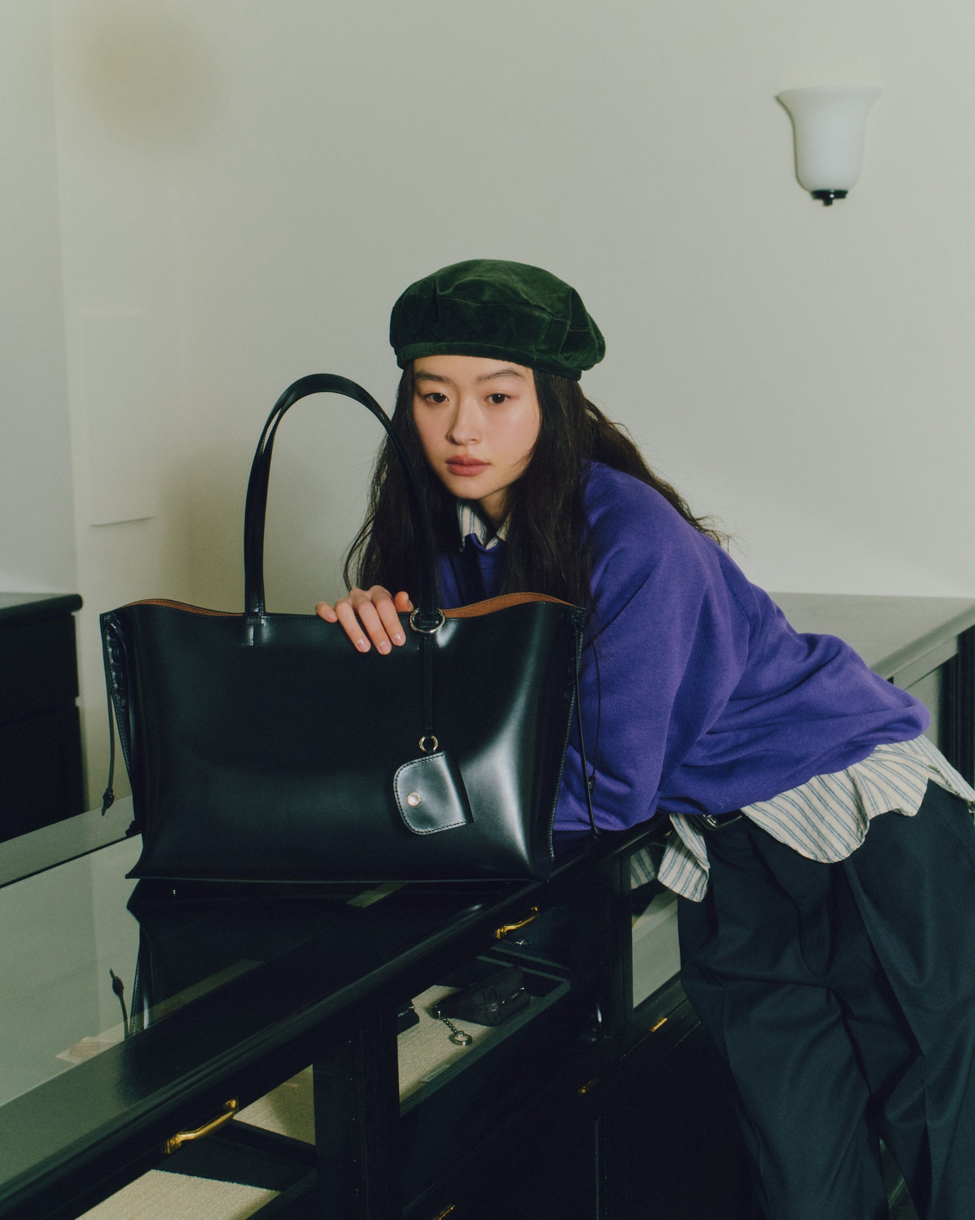 The Tressé Bag is a shopper crafted from smooth cow leather with a subtle sheen that highlights its natural texture. Leather cords run along both sides, adding stitched detailing and forming delicate knots that fall gracefully to create the bag’s signature silhouette. A small leather pouch is included, sized to hold essentials such as AirPods, and can be hung naturally on the strap as an accent. The lining is made from a warm brown fabric that reveals a soft contrast when worn, and an additional leather pocket inside offers convenient storage.
