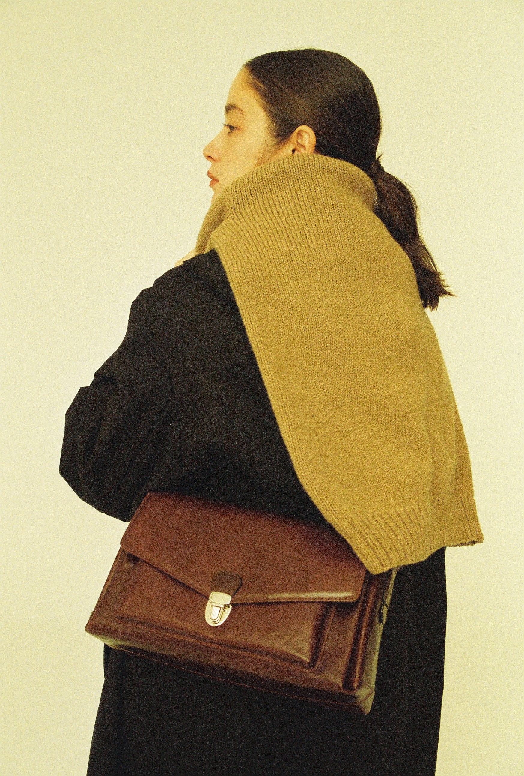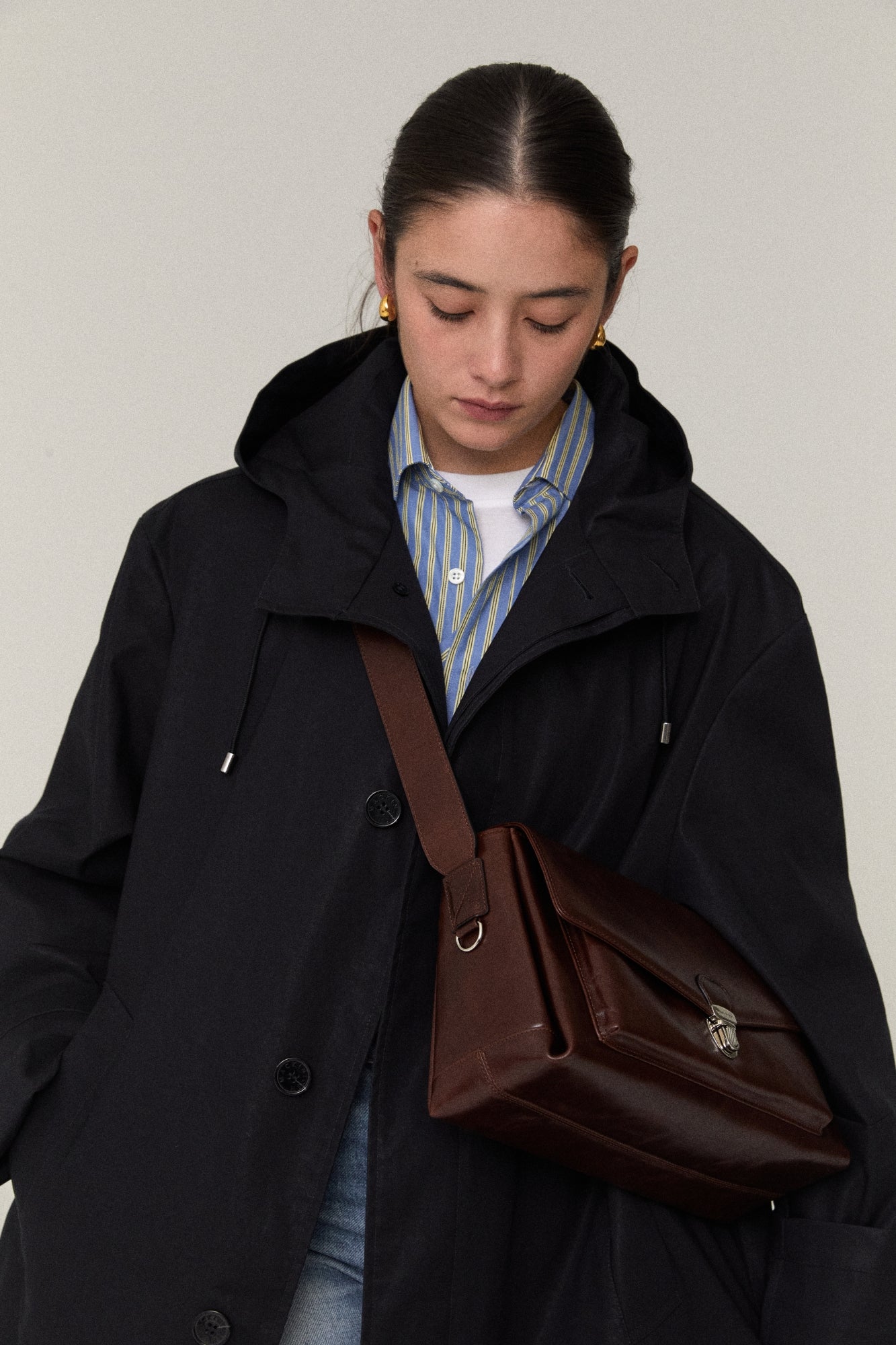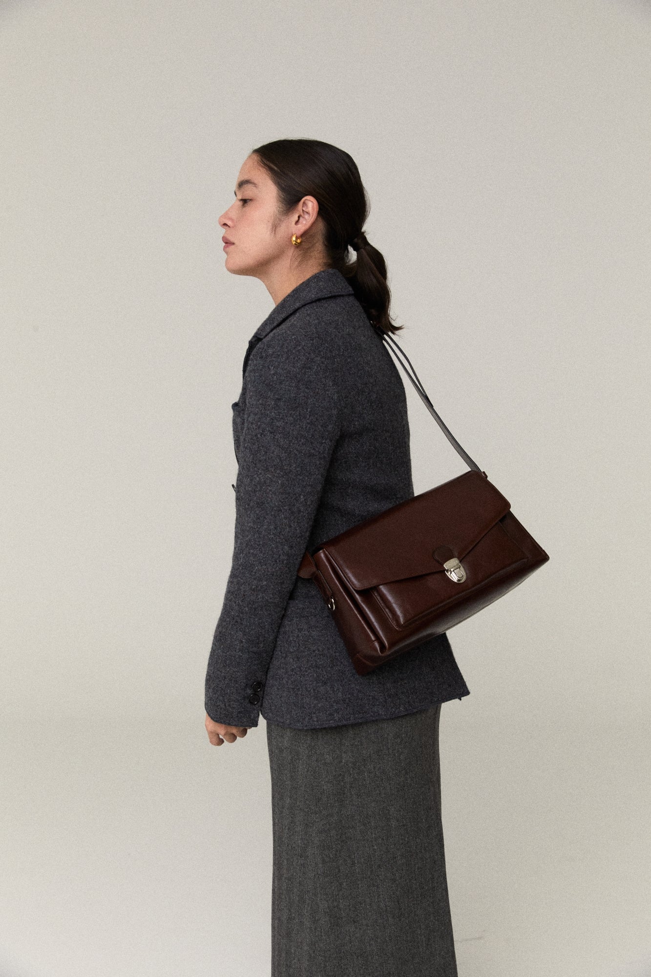 The VOLET bag has a casual trapezoidal shape adorned with TOUT Y EST's signature lock decorations, creating a timeless appeal. Crafted from oil-finished leather with a subtle sheen, the material gains a soft feel through a tumble washing process, displaying natural wrinkles. The two-tone color ages beautifully with use. With a convenient front outside pocket for frequently used items and a widening structure towards the bottom, the VOLET bag offers excellent storage capacity. The freely adjustable strap ensures versatile styling, allowing it to effortlessly complement any outfit, whether worn over the shoulder or crossbody.