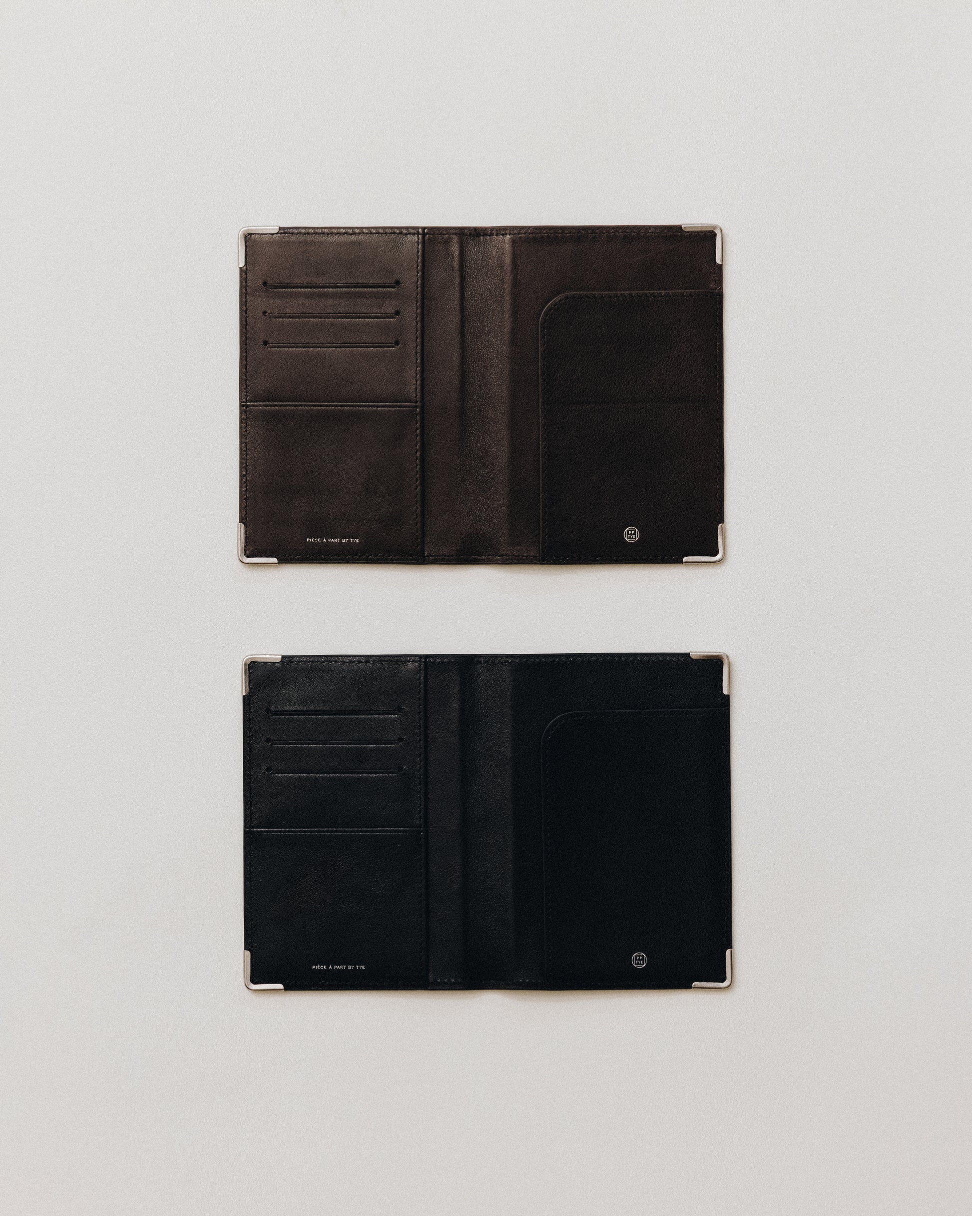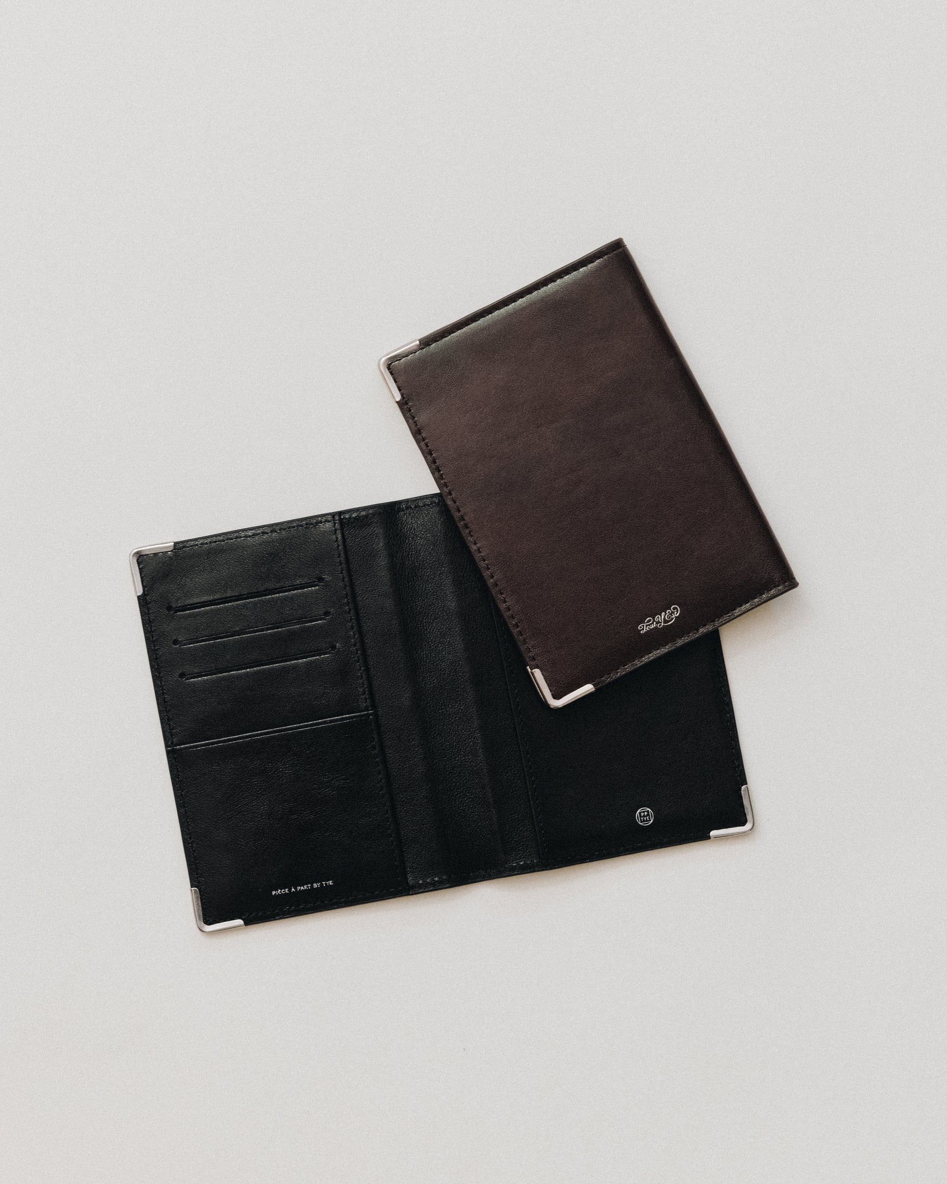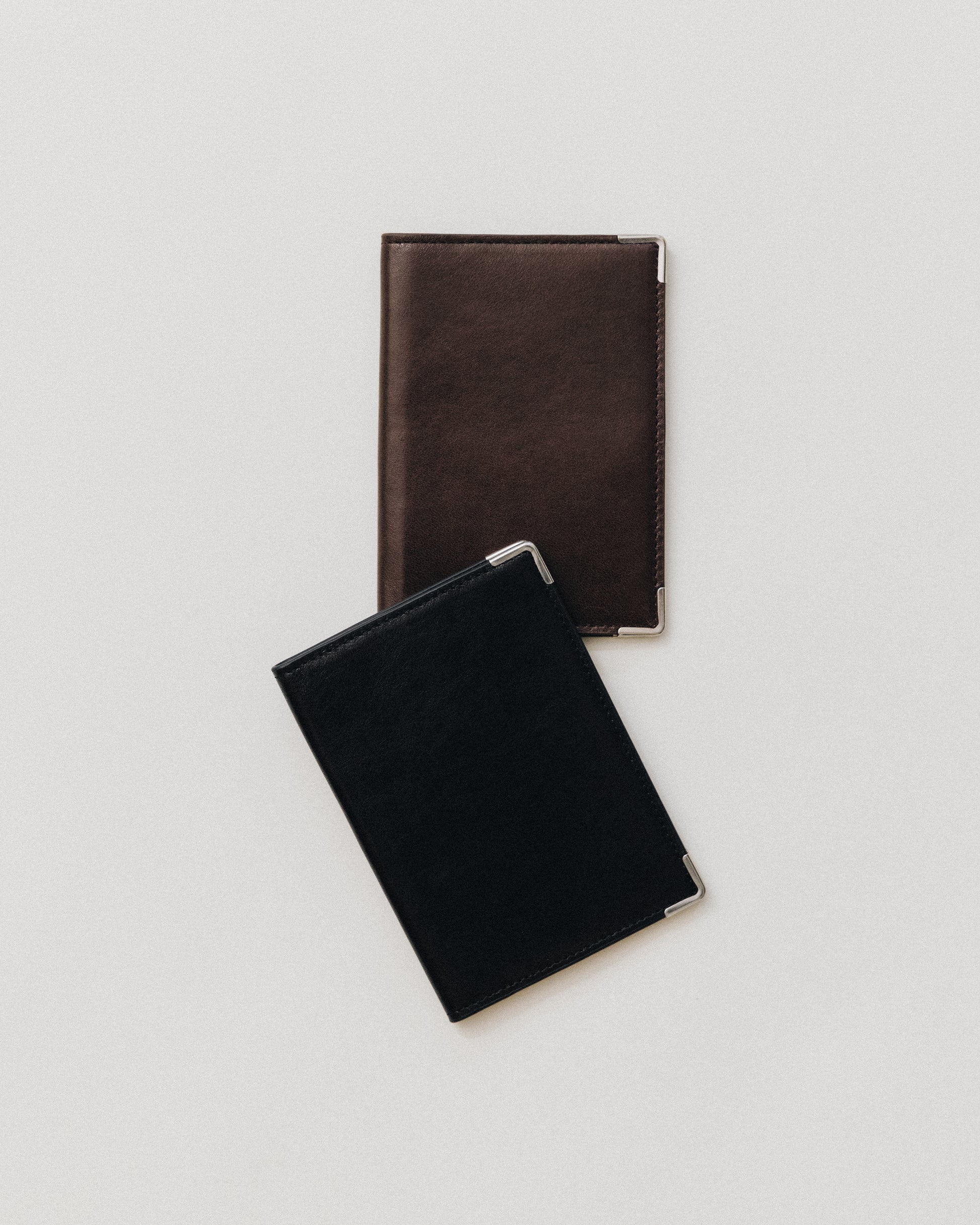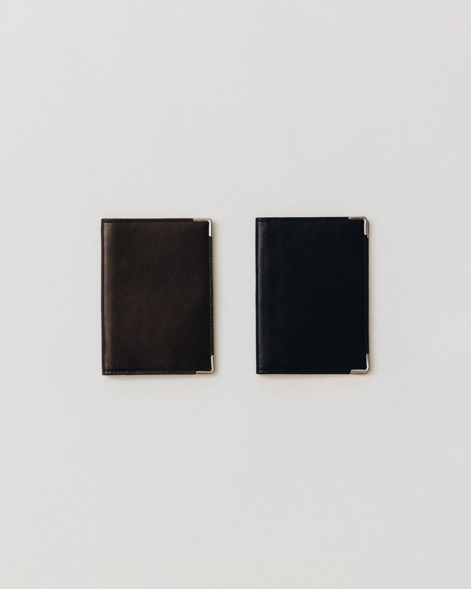 A passport cover with a slim silhouette accented by metal corners. Soft lambskin leather securely wraps your passport, while the corner hardware reduces wear and adds a subtle detail. The left side features three card slots and one auxiliary pocket, and the right side has a passport slot, allowing you to neatly organize passports, cards, and bills during travel. The front is neatly finished with corner accents, and the interior and back feature a foil-stamped logo. The subtly glossy lambskin leather has natural wrinkles and a soft touch, and it develops depth and character over time, enhancing its unique texture.